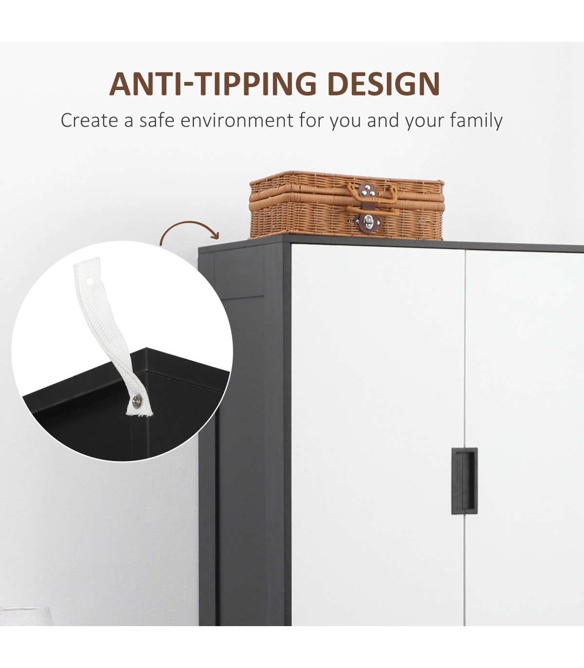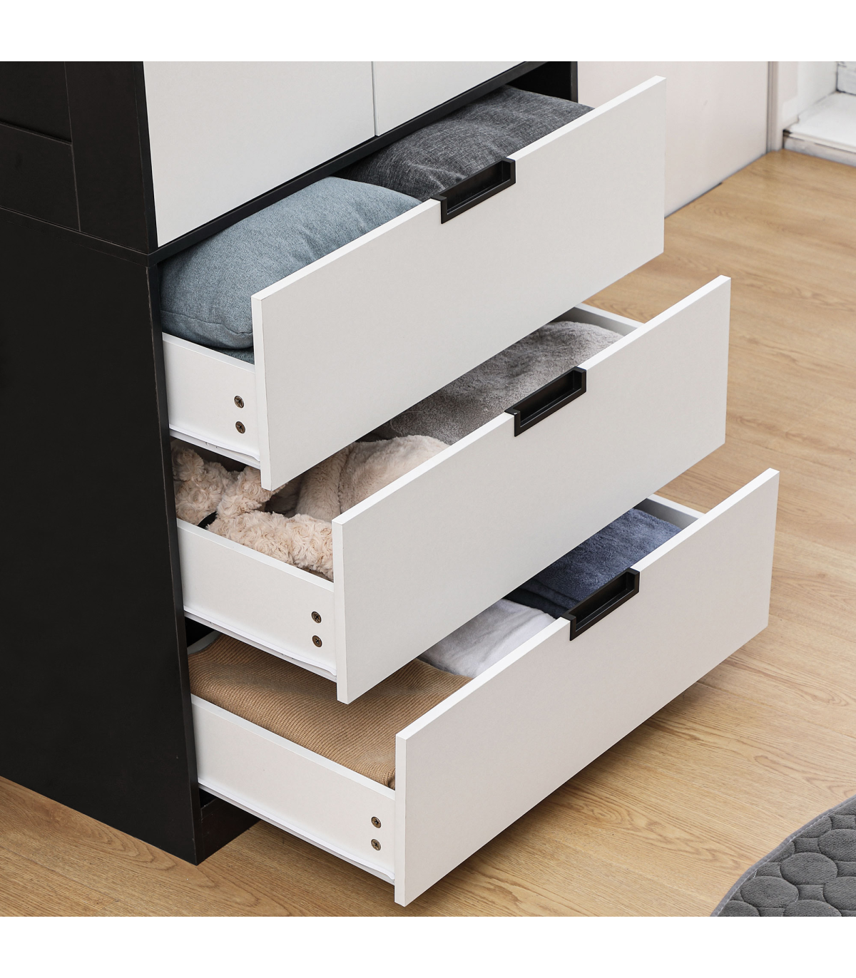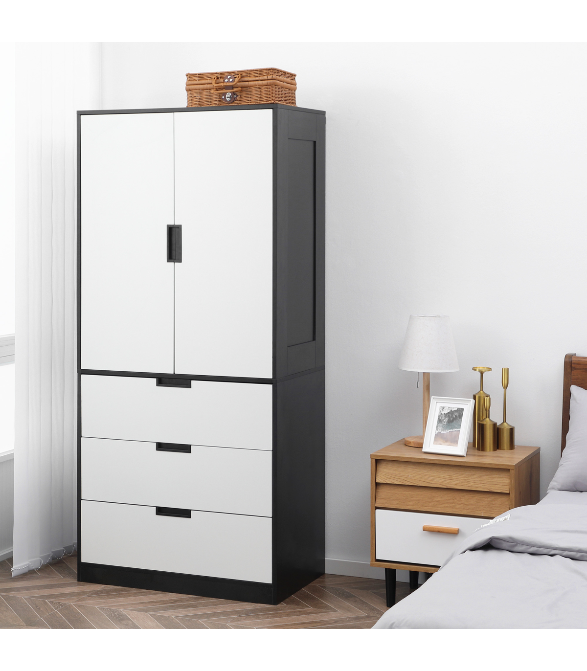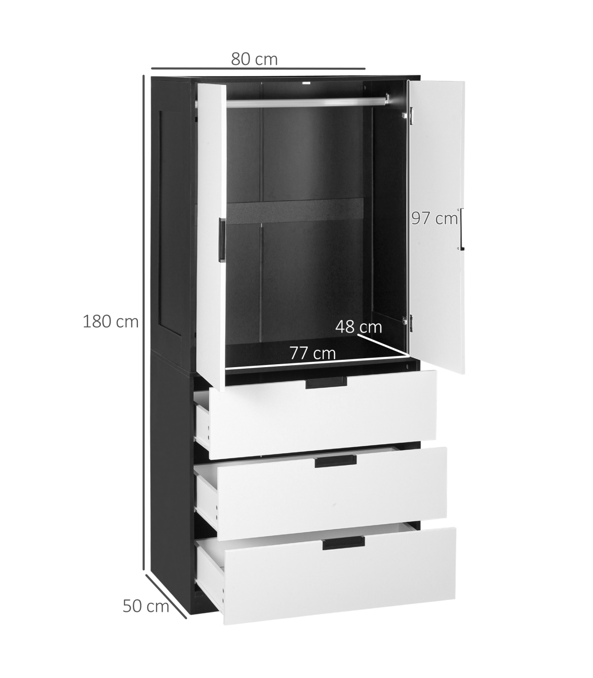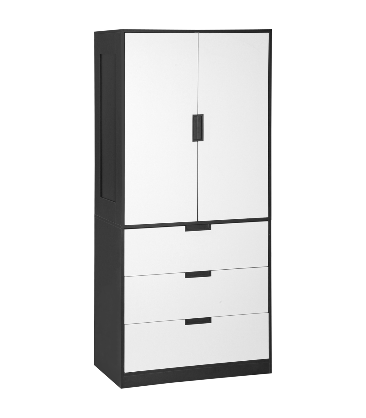 Duo design: A two door wardrobe which has three drawers beneath. Room for hanging clothes and keeping folded ones stored.Monochrome design: A white wardrobe with black accents - this double wardrobe is contemporary, with a touch of impact.Sturdy: Made from particle board, this is a clothes wardrobe which is suitable for everyday use. Inwards handles to open/close the doors and drawers easily.Anti-tipping straps: Attach this tall wardrobe to a wall, won't fall forwards for safety.Dimensions: 180H x 80W x 50Dcm. Maximum load: Rail - 10kg. Drawer - 5kg. Assembly required.