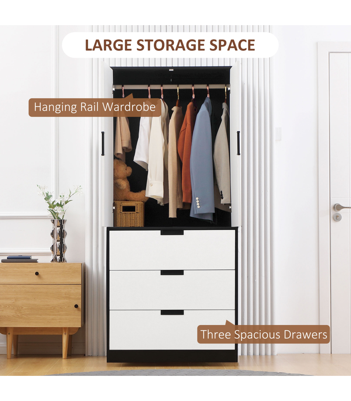 Not just a white wardrobe with drawers, this HOMCOM white wardrobe with drawers adds a dash of character with its black accents. The double size offers plenty of room for hanging clothes, with three drawers for folded garments. Made from particle board, it is durable and sturdy - great for everyday use.