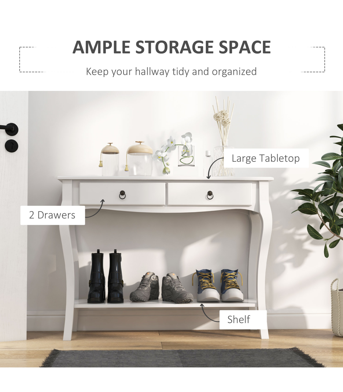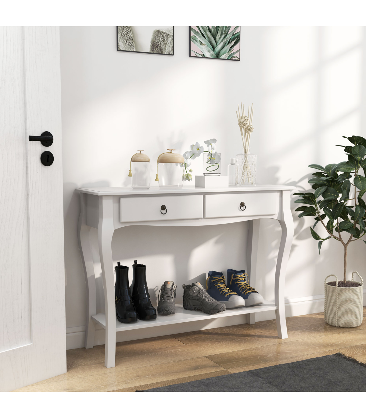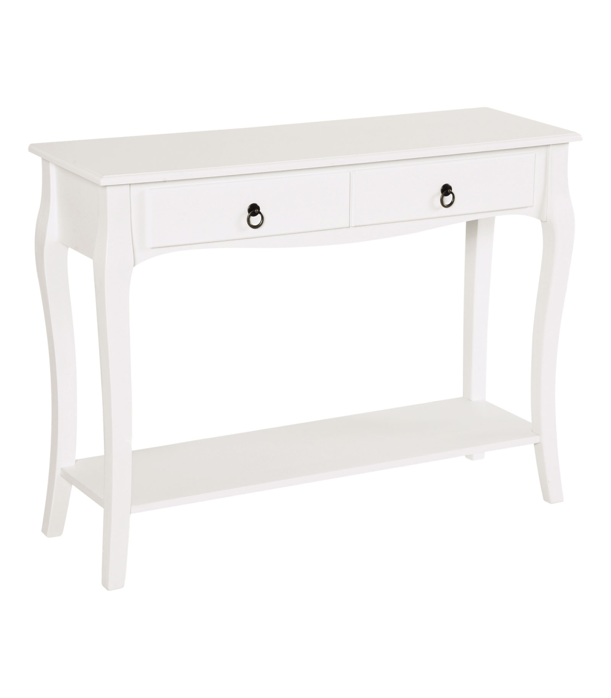 Wide table top, 2 drawers and 1 lower shelf offer spacious storage and display