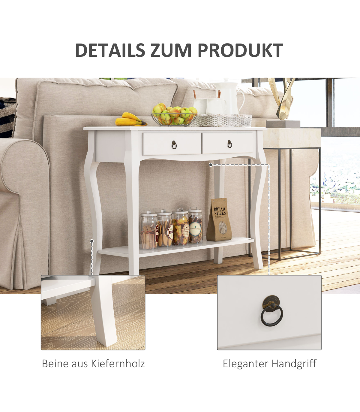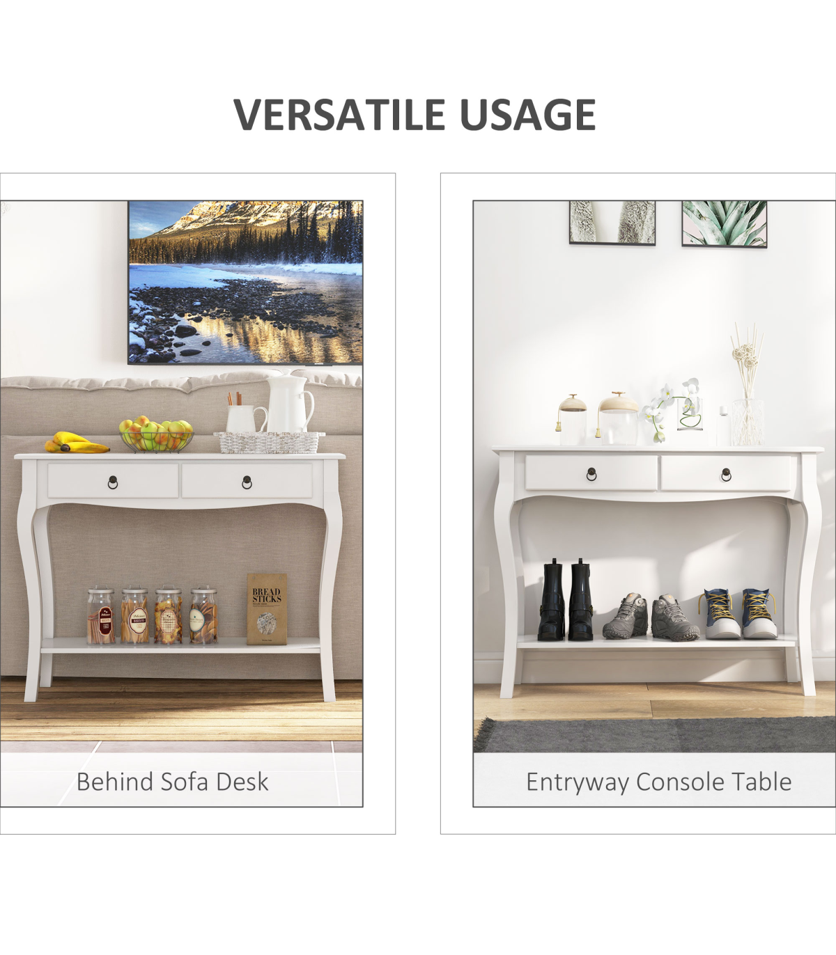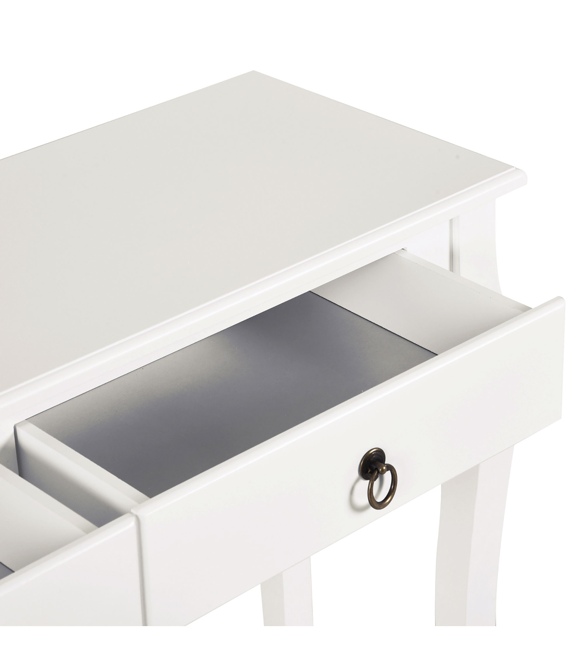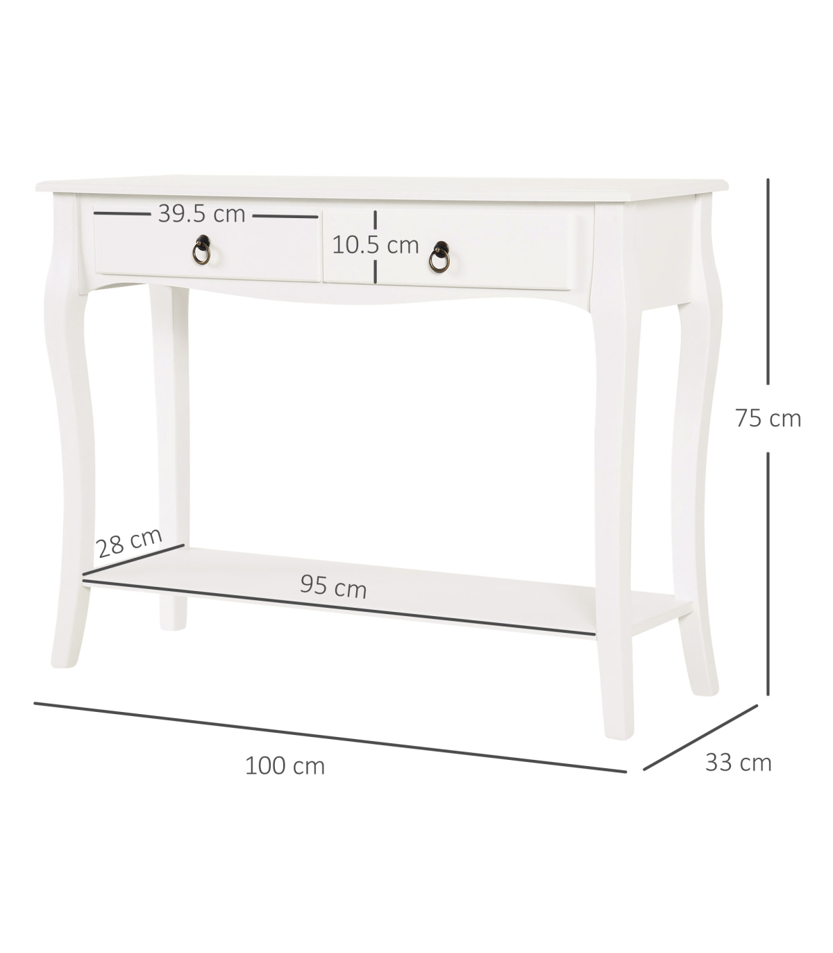 Wide table top, 2 drawers and 1 lower shelf offer spacious storage and display