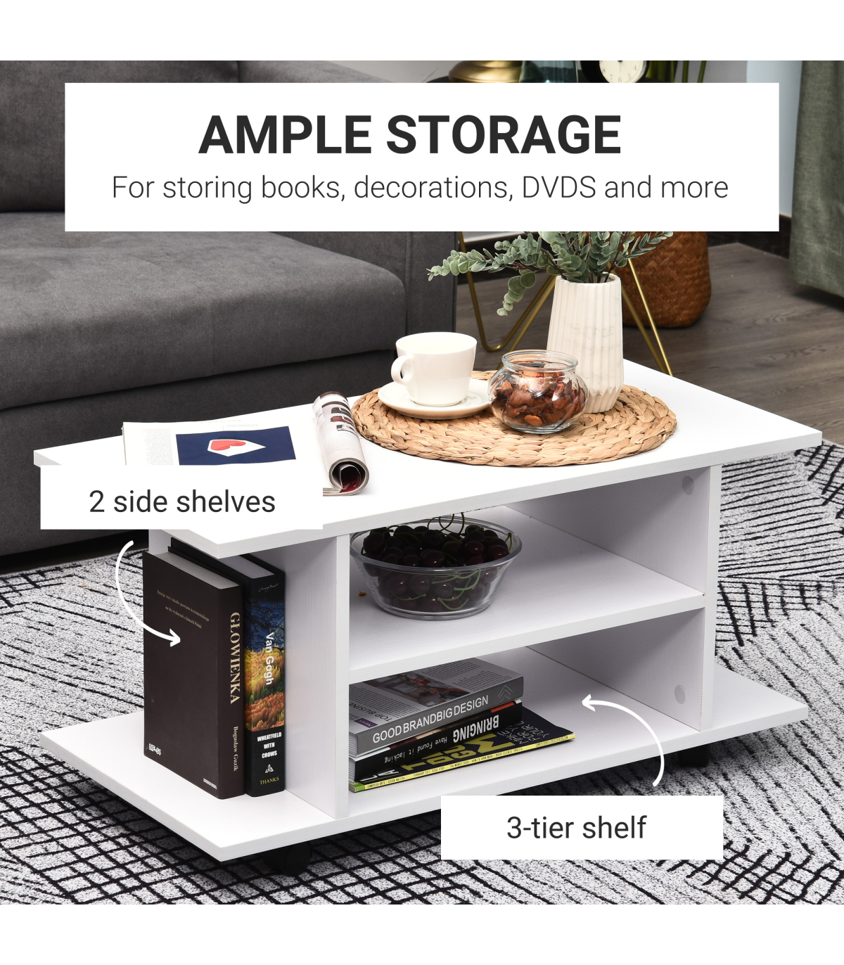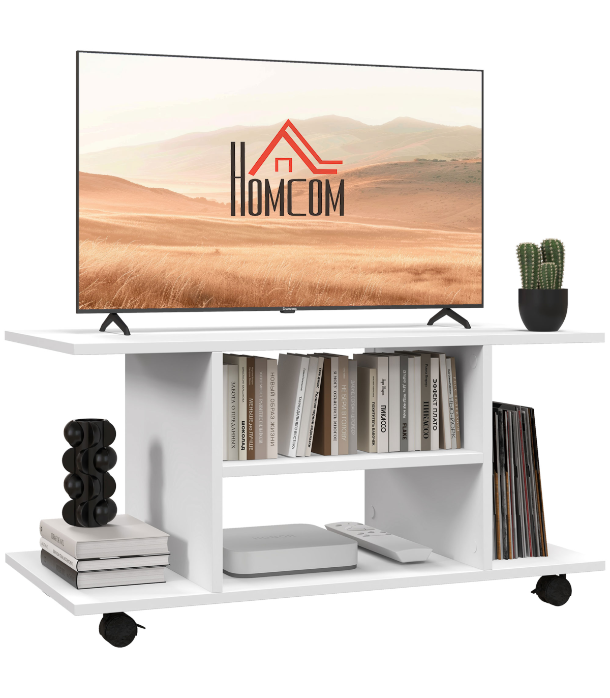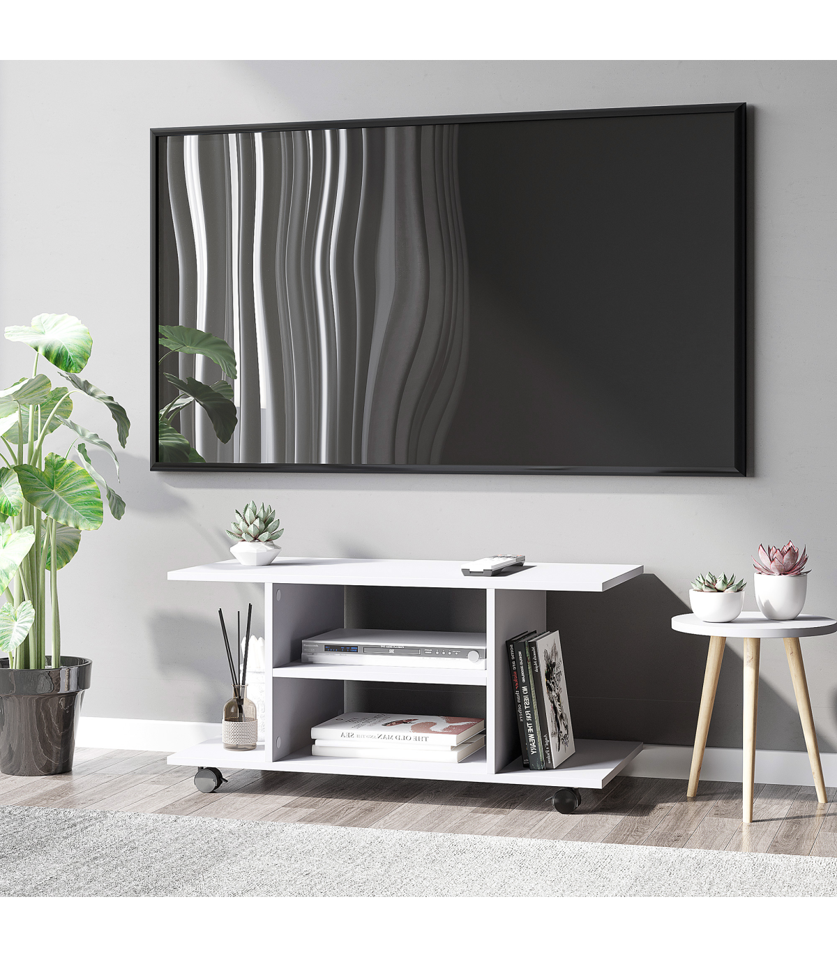 - "TV Stand Bookshelf Cabinet Modern 3 Tier Shelf Storage Wheels in White" - Description: - Elegant modern design - Solid and well-built furniture with fantastic quality and value - Ideal as a TV stand, side table, or storage shelf - 3-tier shelf for storing stuff - Four 360° castor wheels for easy movement - Wheels have brakes to keep the table static - Made of high-quality particle board with a matt finish effect carcass - Carcass made from melamine, water, and scratch resistant - Easy to clean and stain resistant - Comes flat-packed with a detailed manual