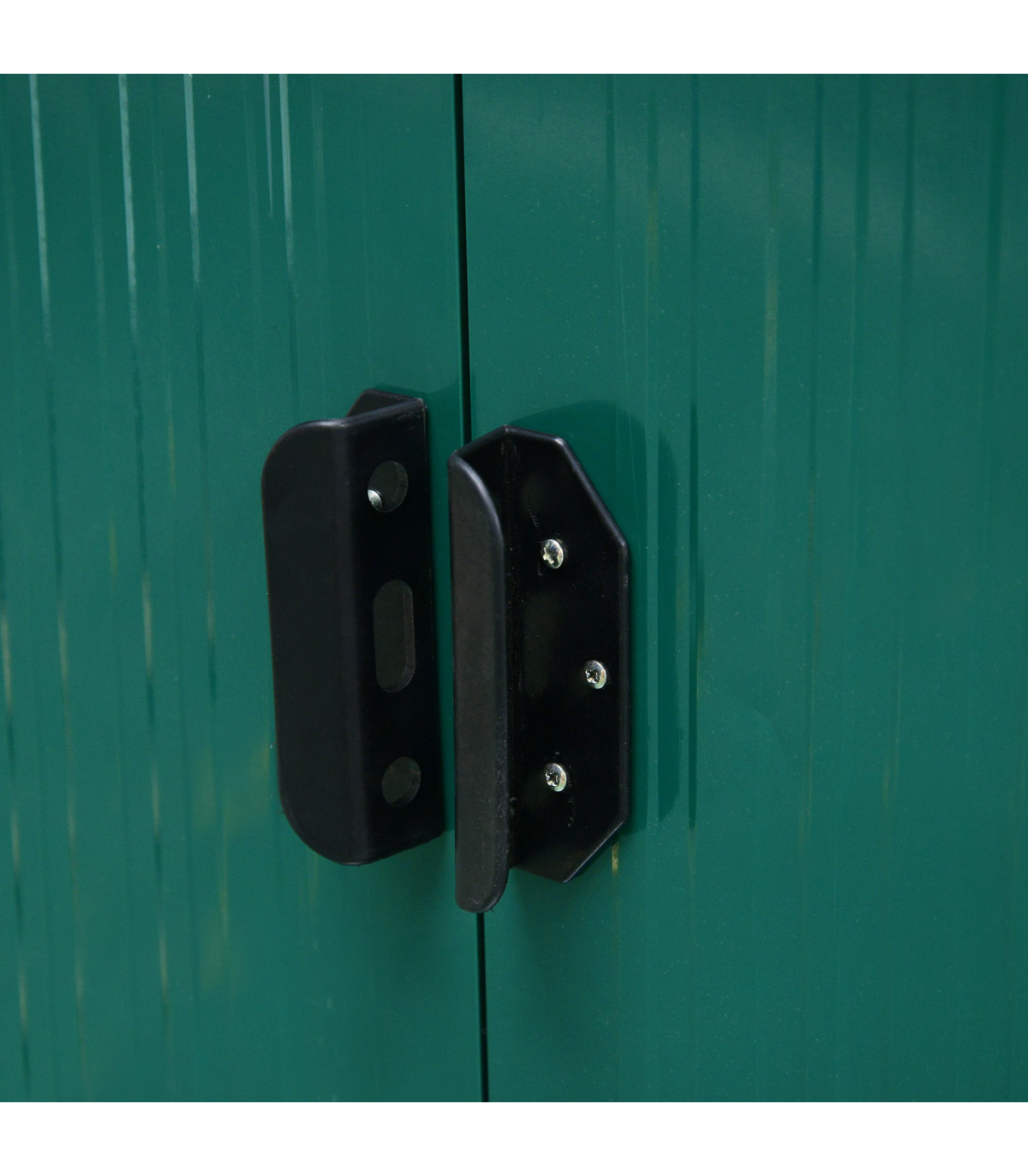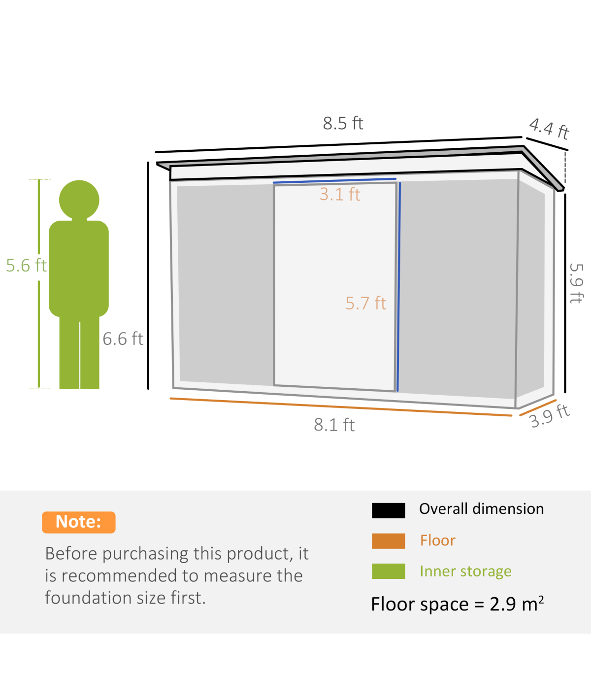 Serve as a tool shed, a bicycle shed, a mobility scooter shed, or a garden bin storage Four inner vents of the small shed for air circulation, helping keep mould to a minimum Sloped roof, with grommet holes, prevents rainwater building up 4.4ft x 8.5ft, freestanding design - stand it anywhere you want. Recommended to place against wall Corrugated steel for a strong, outdoor-suitable structure Two sliding doors, with a lock, to enter and leave easily Assembly required