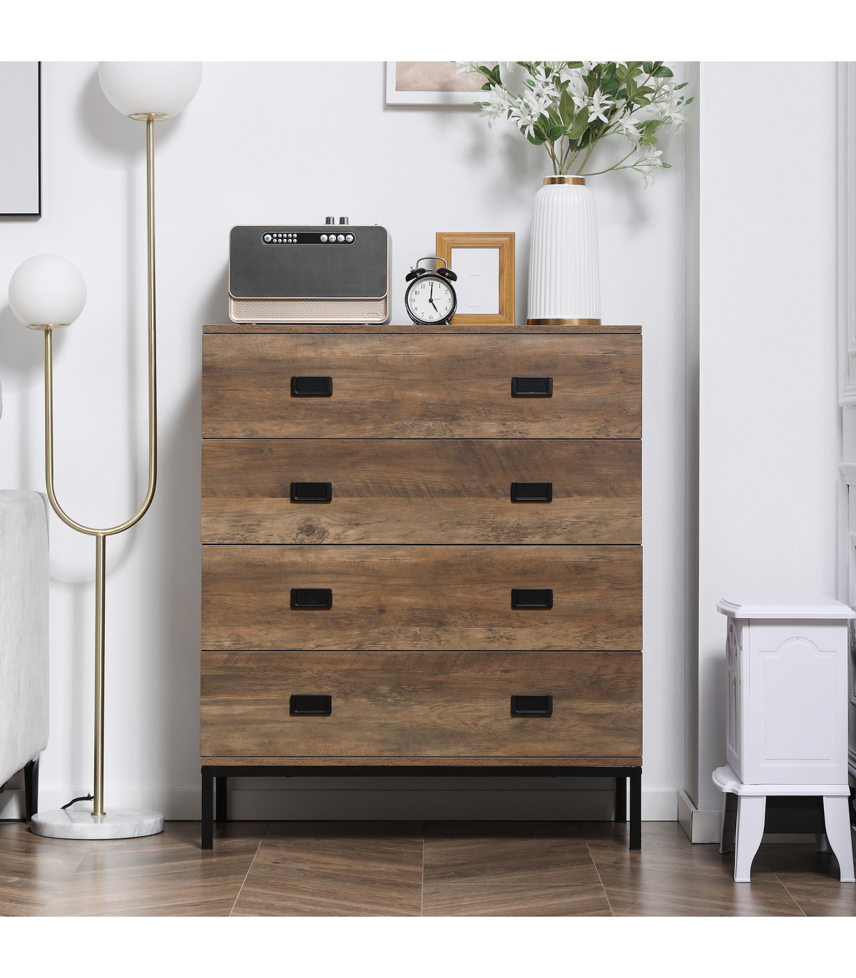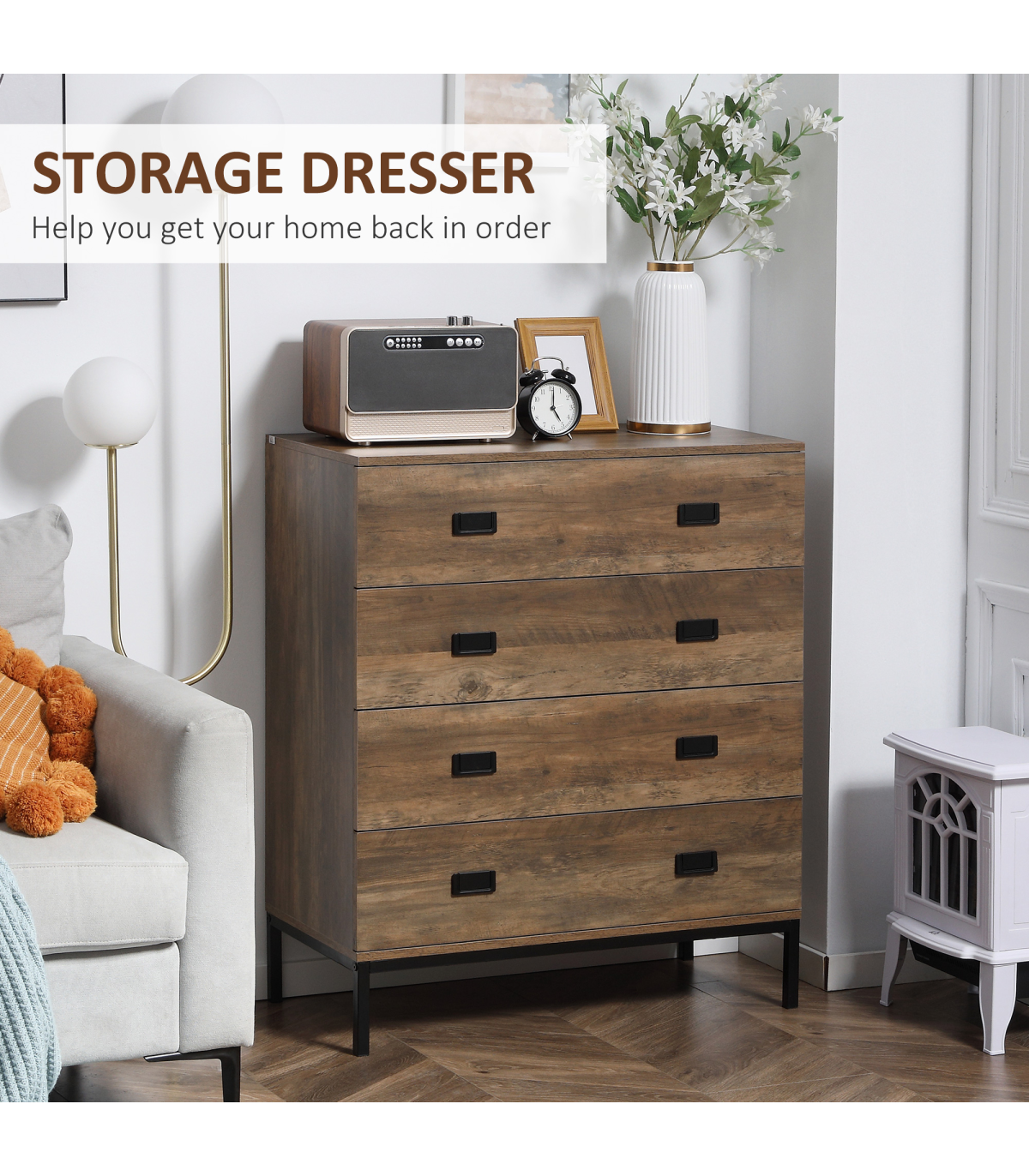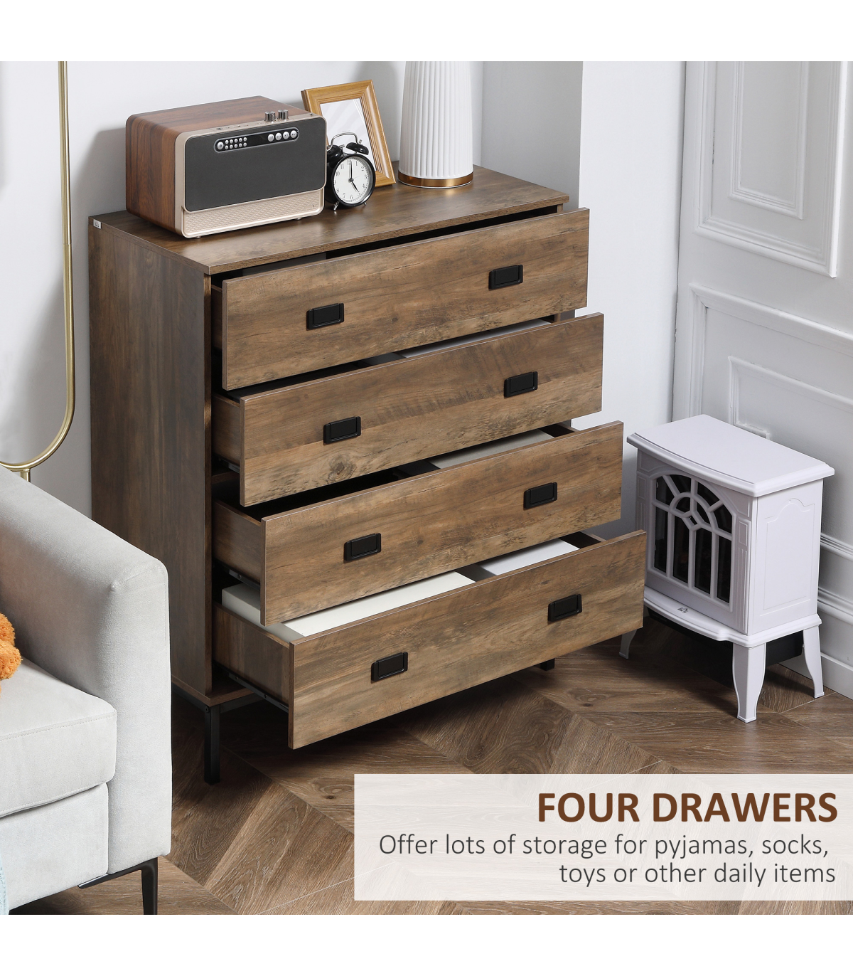 Classic rustic dresser: Chest of drawers are finished in faded wood-effect look. Easy to match with current furniture. A beautiful addition to your bedroom, hallway, living room and office.Four storage drawers: Plenty of room for your clothing - think tops, tees, trousers, underwear and more. Flat top for extra holding and display room.Durable structure: Upper half of this drawer unit is made from particle board. A metal base supports the upper, with a spacious clearance to clean underneath easily, or place extra boxes underneath these bedroom drawers.Anti-tipping straps: Attach this drawer chest to the wall so it doesn't tip forwards. Safe around children and pets.Dimensions: 95H x 80W x 39Dcm. Drawer inner: 10H x 72W x 33.7Dcm. Maximum load 30kg. Assembly required.