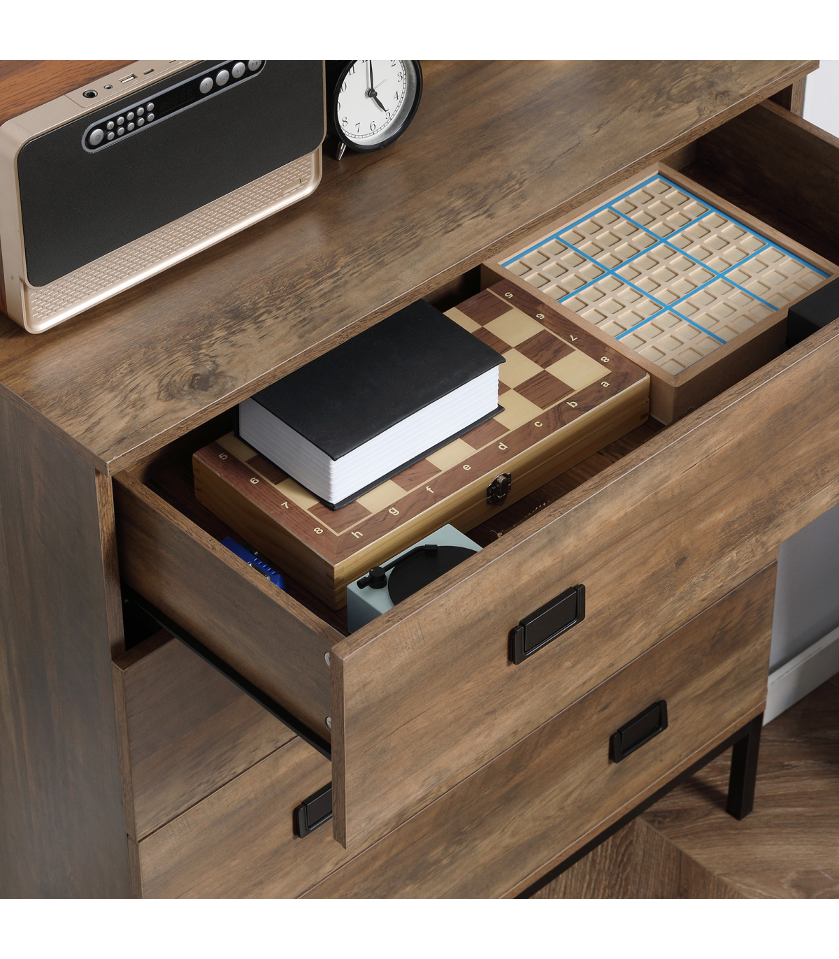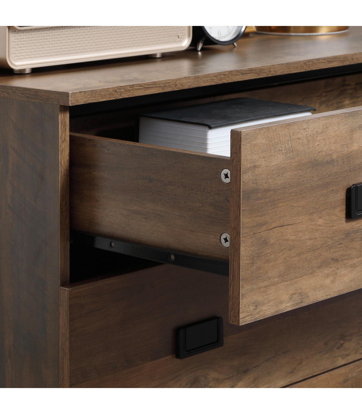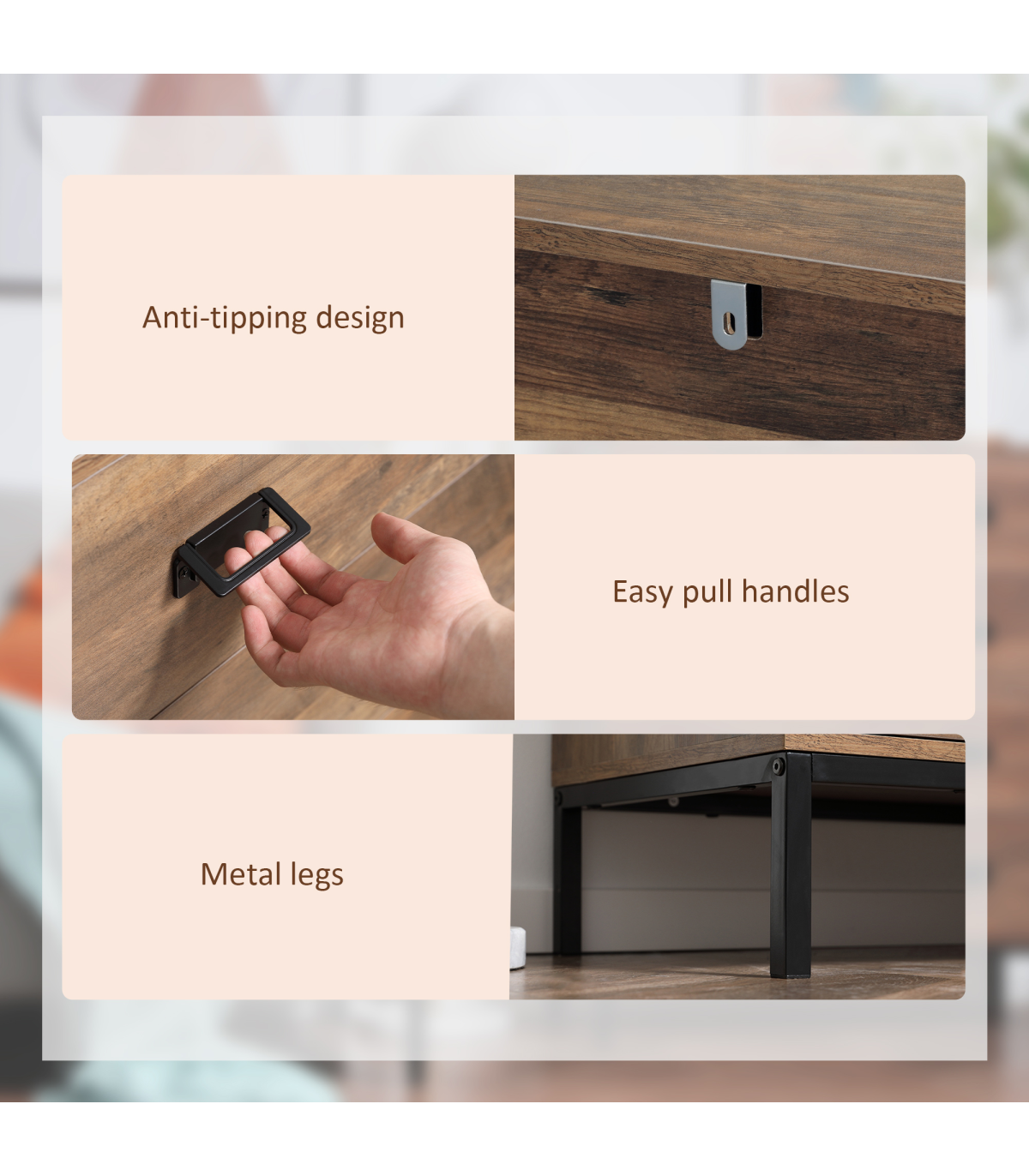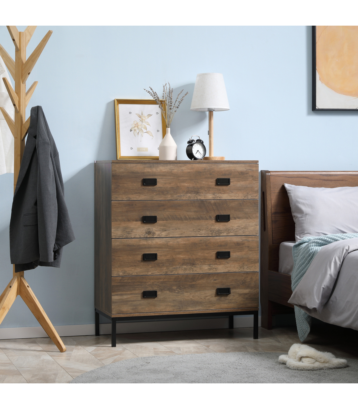 Classic rustic dresser: Chest of drawers are finished in faded wood-effect look. Easy to match with current furniture. A beautiful addition to your bedroom, hallway, living room and office.Four storage drawers: Plenty of room for your clothing - think tops, tees, trousers, underwear and more. Flat top for extra holding and display room.Durable structure: Upper half of this drawer unit is made from particle board. A metal base supports the upper, with a spacious clearance to clean underneath easily, or place extra boxes underneath these bedroom drawers.Anti-tipping straps: Attach this drawer chest to the wall so it doesn't tip forwards. Safe around children and pets.Dimensions: 95H x 80W x 39Dcm. Drawer inner: 10H x 72W x 33.7Dcm. Maximum load 30kg. Assembly required.