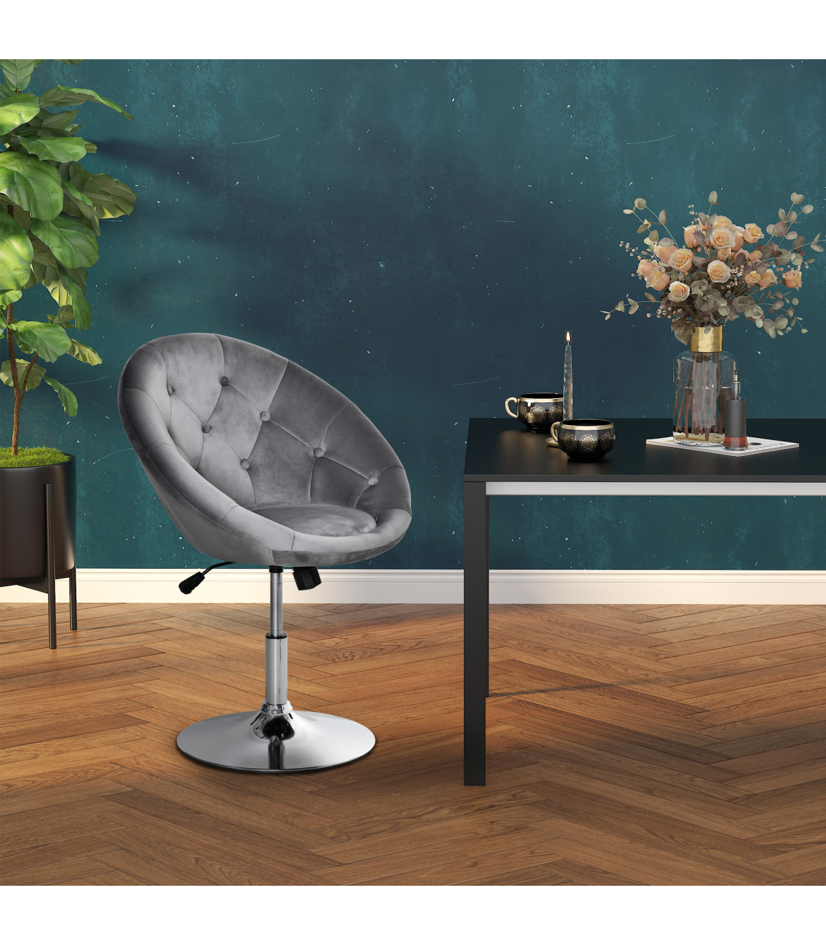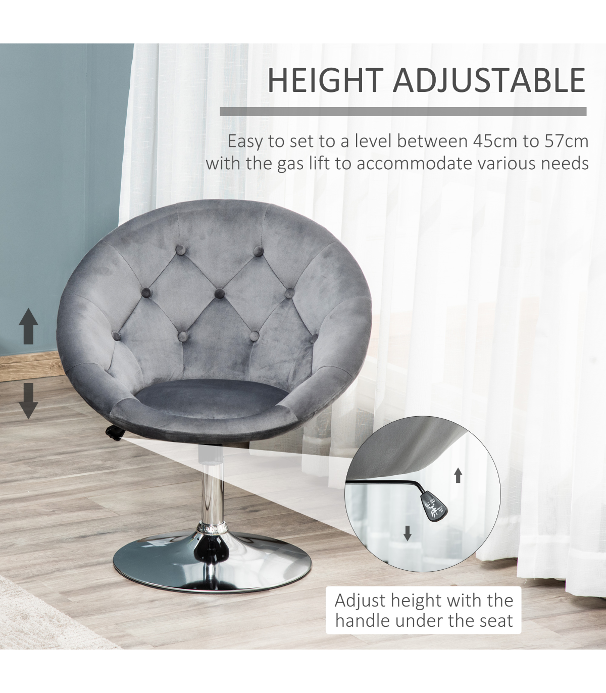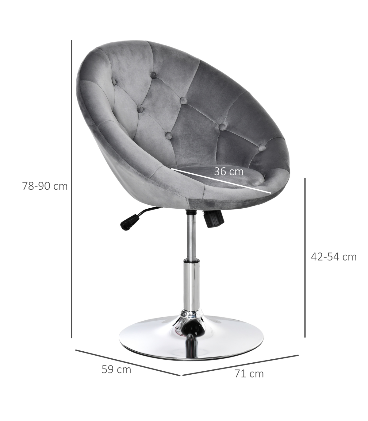 - "Swivel Dining Height Bar Stool Adjustable Armless Tub Chair Grey" - Description: "RETRO LOOK: Large round shape with button tufting on the back in a diamond formation. This barstool adds an interesting touch to your home and dining areas. - 42-54CM ADJUSTABLE HEIGHT: Easily adjust this breakfast bar stool to your preferred position, perfect for matching different levels such as countertops and higher surfaces. - METAL FRAME: This kitchen stool with back has a strong core structure and a large base to ensure balance. It also features a pad on the bottom to protect the floor. - DIMENSIONS: Overall: 78-90H x 71W x 59Dcm. Seat: 42-54H x 36Wcm. Base: 45cm. - MAXIMUM LOAD 120KG. ASSEMBLY REQUIRED.