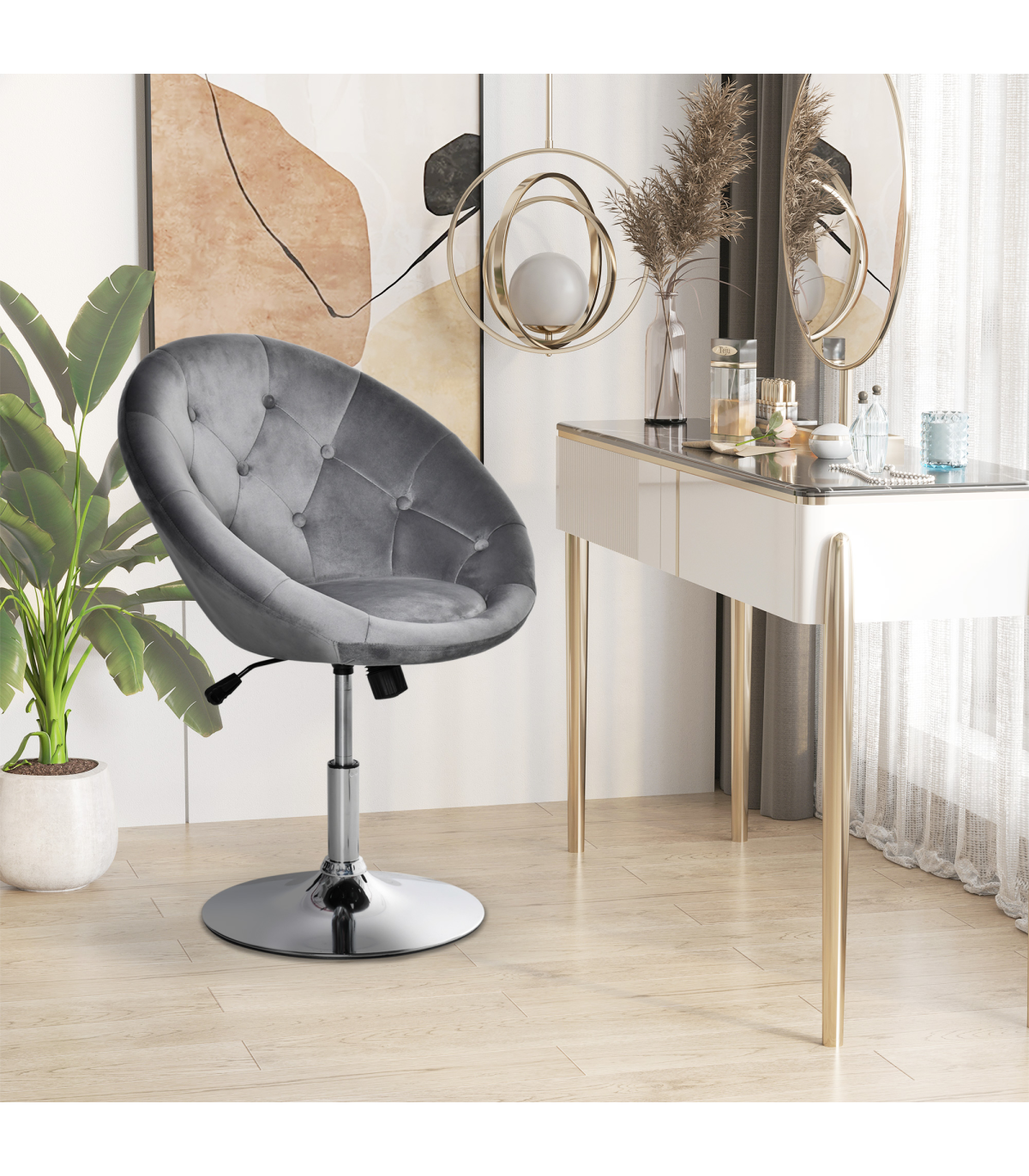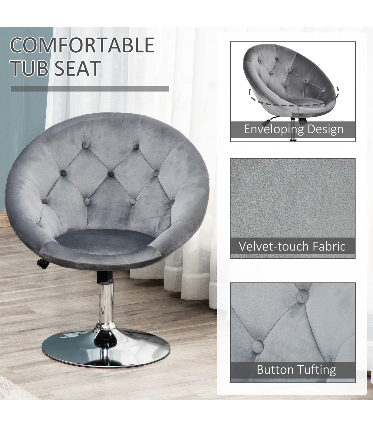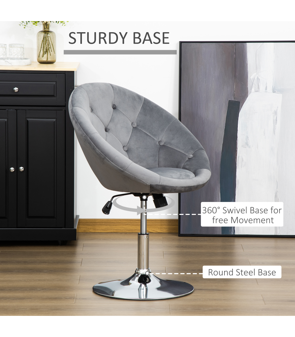 - "Swivel Dining Height Bar Stool Adjustable Armless Tub Chair Grey" - Description: "RETRO LOOK: Large round shape with button tufting on the back in a diamond formation. This barstool adds an interesting touch to your home and dining areas. - 42-54CM ADJUSTABLE HEIGHT: Easily adjust this breakfast bar stool to your preferred position, perfect for matching different levels such as countertops and higher surfaces. - METAL FRAME: This kitchen stool with back has a strong core structure and a large base to ensure balance. It also features a pad on the bottom to protect the floor. - DIMENSIONS: Overall: 78-90H x 71W x 59Dcm. Seat: 42-54H x 36Wcm. Base: 45cm. - MAXIMUM LOAD 120KG. ASSEMBLY REQUIRED.