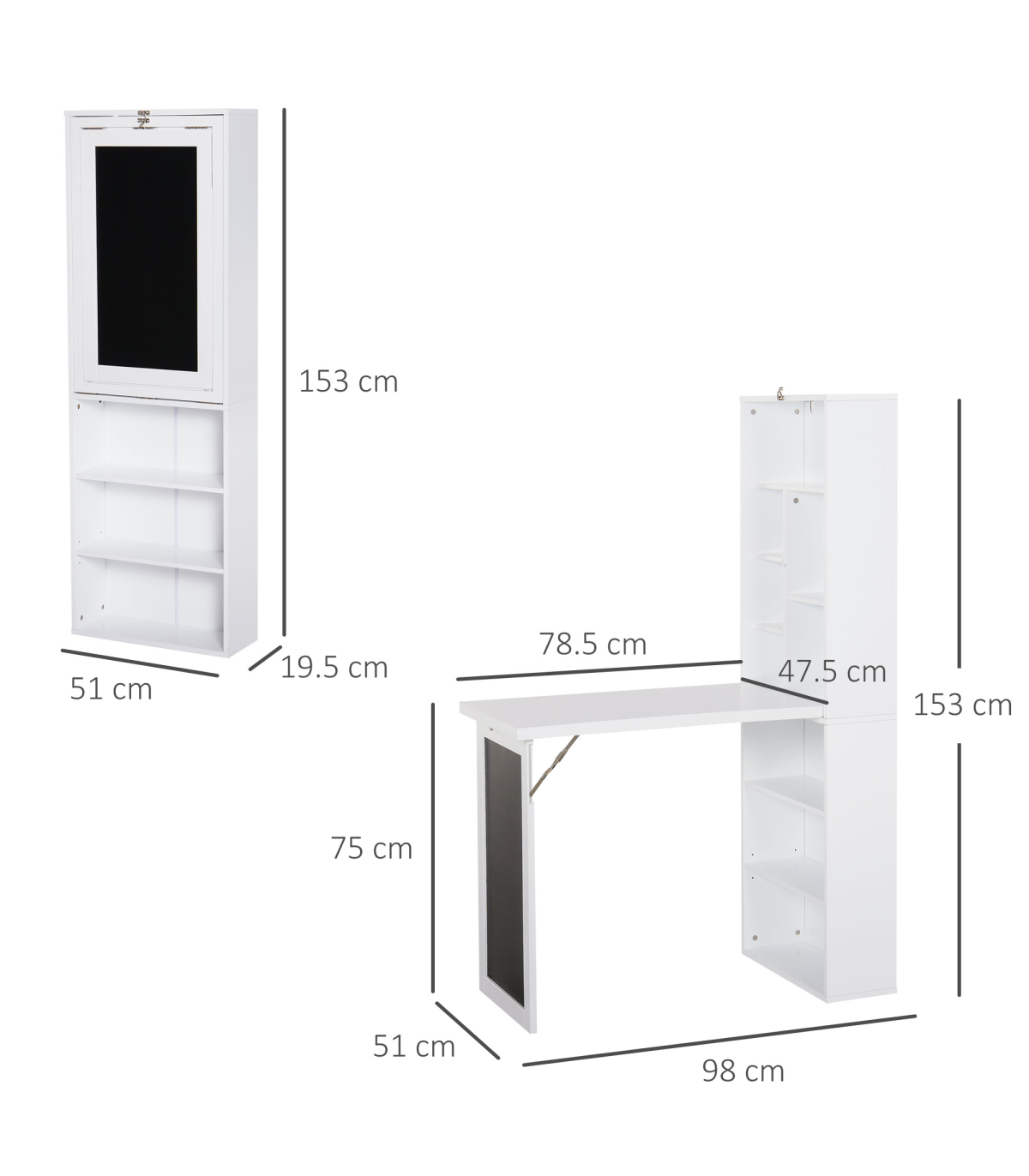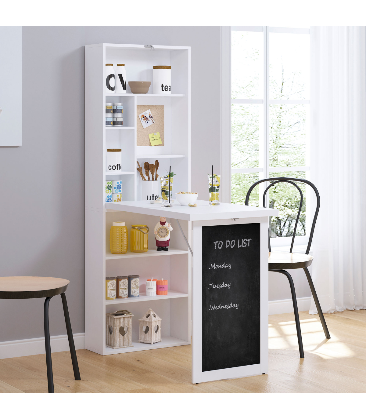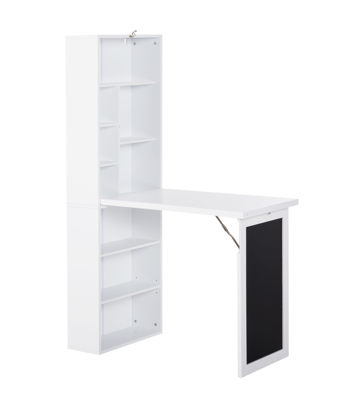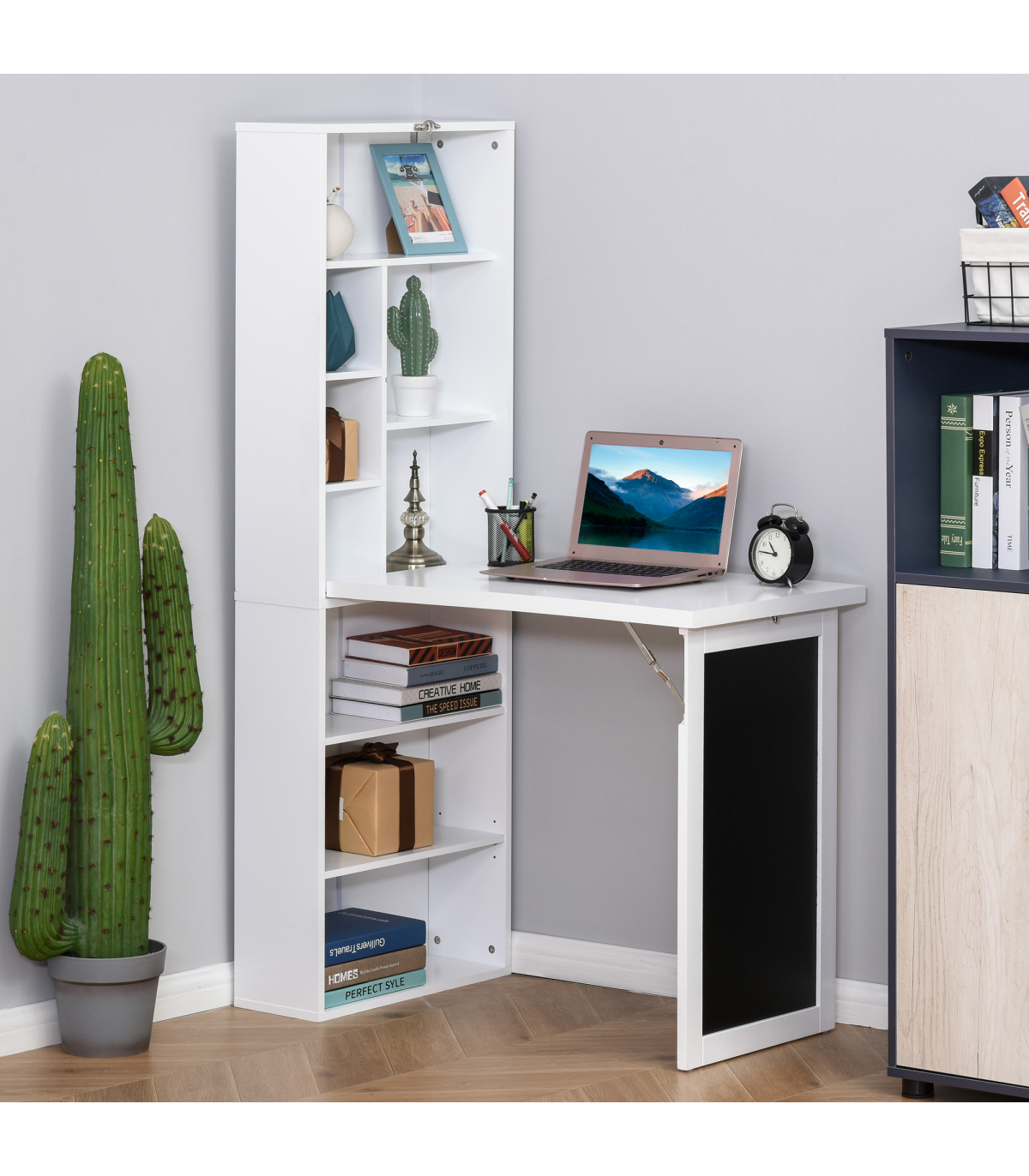 3-in-1 design: The home office desk is formed of the end bookcase, middle work table and the chalkboard on the end panel. A place to work from, where you can keep your books close and thoughts visibly noted. Shelf features nine compartments, bottom shelf can be moved to three different positions.Folding: Computer table can fold up into the bookcase and displays the chalkboard when correctly locked into place. An innovative design made to save space where needed.Sturdy: Tough and durable particle board structure made to be used every day. Fitted with metal hinges and accents to hold each part in place. Blackboard: Displays when the study desk is both folded and unfolded, easy to see your thoughts at all times.Anti-tipping: Fixes the study table to the wall for safety in homes with children and pets. Dimensions: 153H x 98W x 51Dcm. Middle table: 75H x 47.5W x 78.5Dcm.Maximum load: Whole: 60kg. Table: 50kg. Assembly required.
