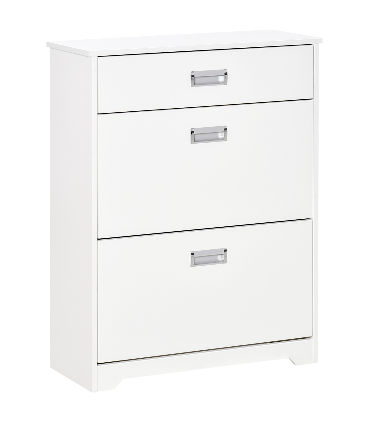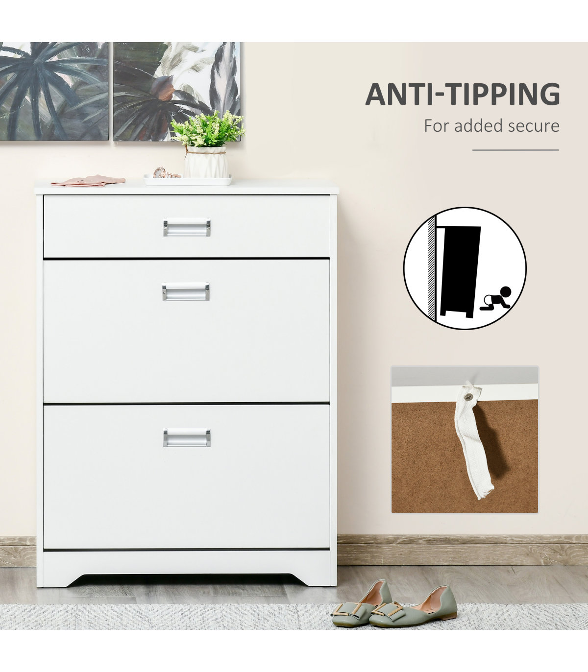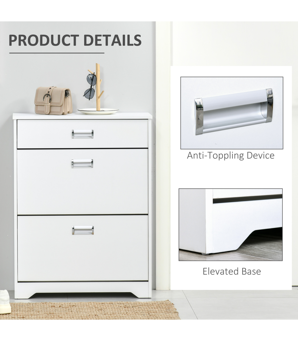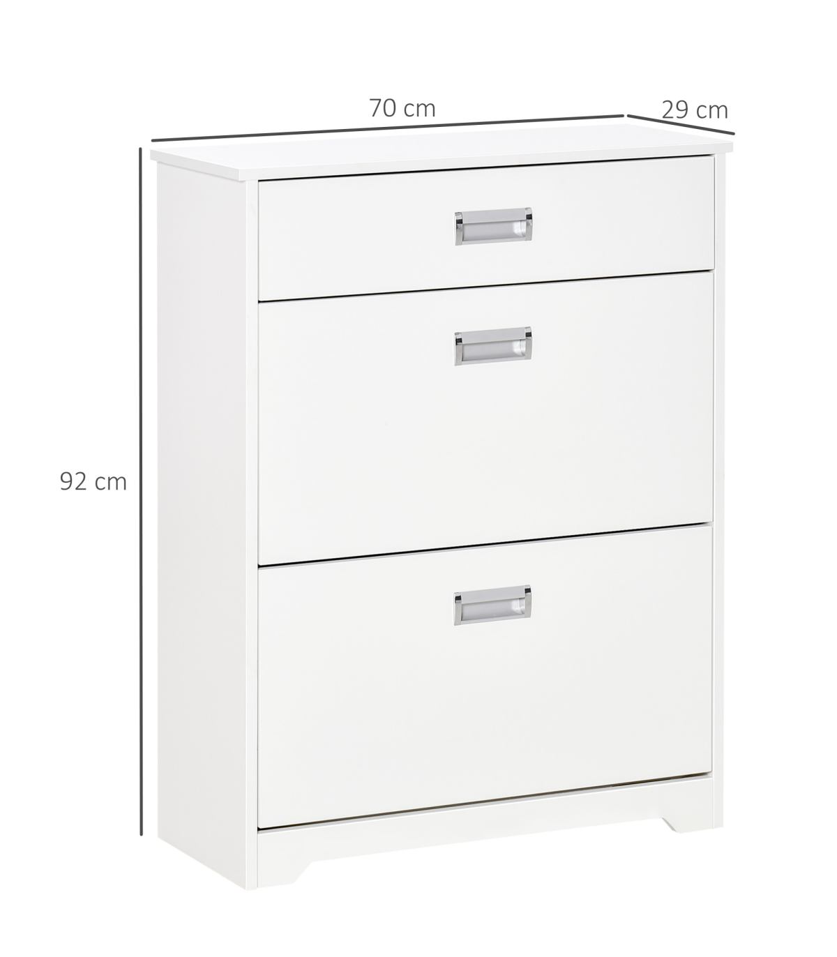 LARGE CAPACITY: 2 file door drawers, 1 pull-out drawer and a smooth countertop provide ample holding and display space for keeping keys, bags, shoes and ornaments, etc.ADJUSTABLE SHELF: 2-level adjustable and removable shelf in each tier suit for storing shoes of various sizes and types. Each tier can put 4 pairs of shoes.STURDY STRUCTURE: Constructed of quality particleboard, ensures a solid unit for reliable everyday use. Anti-toppling design at the back of the shoe cabinet for adding safety and security.ELEGANT AND MODERN: The pure white appearance delivers a sense of fashion and minimalist taste. No matter where it is placed, it can be perfectly integrated into your room style.SPACE-SAVING: It features 2 tipping doors with exquisite handles for easy opening and taking out your shoes. The space-saving and convenient design fit limited space using. Overall Dimension: 70L x 29W x 92H cm. Assembly required.