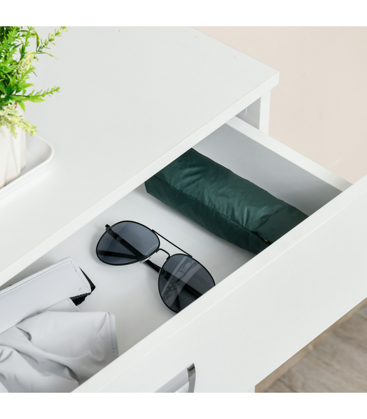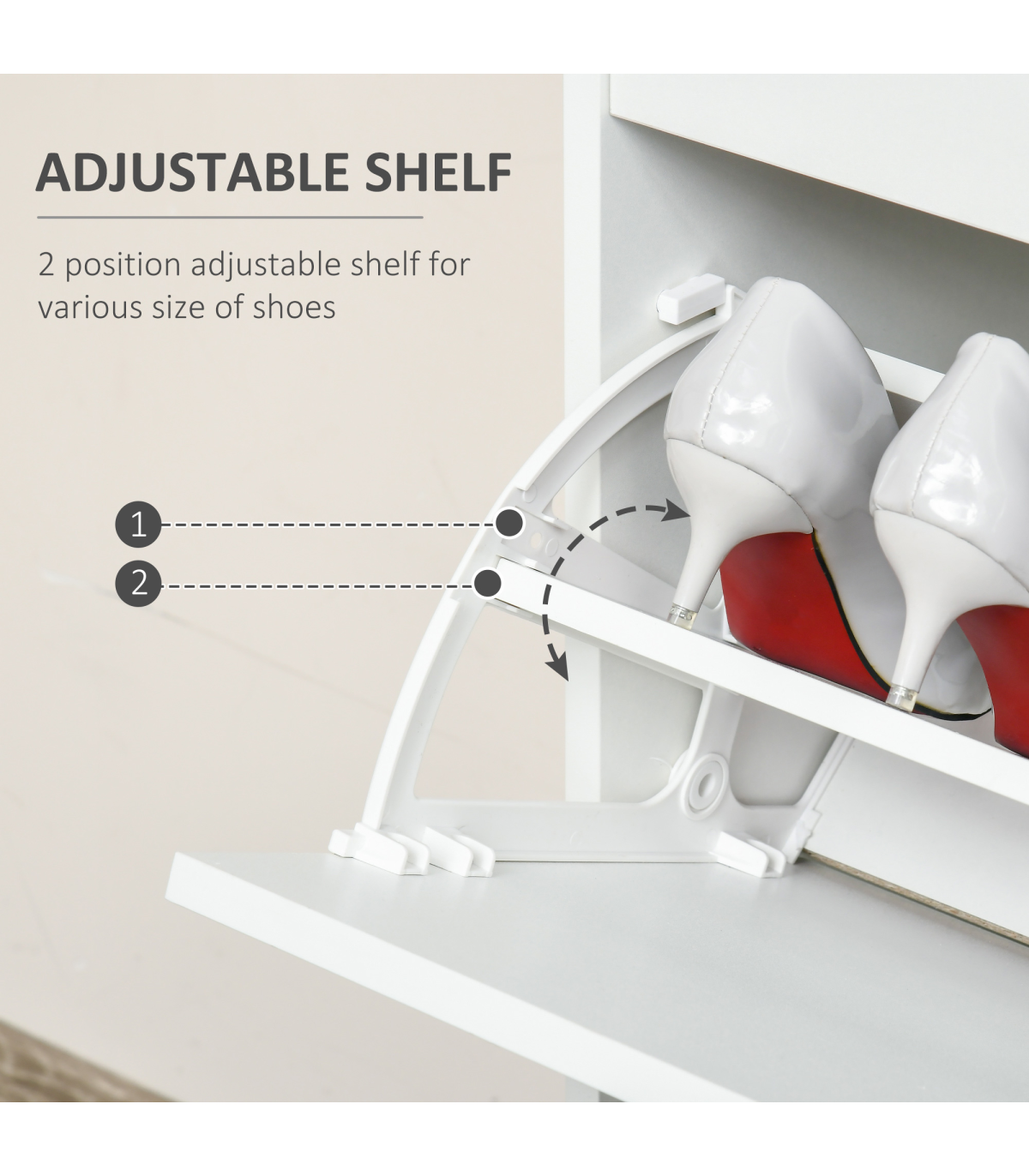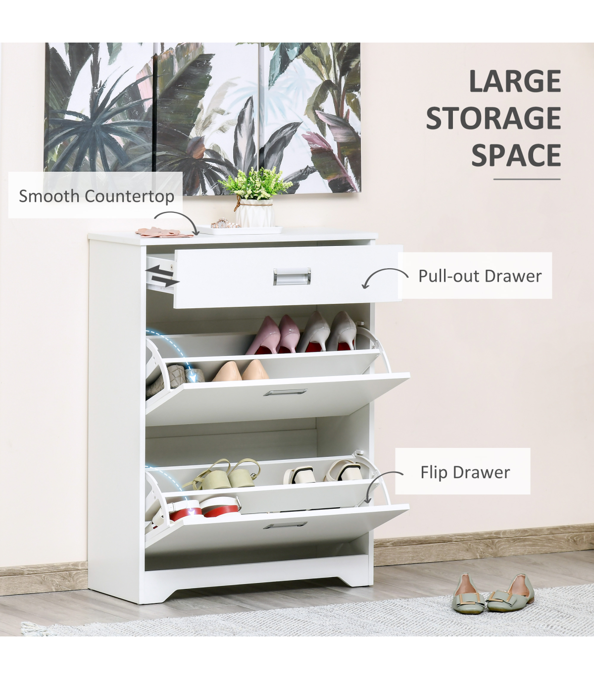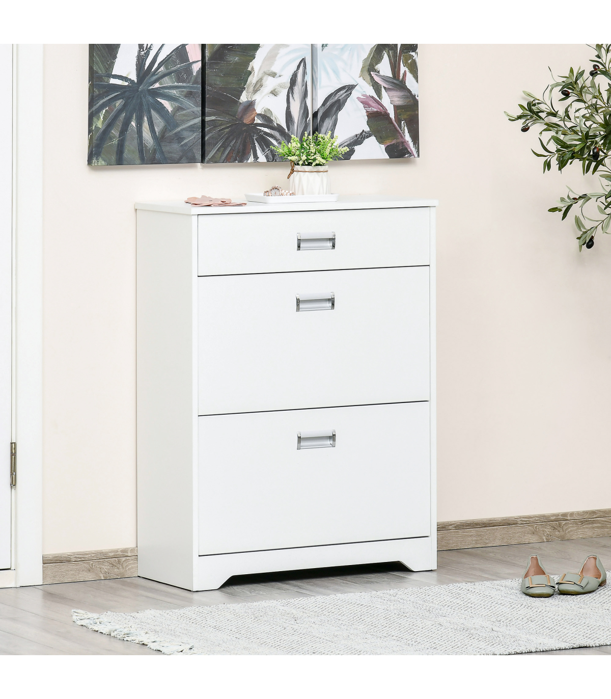 LARGE CAPACITY: 2 file door drawers, 1 pull-out drawer and a smooth countertop provide ample holding and display space for keeping keys, bags, shoes and ornaments, etc.ADJUSTABLE SHELF: 2-level adjustable and removable shelf in each tier suit for storing shoes of various sizes and types. Each tier can put 4 pairs of shoes.STURDY STRUCTURE: Constructed of quality particleboard, ensures a solid unit for reliable everyday use. Anti-toppling design at the back of the shoe cabinet for adding safety and security.ELEGANT AND MODERN: The pure white appearance delivers a sense of fashion and minimalist taste. No matter where it is placed, it can be perfectly integrated into your room style.SPACE-SAVING: It features 2 tipping doors with exquisite handles for easy opening and taking out your shoes. The space-saving and convenient design fit limited space using. Overall Dimension: 70L x 29W x 92H cm. Assembly required.