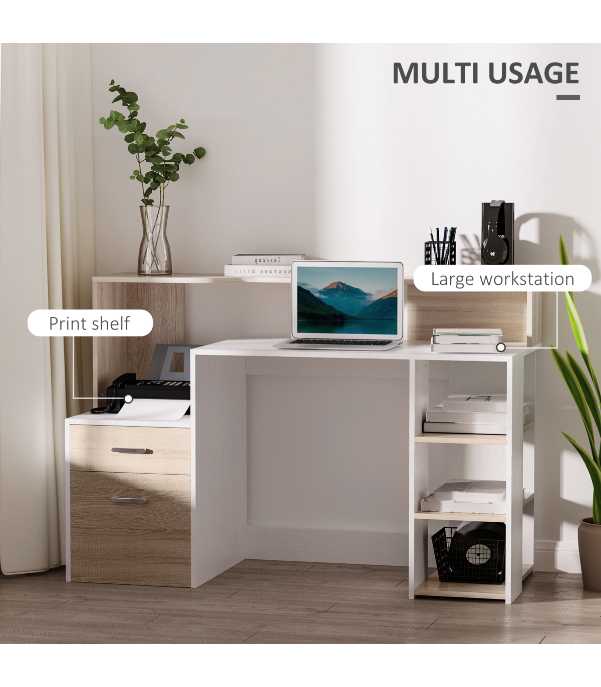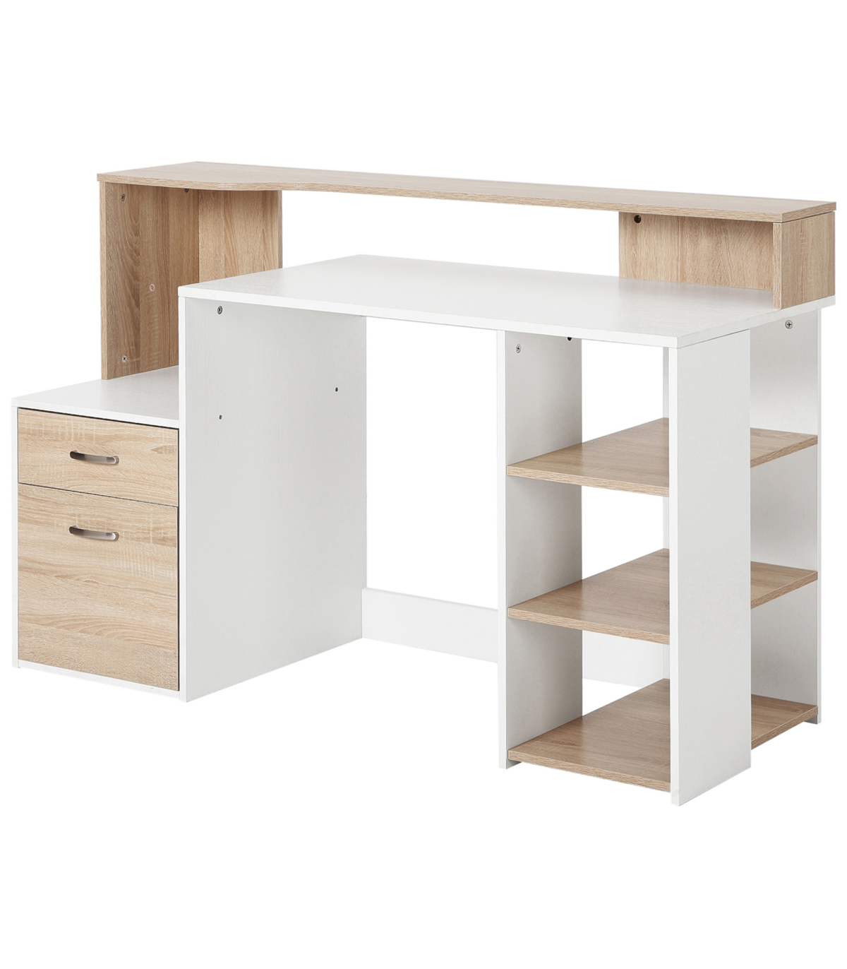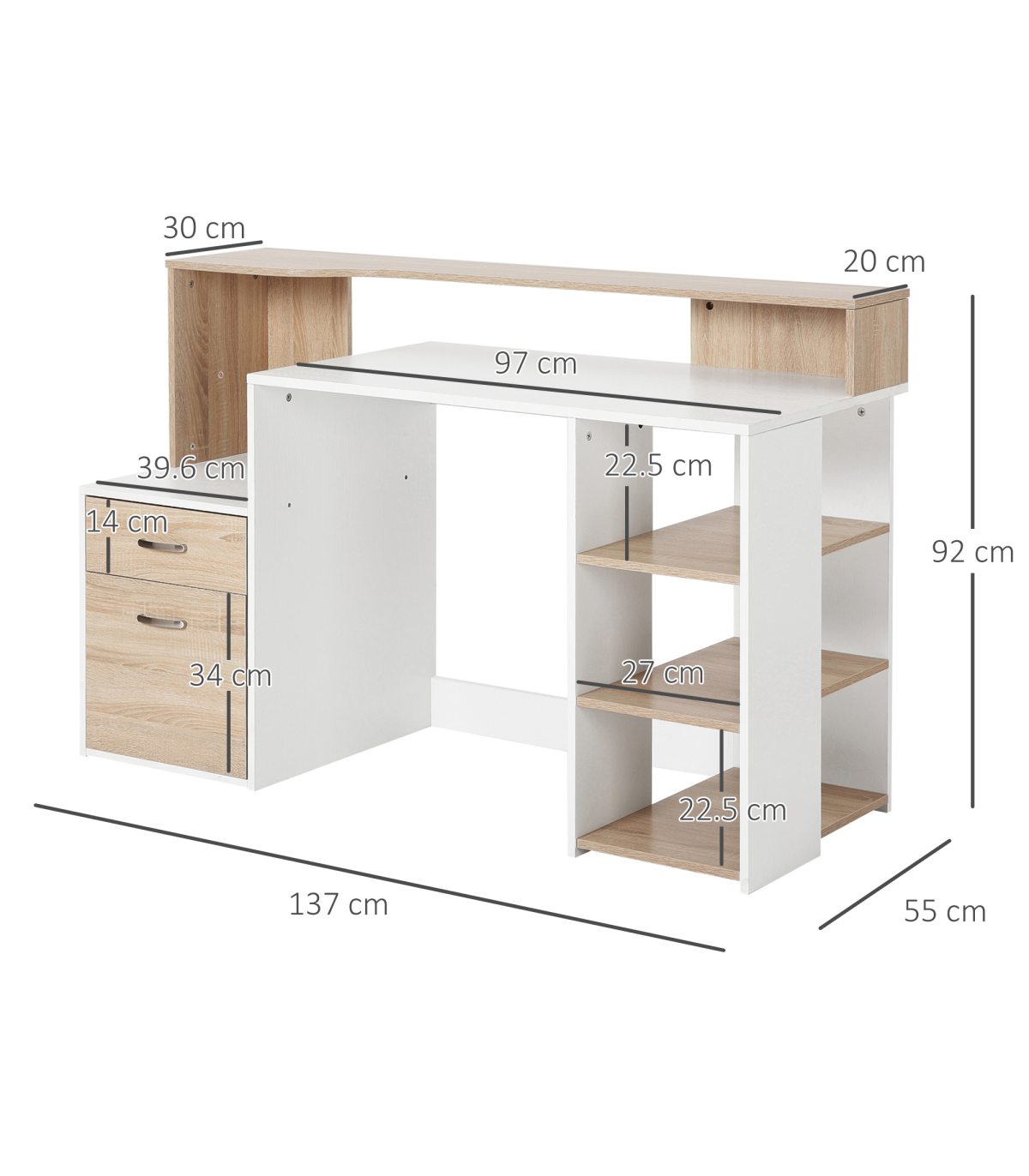 - "Multi-Storage & Workstation Desk Table Storage Shelves Home Office Oak HOMCOM" - Description: - MULTI-USE DESIGN: Features three side shelves, a two-drawer cabinet, a large worktop, a small printer storage side space, and a high top back to provide ample room for work and storage of work essentials. - COMPACT SIZE: Ideal for home study spaces and small offices, allowing efficient utilization of space. - SOLID CONSTRUCTION: Crafted from MDF for a sturdy and durable frame to support work and store work supplies. - METAL HANDLES: Strong and sleek aluminum handles for easy and safe opening/closing of drawers, adding a refined finishing touch. - DIMENSIONS: 92H x 137L x 55Dcm. - MAXIMUM LOAD: 50KG. - ASSEMBLY REQUIRED.