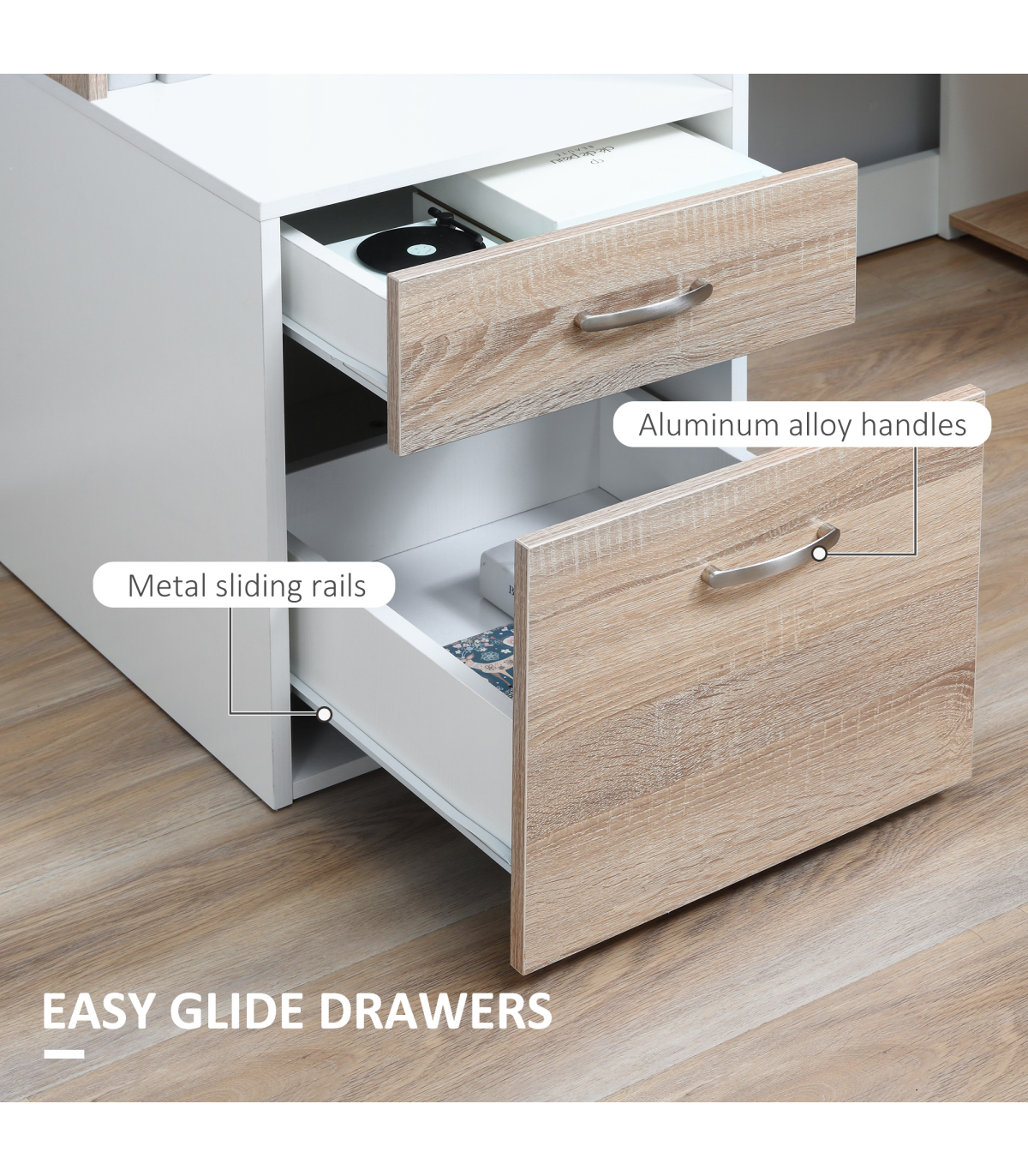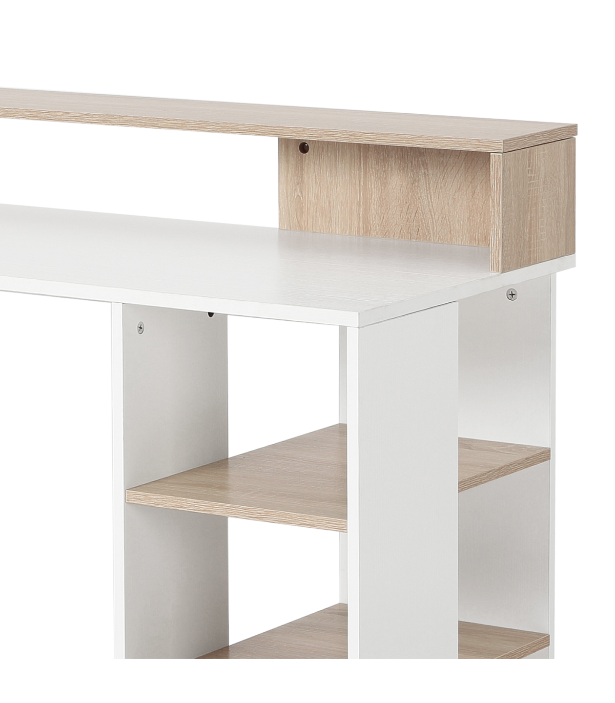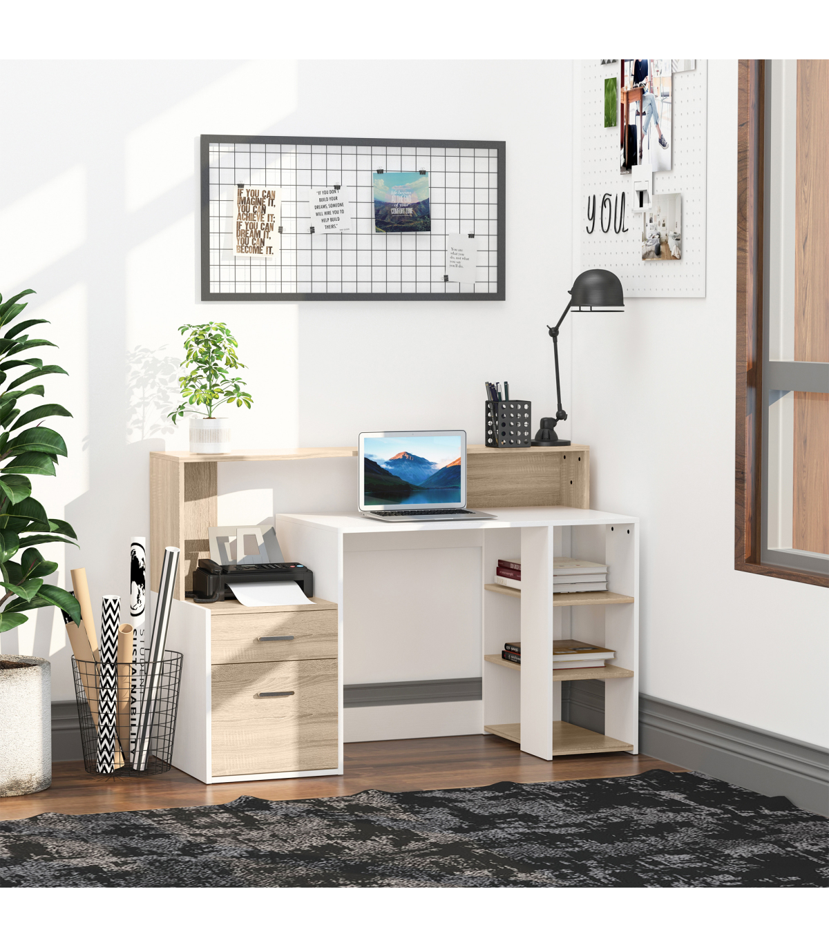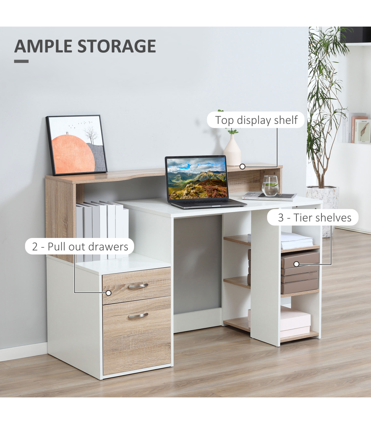 - "Multi-Storage & Workstation Desk Table Storage Shelves Home Office Oak HOMCOM" - Description: - MULTI-USE DESIGN: Features three side shelves, a two-drawer cabinet, a large worktop, a small printer storage side space, and a high top back to provide ample room for work and storage of work essentials. - COMPACT SIZE: Ideal for home study spaces and small offices, allowing efficient utilization of space. - SOLID CONSTRUCTION: Crafted from MDF for a sturdy and durable frame to support work and store work supplies. - METAL HANDLES: Strong and sleek aluminum handles for easy and safe opening/closing of drawers, adding a refined finishing touch. - DIMENSIONS: 92H x 137L x 55Dcm. - MAXIMUM LOAD: 50KG. - ASSEMBLY REQUIRED.
