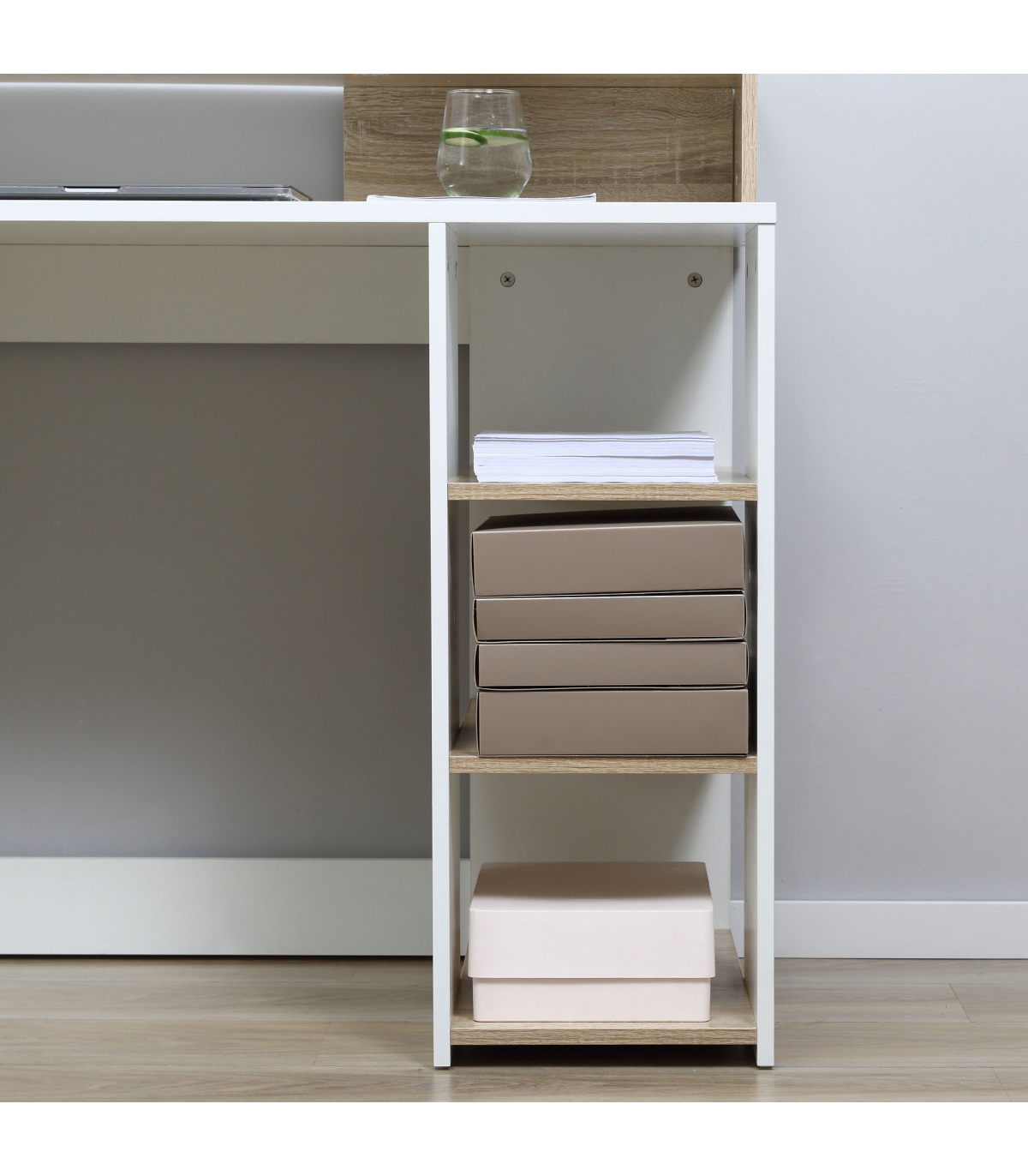 Take your office work set-up to the next level: go for this PC desk from HOMCOM. A multi-use design, it features three side shelves, a two-drawer storage cabinet, a large worktop and a high top back, giving you more than adequate room for working from and storing everything in one compact place. With stand-out metal accents to finish, this desk is made with ultimate style in mind �C something you'll love inviting it into your work space.