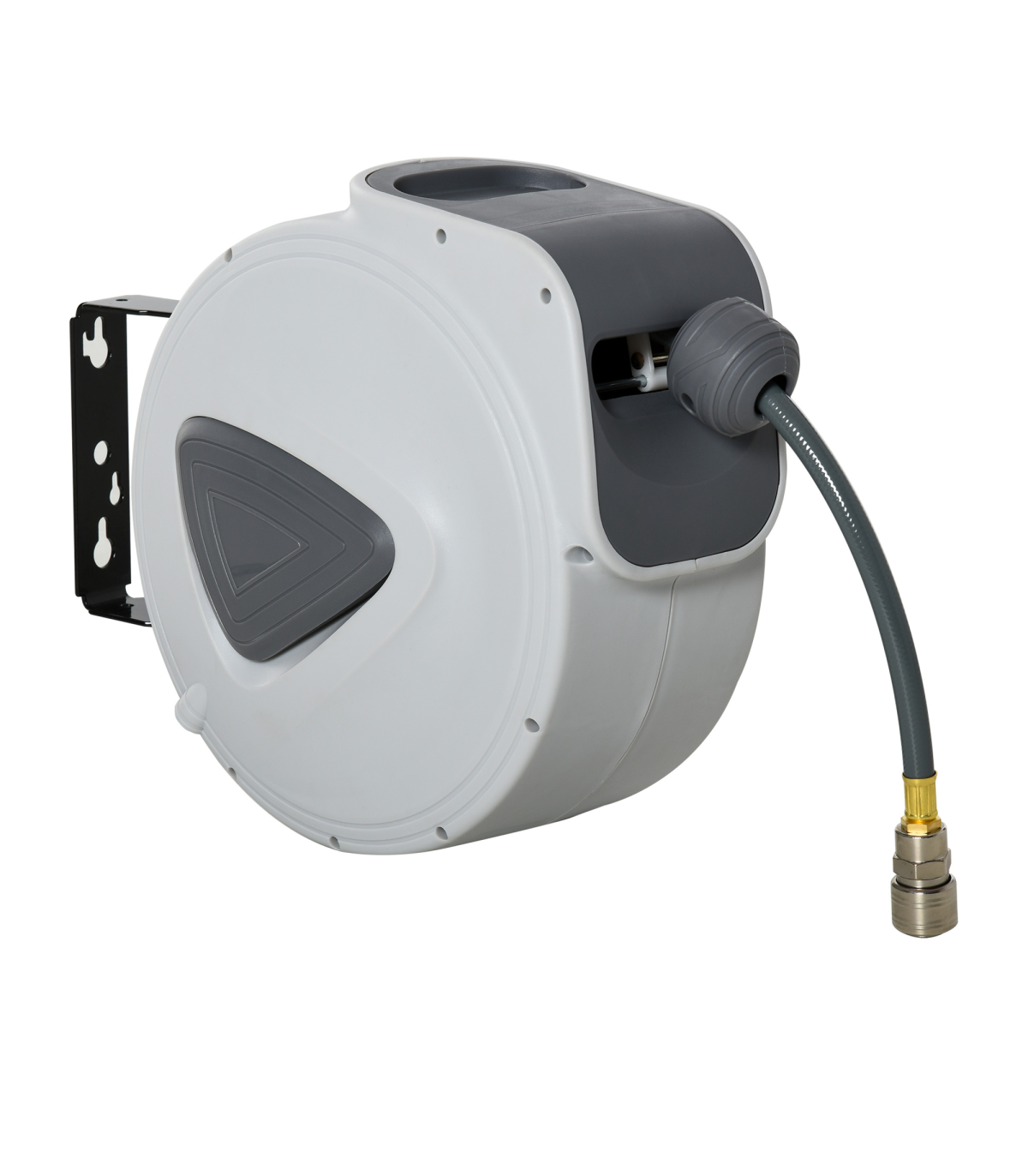 Refill tyres, use compressed air and more at any distance with this air hose reel from DURHAND. It can be mounted on the wall if wanted, with a built-in handle for easy carrying. The hose automatically retracts and can be locked in place to a particular length if required. It's compatible with other compressors and air accessories so it's truly multifunctional. Rotates 180�� to move with you as you use it.