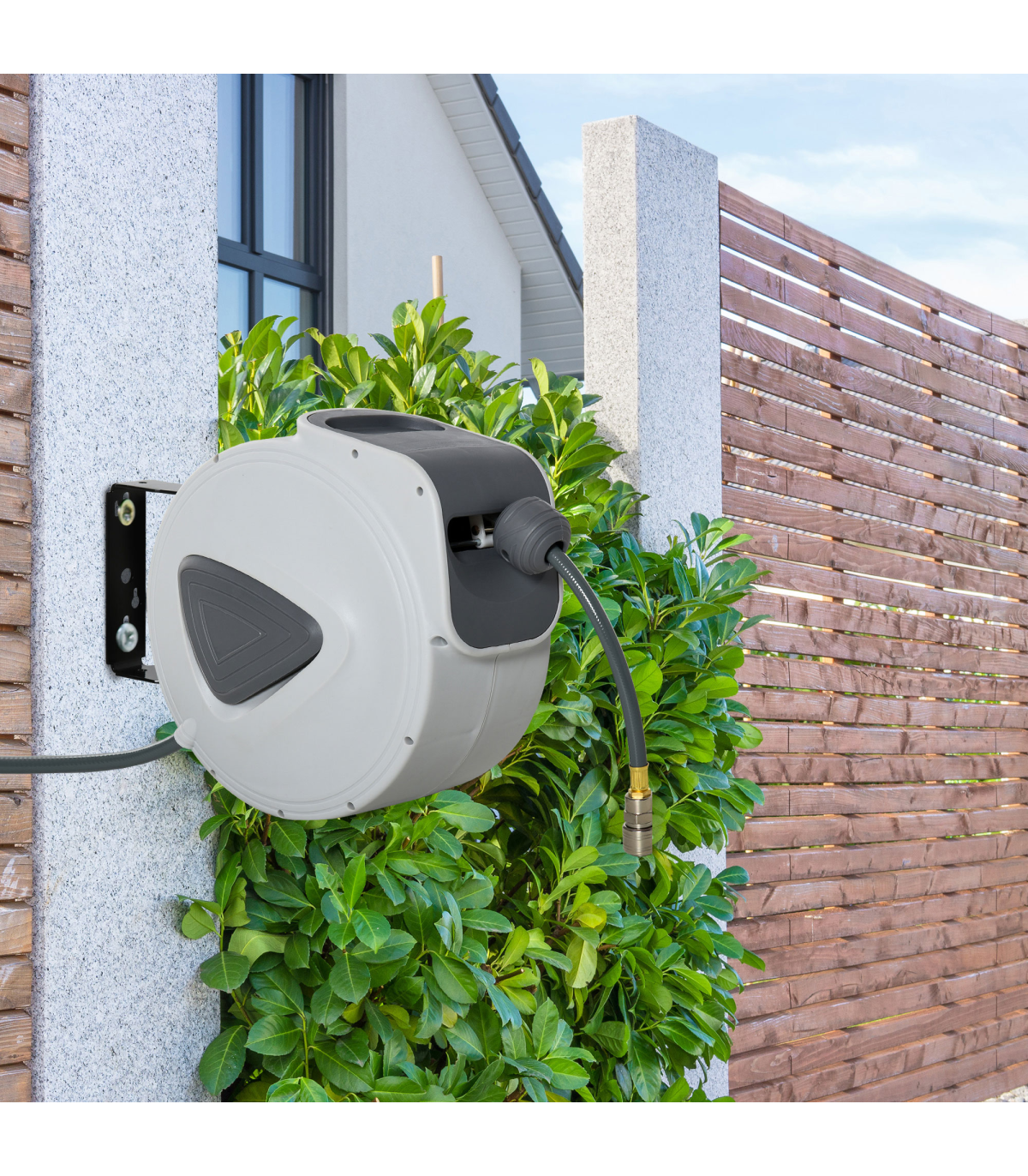 - "Retractable Air Hose Reel Auto Self-Winding Wall Mount 1/4" 15m+140cm Durhand" - Description: - AUTO RETRACT: Hose rewinds quickly and easily. Convenient and time-saving. Also locks into place at any given length with one tug. - MULTI-FUNCTIONAL: Compatible with other compressors and air accessories. Maximum pressure is 18 bar, between -5 and 45C. Ideal for all home garages and workspaces. - WALL-MOUNTABLE: Can be easily fixed to the wall, keeping it out of the way and in a place known to you. Features handle to carry around too. - QUALITY COMPOSITION: Durable PP plastic body, with a steel and zinc blend inlet and outlet fitting. Mounting bracket rotates 180. - DIMENSIONS: 36.6H x 39L x 21.2Wcm. Hose length: 15m.
