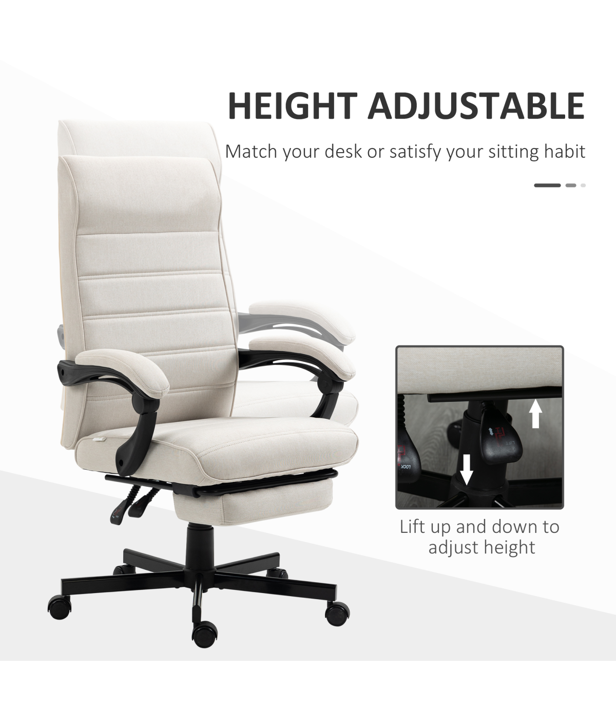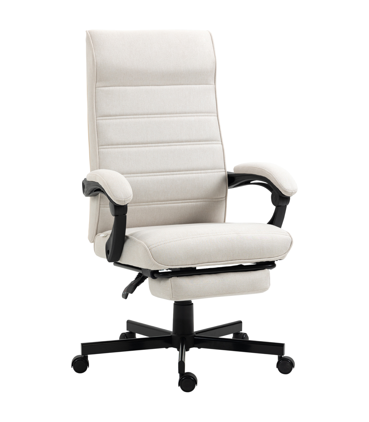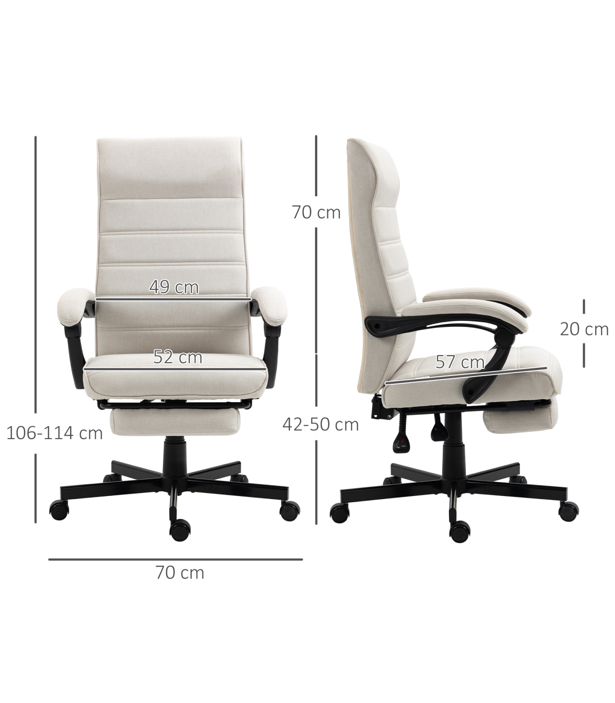 - Home Office Chair High-Back Reclining Chair for Bedroom Study Living Room - White - Description: - 42-50cm adjustable height: Set this computer chair to a level you want. - Easy to match your desk and work at a comfortable level. - Gas lift to move up/down smoothly. - Reclining, with footrest: Back on this high back office chair goes back to a maximum 135° angle. - Great for lying back and taking time out. - Manual footrest to elevate your lower body. - An office chair for home, an office chair for work. - Comfortable and ergonomic: Filled with padding so can be used all day long. - 360° seat, this swivel chair moves with your body motion. - High back and armrests for support. - Five wheels: A rolling chair which moves wherever you want it, without having to pick it up. - Dimensions: - 106-114H x 68W x 67Dcm. - Seat: 42-50H x 52W x 57Dcm. - Maximum load 120kg. - Assembly required.