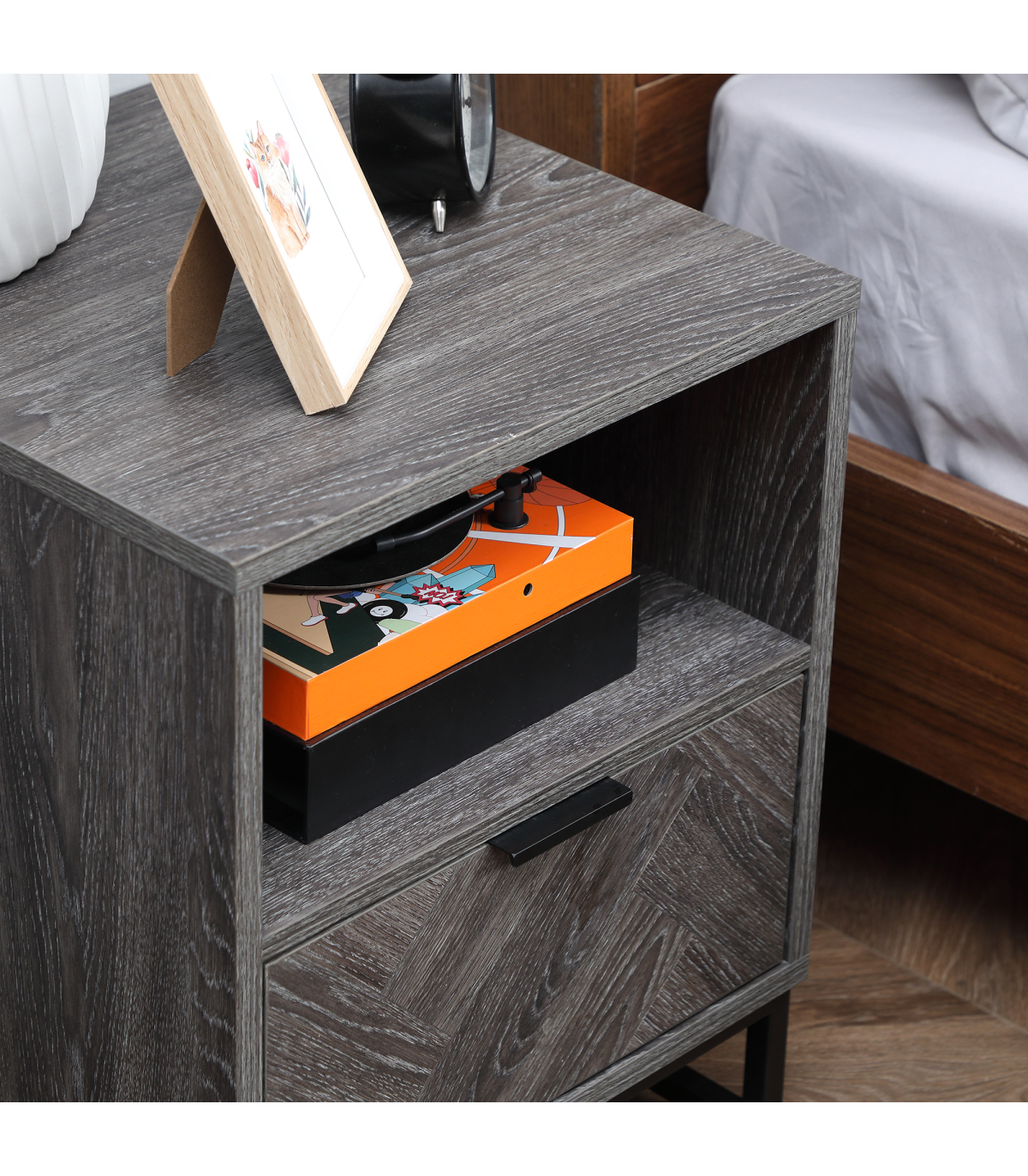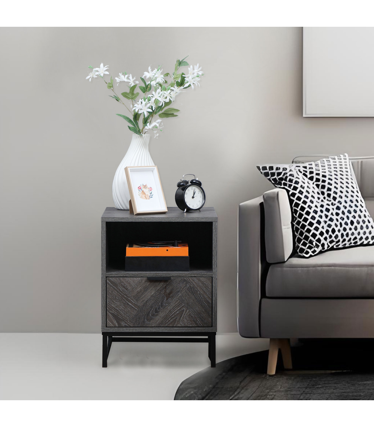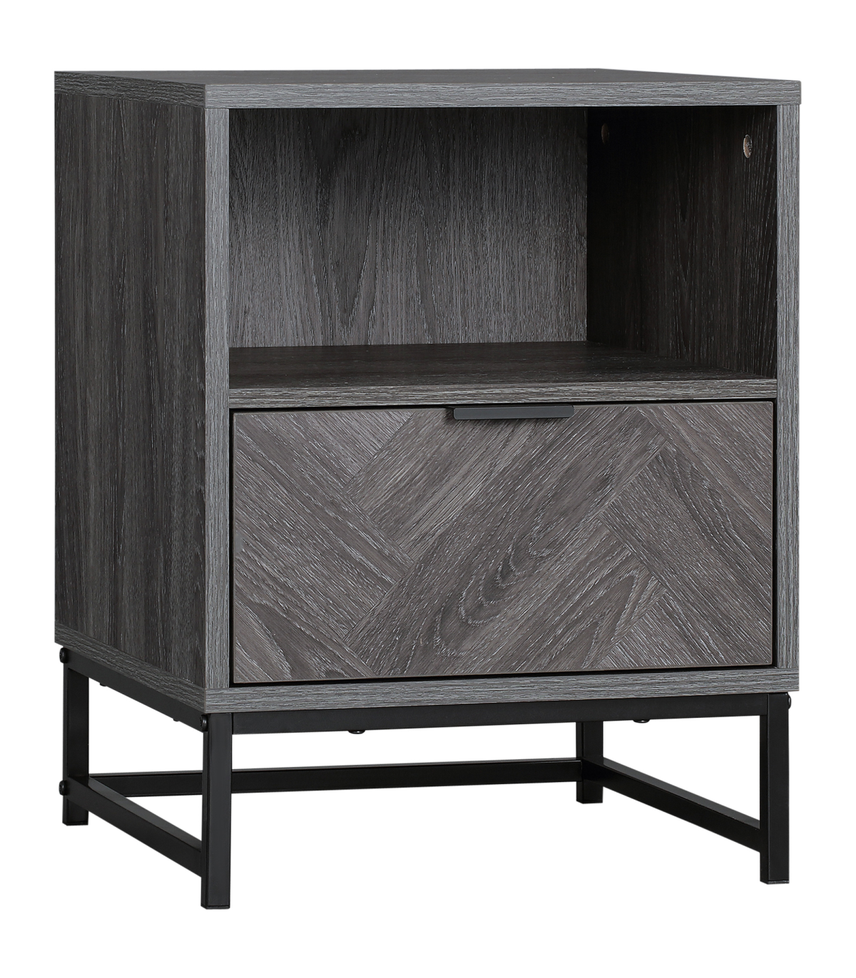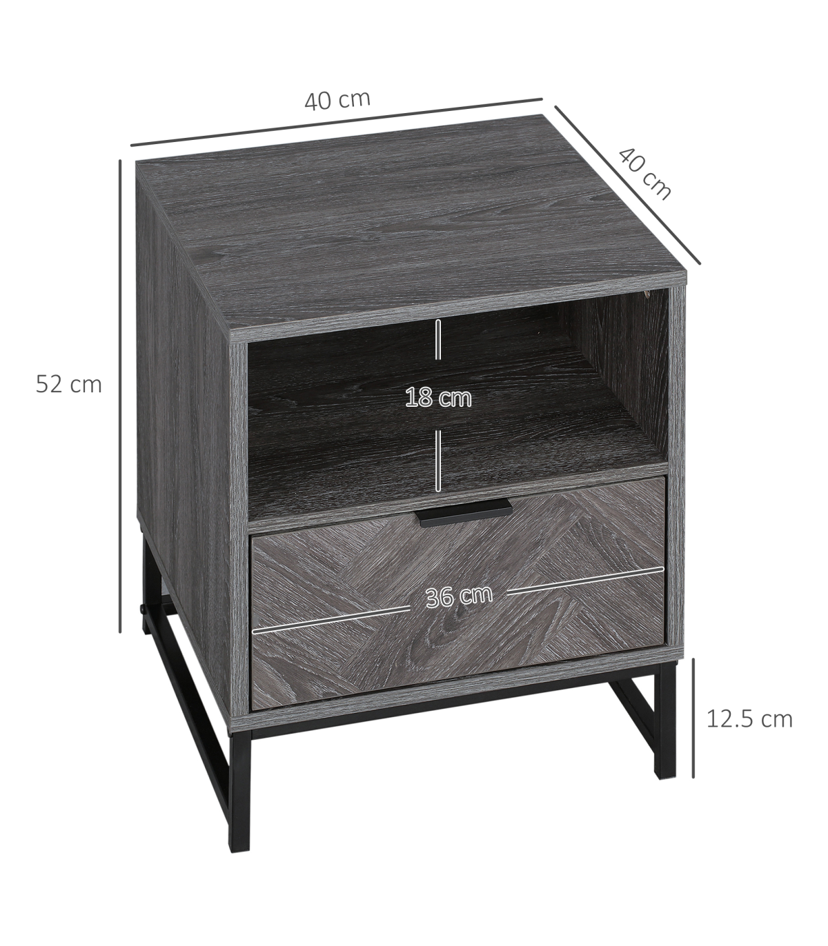 Storage: Bedside cabinet comes with drawer, shelf and flat top - keep everything you want together.Particle board body and steel frame: Durable structure, with melamine coating for light protection.Industrial-style design: Dark grey wood effect, with a black steel frame. Dark and moody look stands out in your space.Versatile: Not just a nightstand, can be used as a side table in the home or office.Dimensions: 52H x 40L x 40Wcm. Maximum load 30kg. Assembly required.