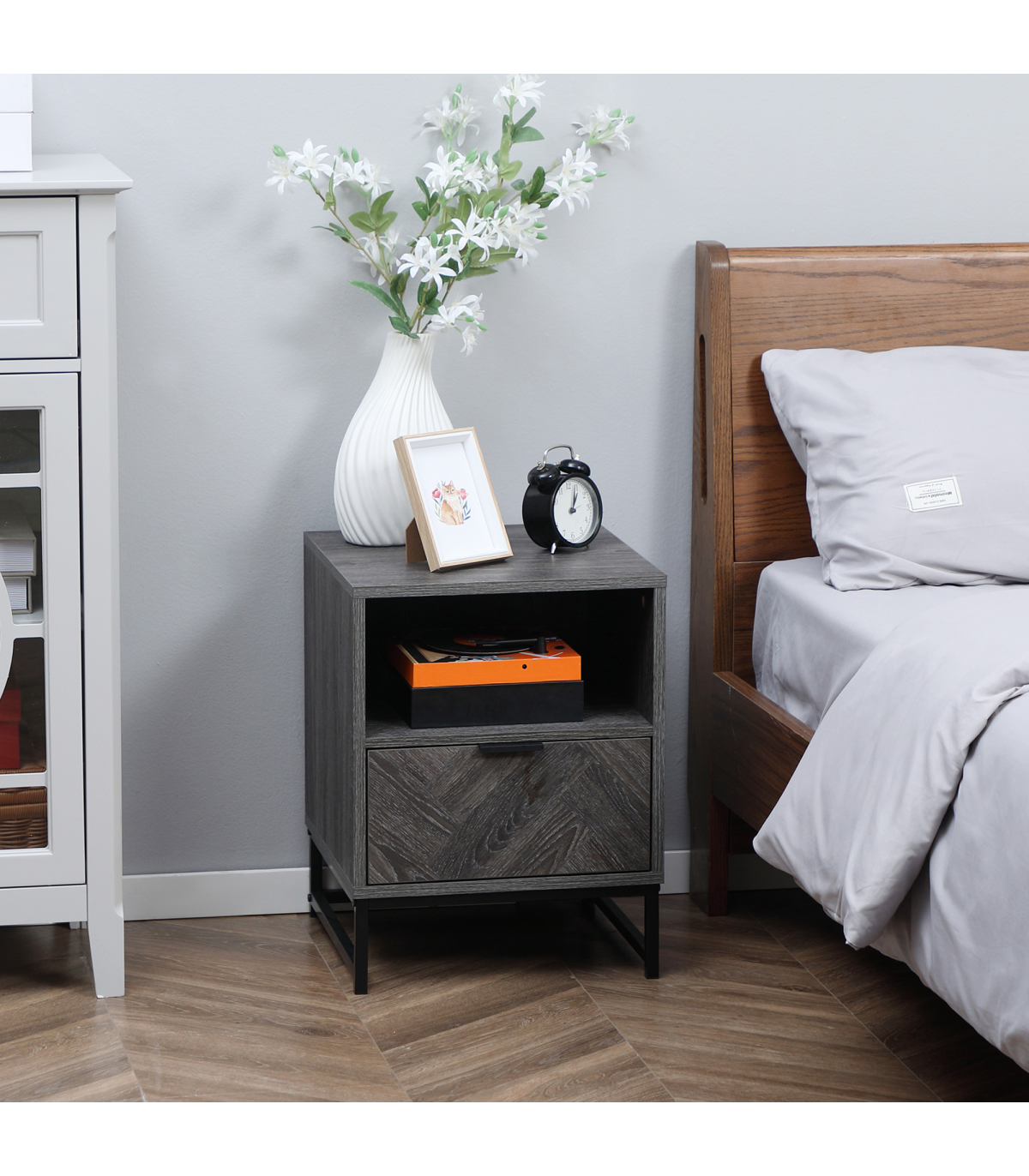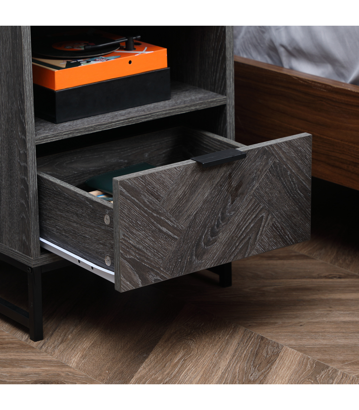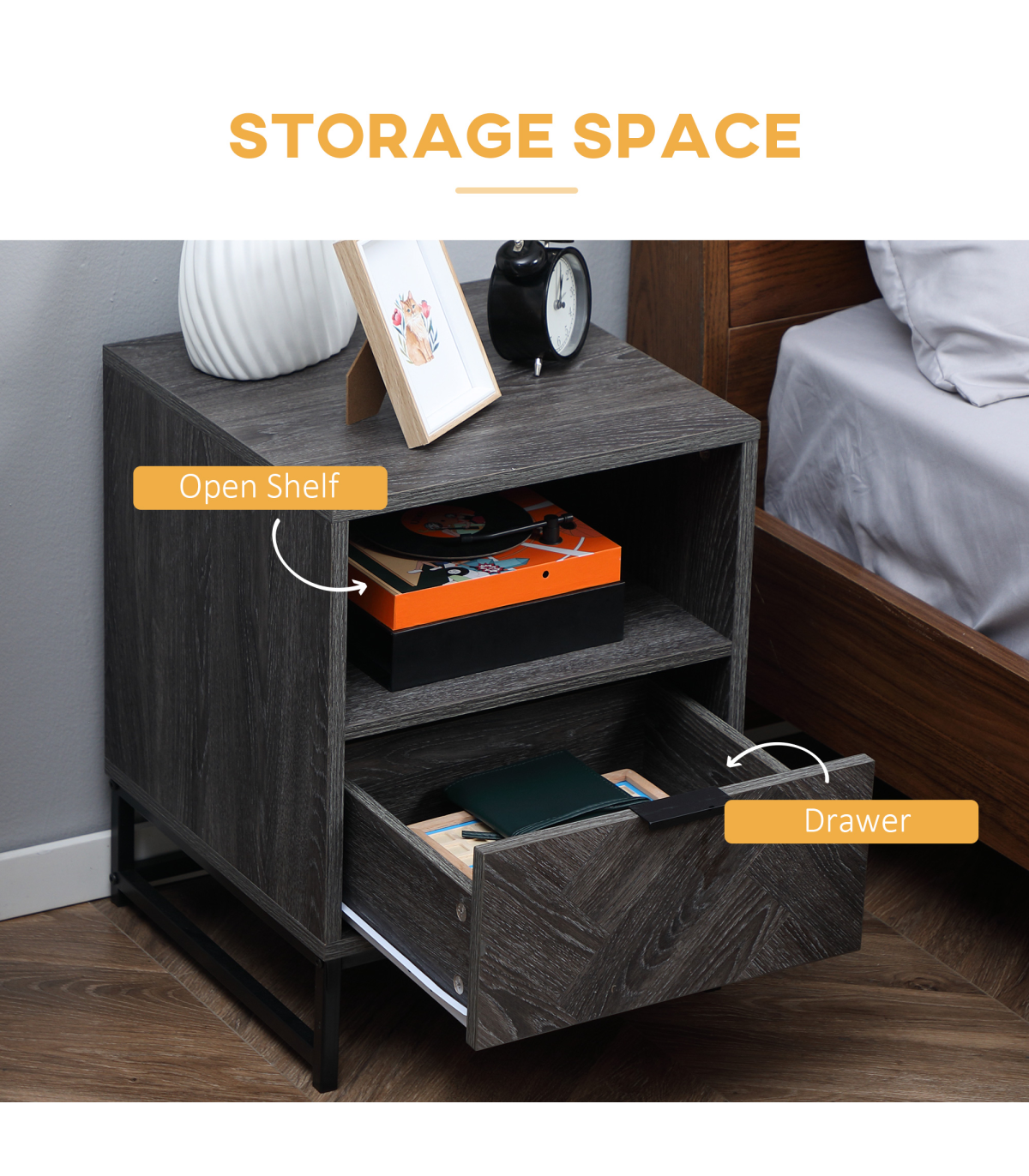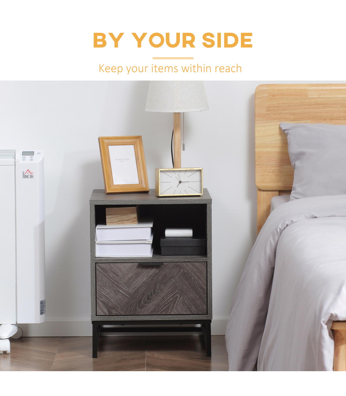 Storage: Bedside cabinet comes with drawer, shelf and flat top - keep everything you want together.Particle board body and steel frame: Durable structure, with melamine coating for light protection.Industrial-style design: Dark grey wood effect, with a black steel frame. Dark and moody look stands out in your space.Versatile: Not just a nightstand, can be used as a side table in the home or office.Dimensions: 52H x 40L x 40Wcm. Maximum load 30kg. Assembly required.