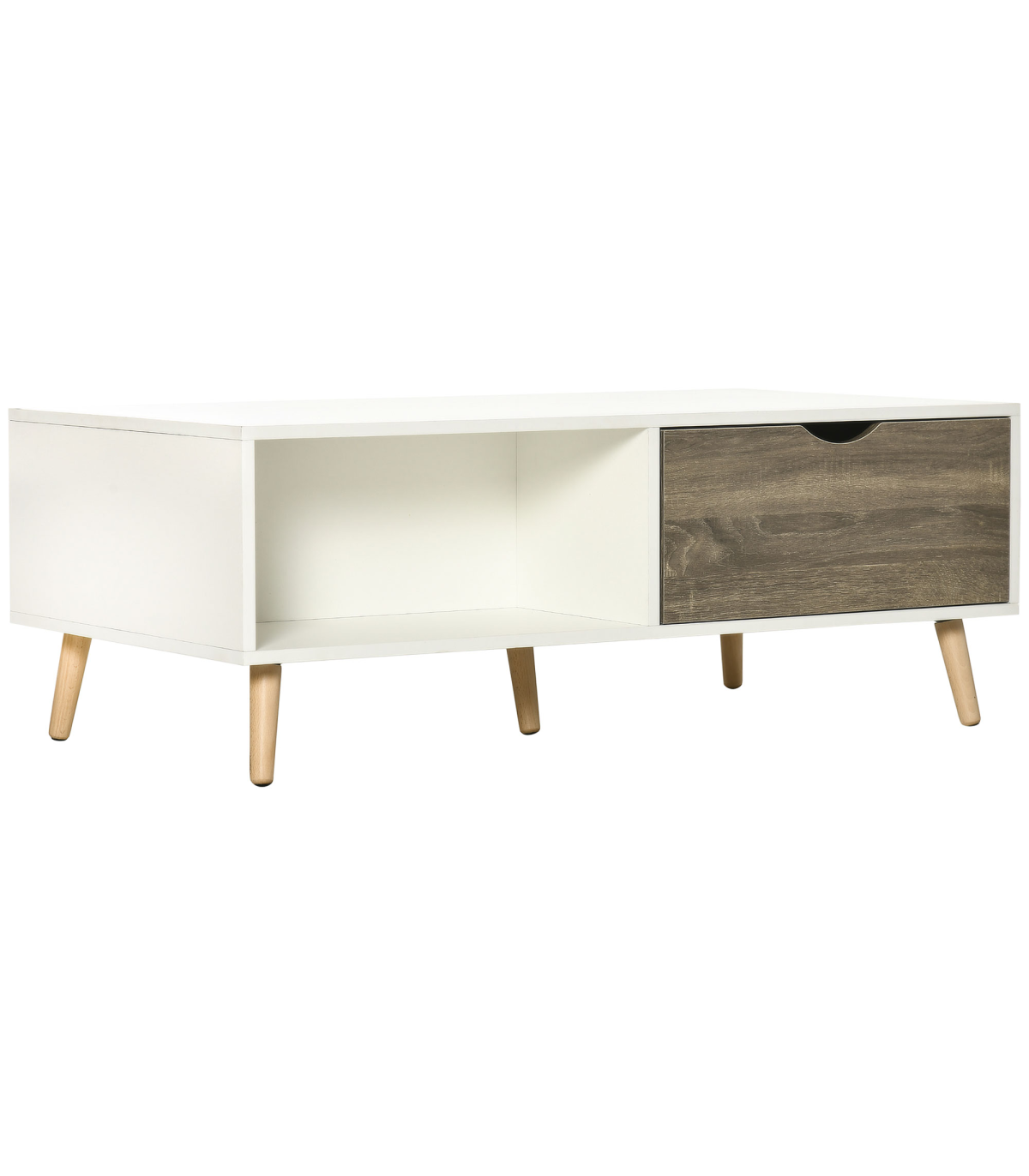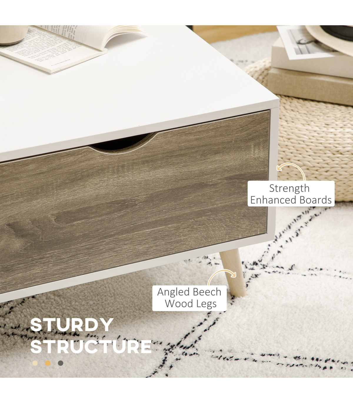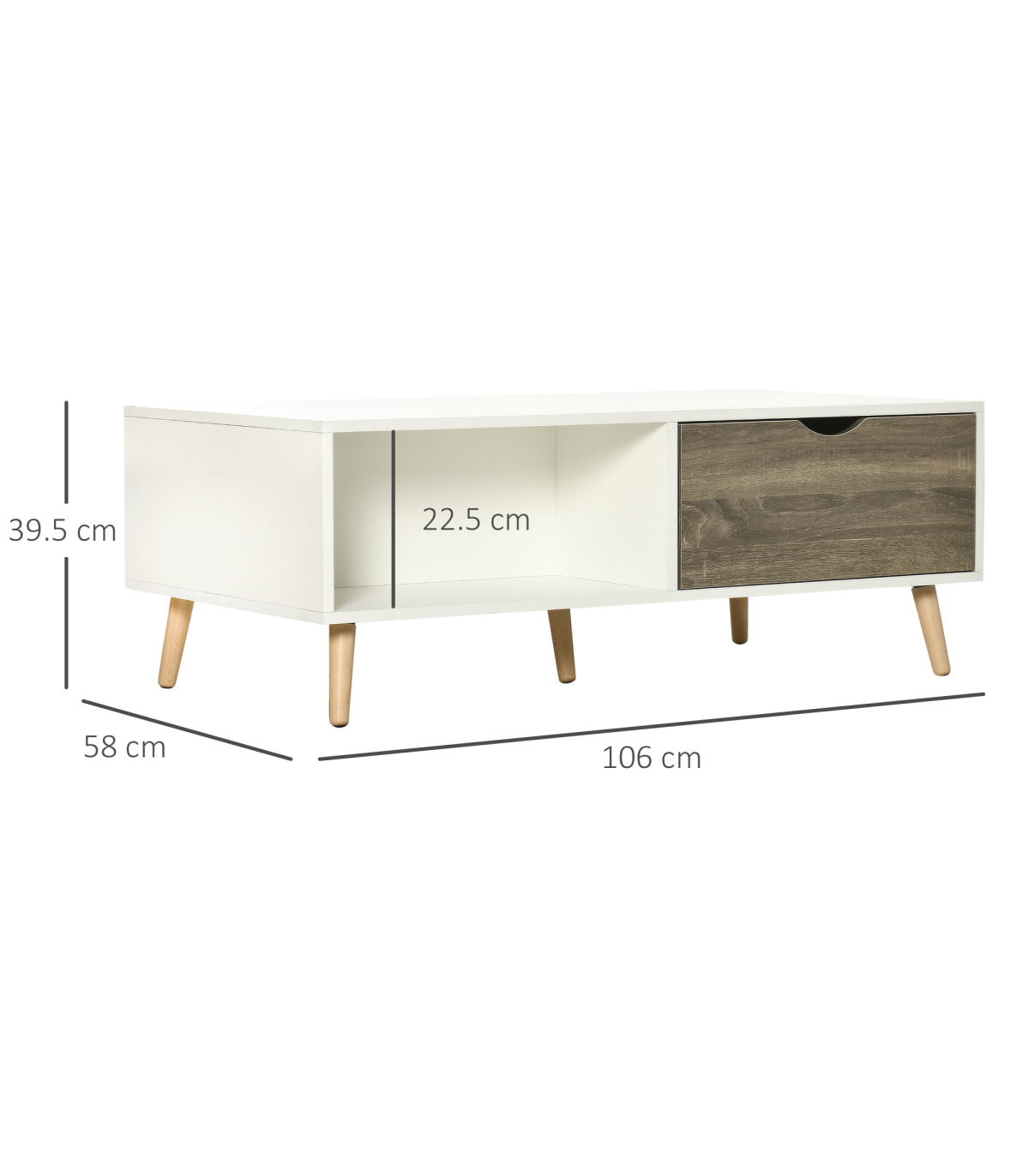 Coffee table with storage: Features a sliding drawer and shelf on each side - enough space for displaying and storing everything essential, within easy reach.Modern: A white coffee table, with wood-effect drawers. Boxy shape for an extra-contemporary touch. Simple and beautiful, looks great anywhere.Five wooden legs: This coffee table is properly supported - a sturdy base with foot pads to protect floor. Body of this coffee table with drawers is made from durable particle board, with a protective melamine coating.Dimensions: 39.5H x 106W x 58Dcm. Shelf: 22.5H x 50W x 28Dcm. Drawer inner: 7.5H x 45W x 23.5Dcm.Maximum load: Table top: 50kg. Shelf: 5kg. Drawer: 5kg. Assembly required.