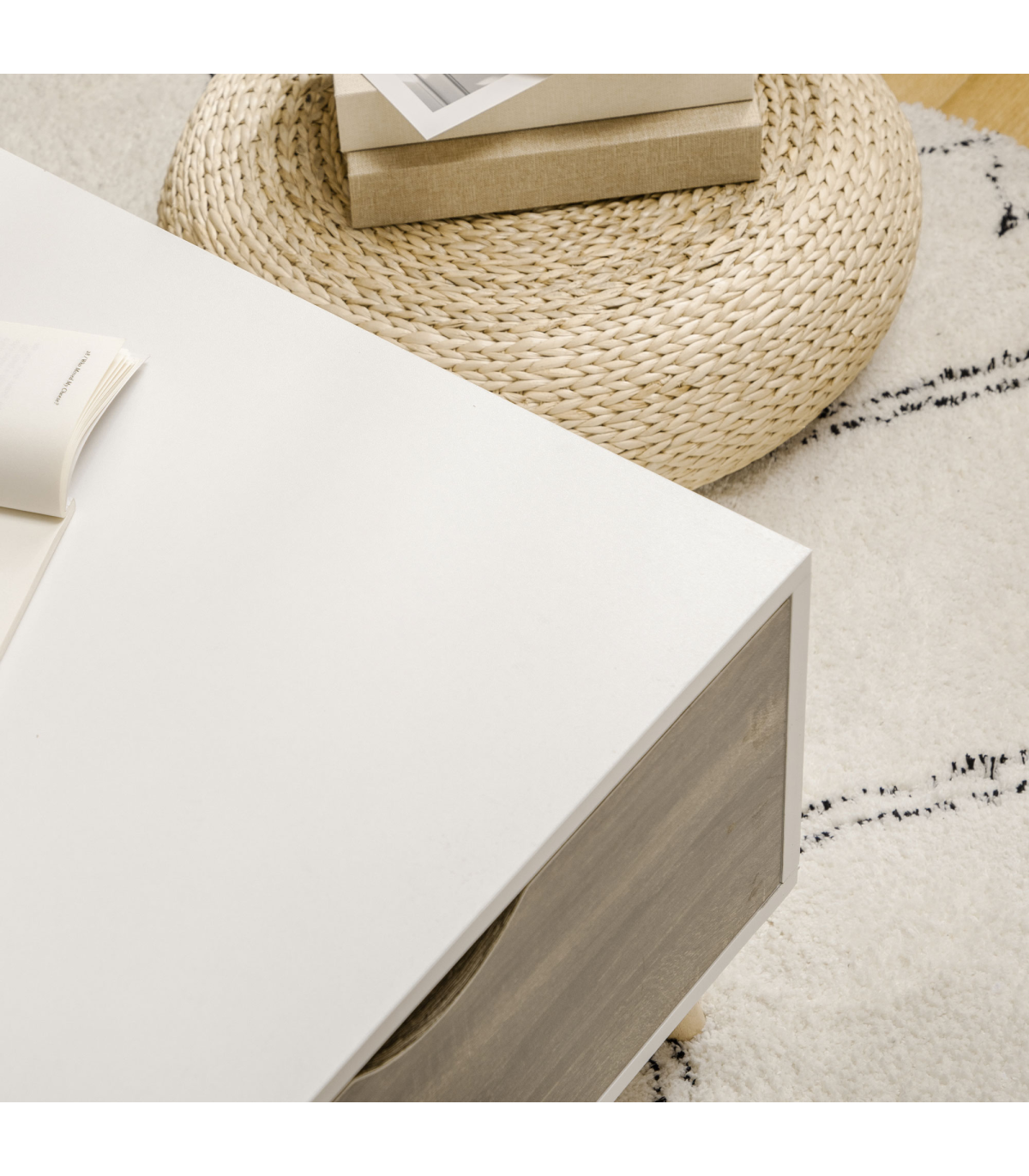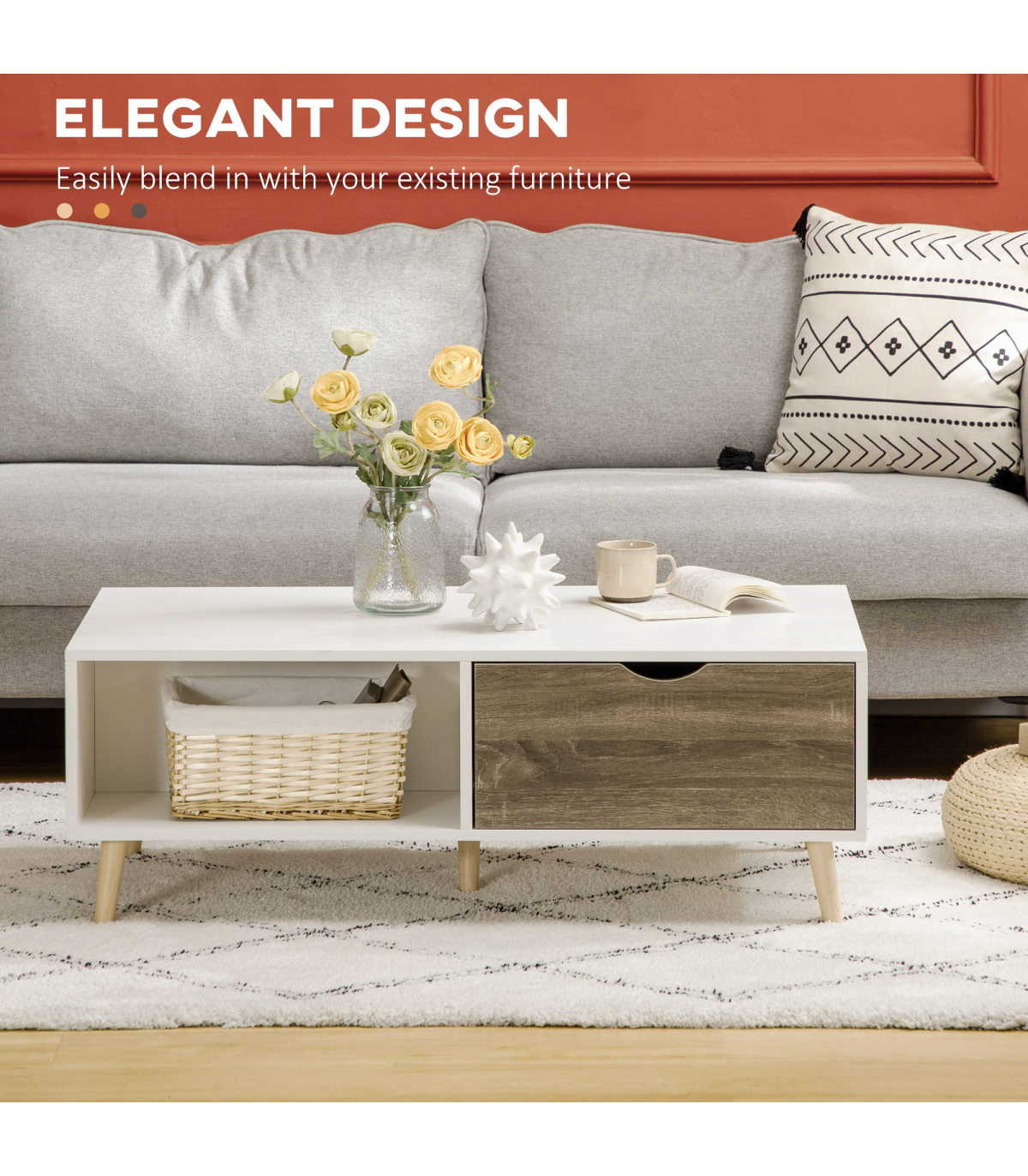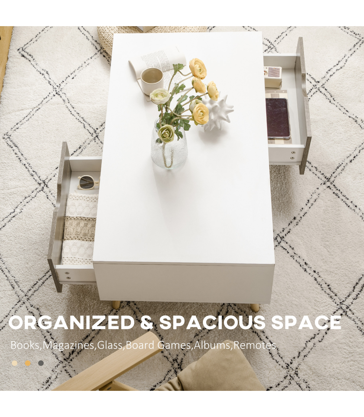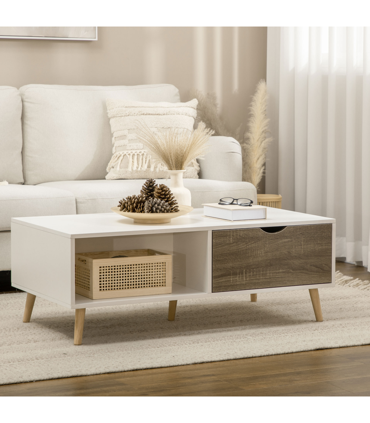 Coffee table with storage: Features a sliding drawer and shelf on each side - enough space for displaying and storing everything essential, within easy reach.Modern: A white coffee table, with wood-effect drawers. Boxy shape for an extra-contemporary touch. Simple and beautiful, looks great anywhere.Five wooden legs: This coffee table is properly supported - a sturdy base with foot pads to protect floor. Body of this coffee table with drawers is made from durable particle board, with a protective melamine coating.Dimensions: 39.5H x 106W x 58Dcm. Shelf: 22.5H x 50W x 28Dcm. Drawer inner: 7.5H x 45W x 23.5Dcm.Maximum load: Table top: 50kg. Shelf: 5kg. Drawer: 5kg. Assembly required.