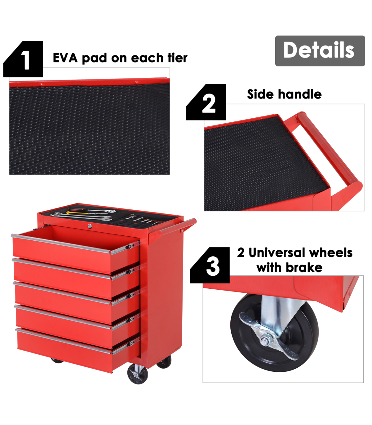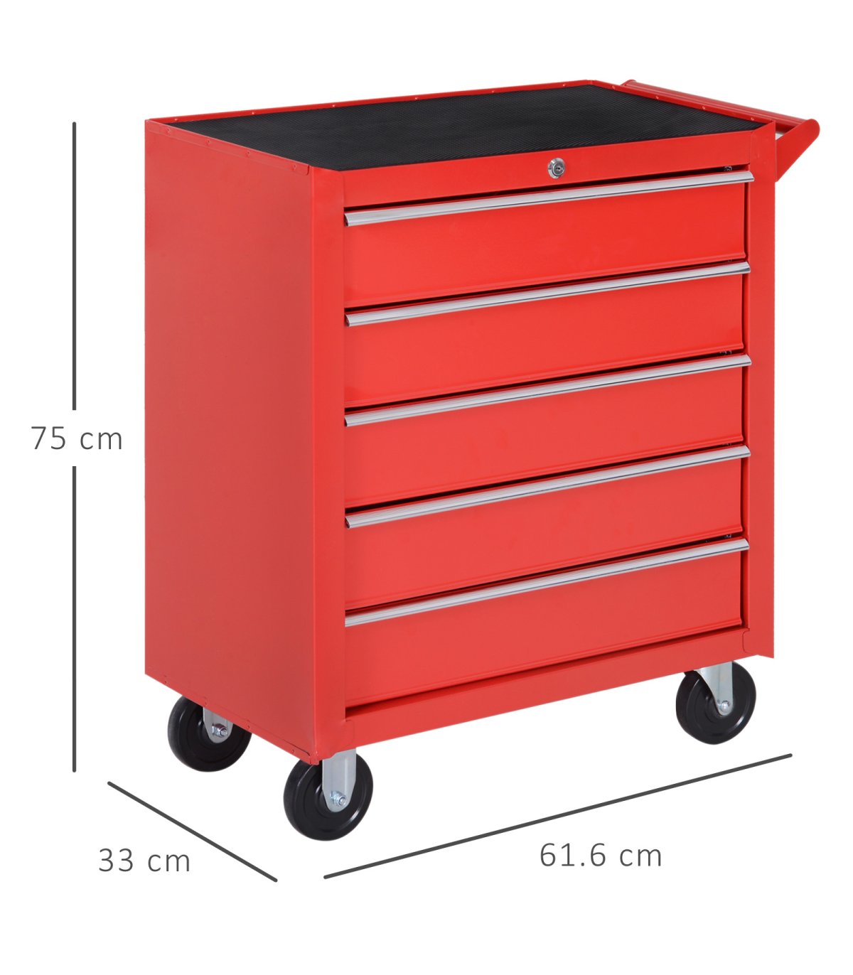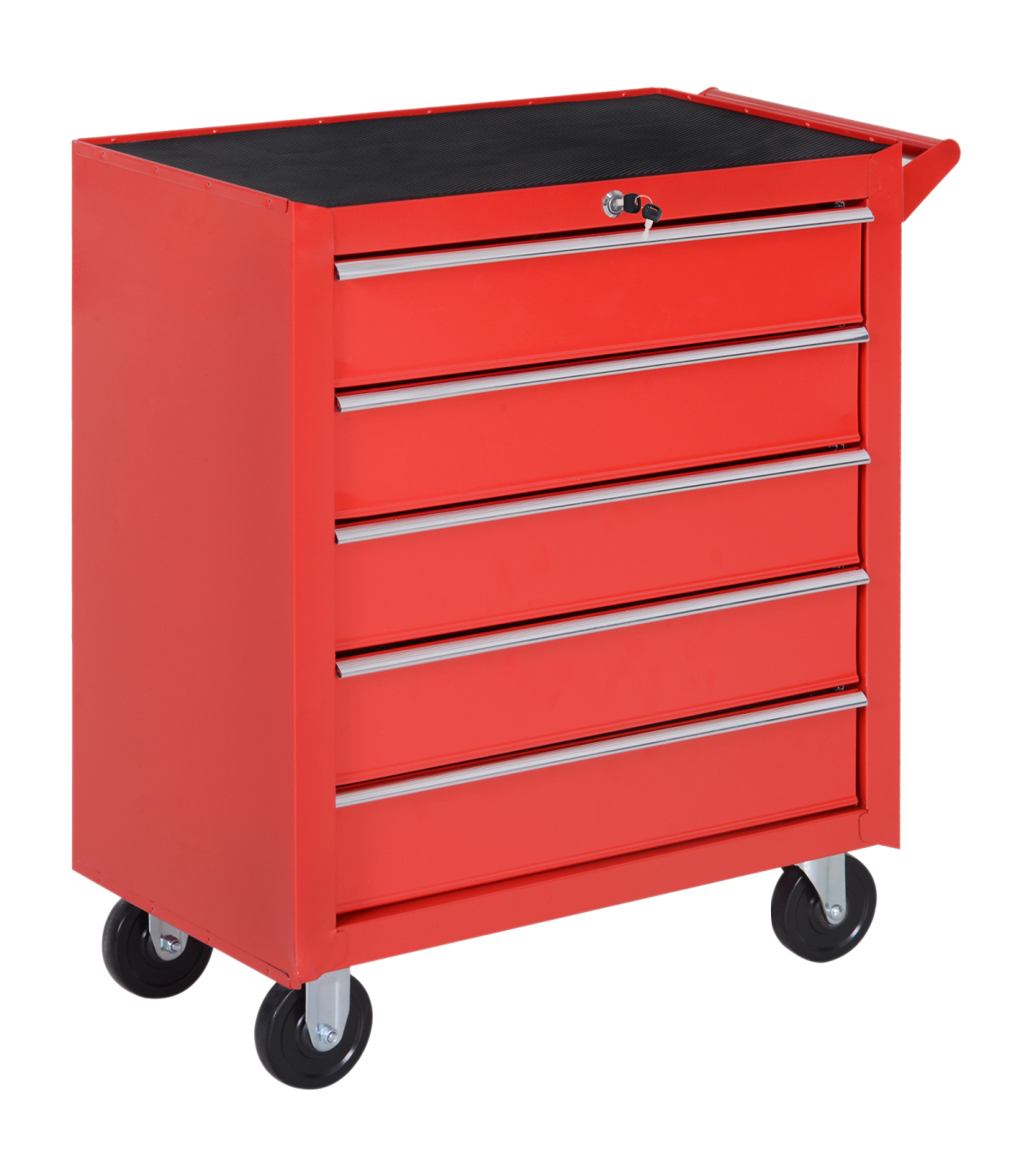 Durable steel body construction for superior resistance to scratches and corrosionDrawers and trays include a foam mat to help absorb oilSide handle and 4 wheels make this unit easy to move around smoothlyTop tool chest unit comes with a lock and keys for security when requiredOverall Size: 69L x 33W x 75H cm. Assembly required.