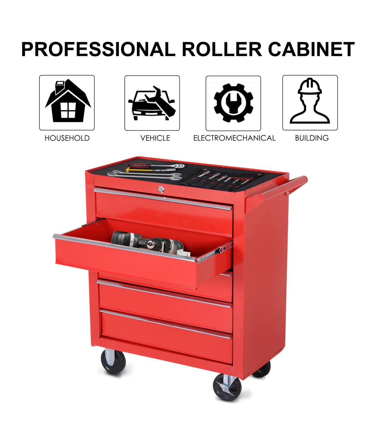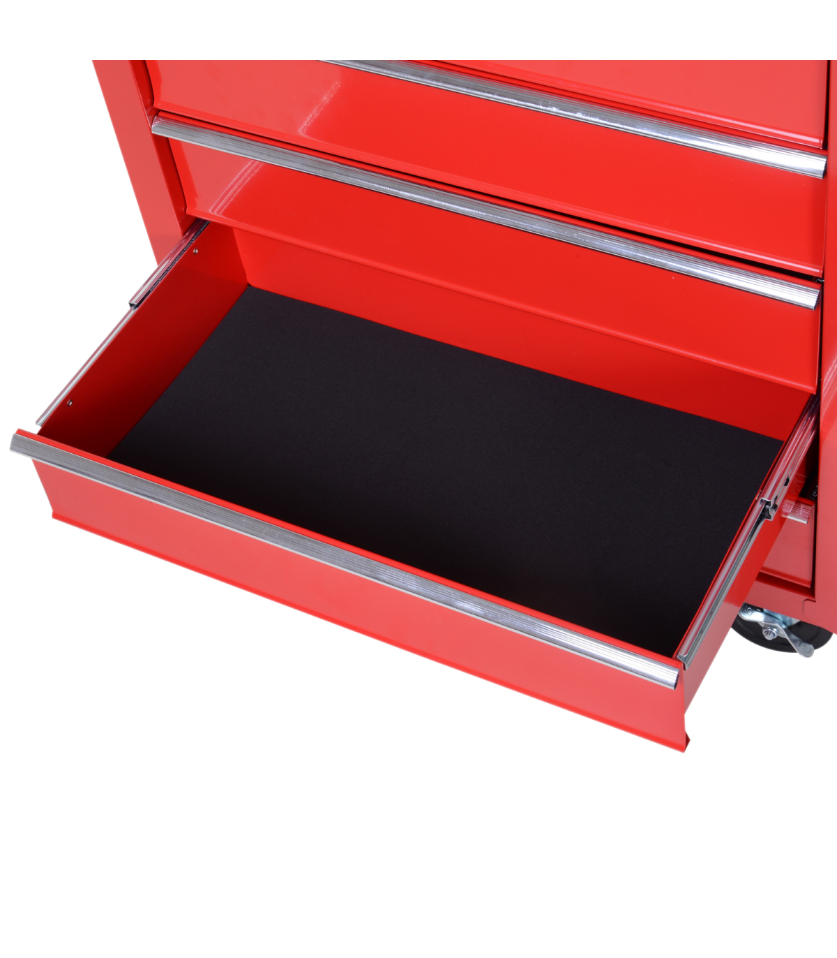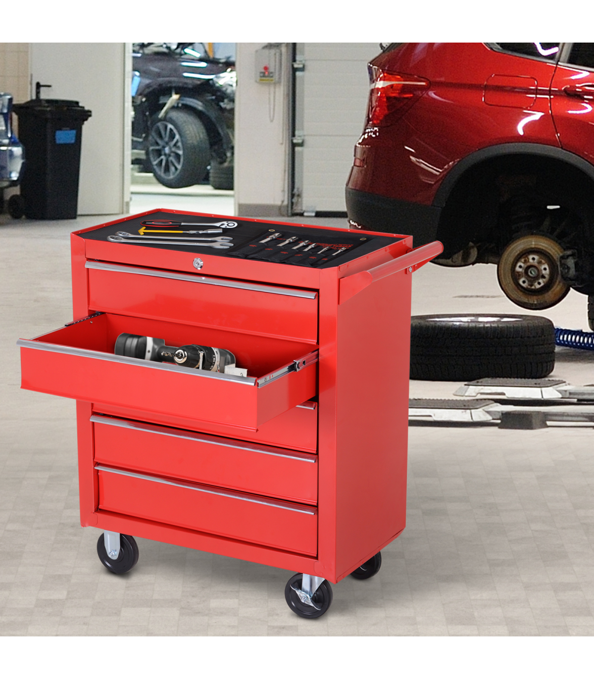 Durable steel body construction for superior resistance to scratches and corrosionDrawers and trays include a foam mat to help absorb oilSide handle and 4 wheels make this unit easy to move around smoothlyTop tool chest unit comes with a lock and keys for security when requiredOverall Size: 69L x 33W x 75H cm. Assembly required.