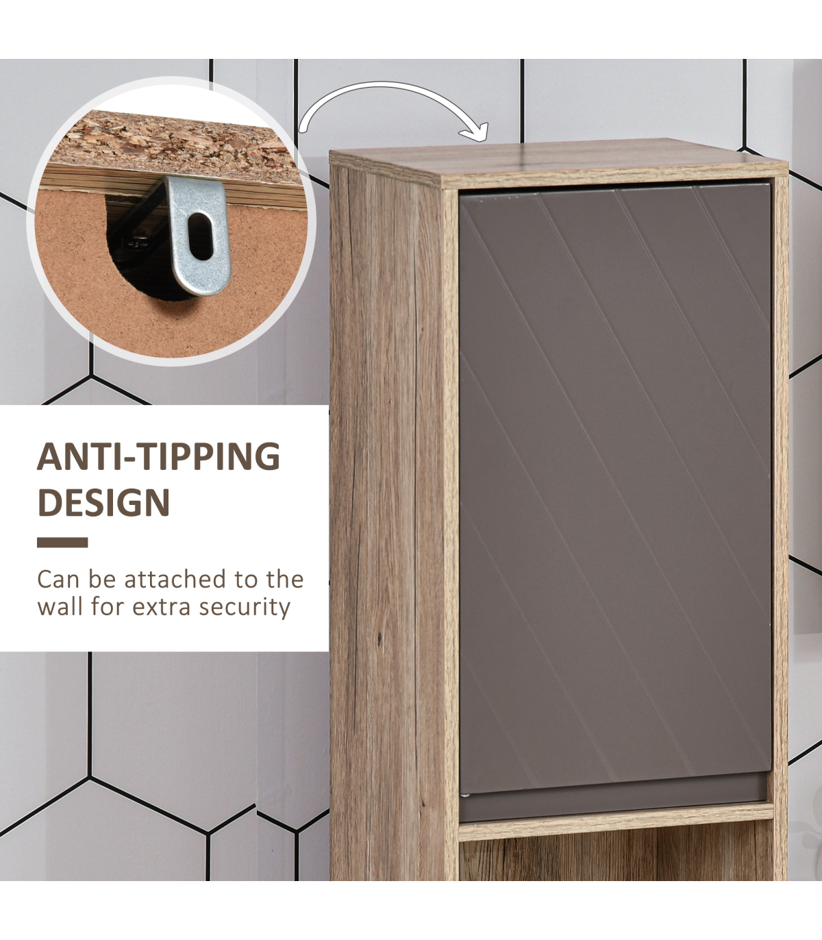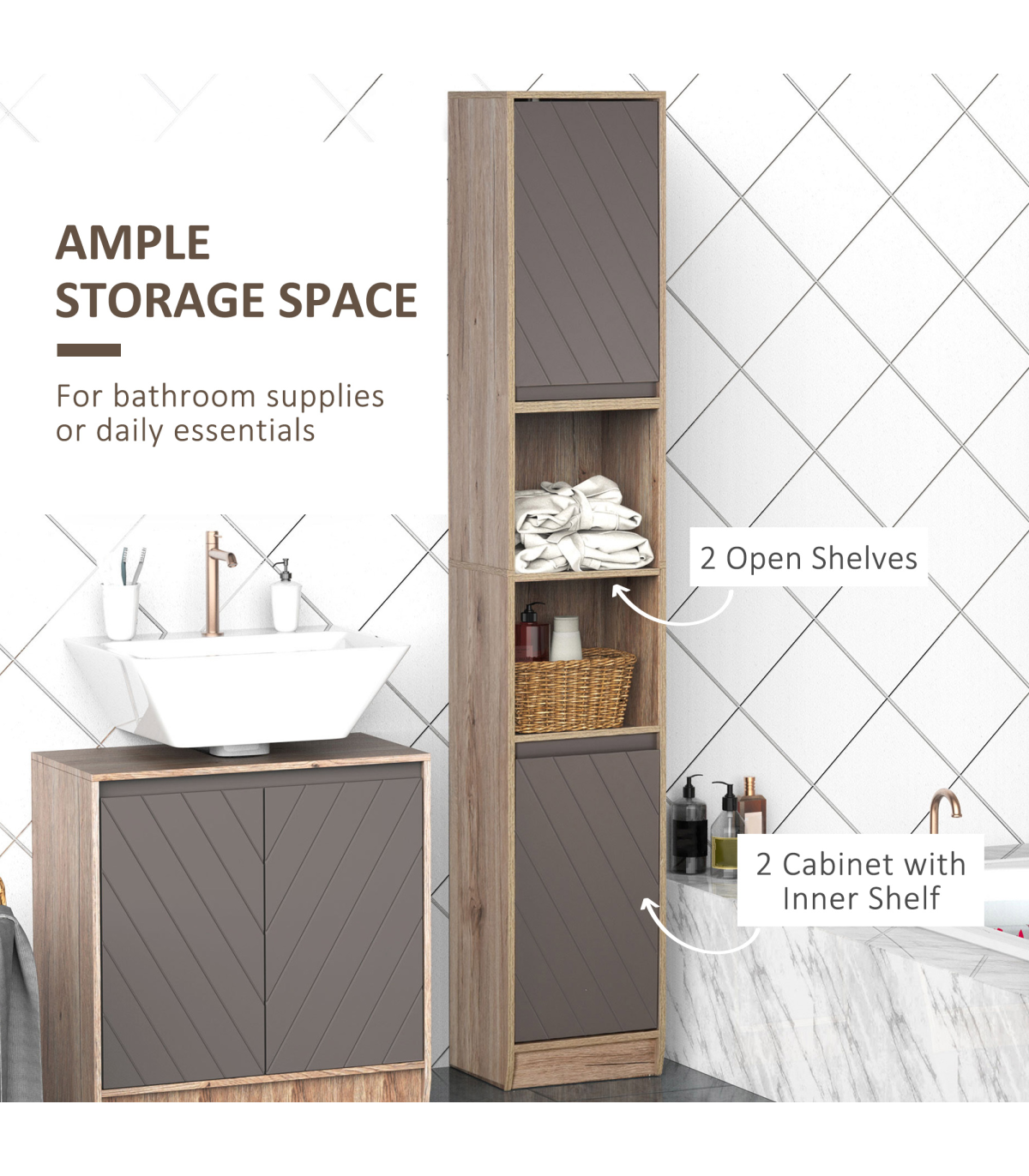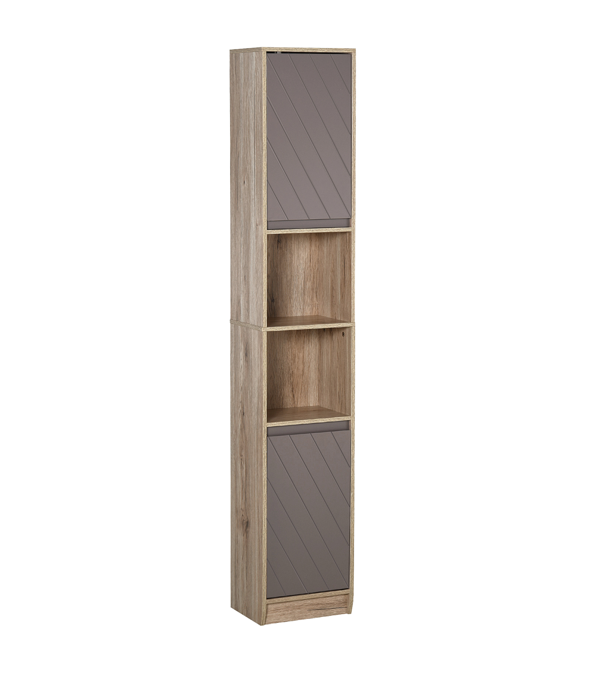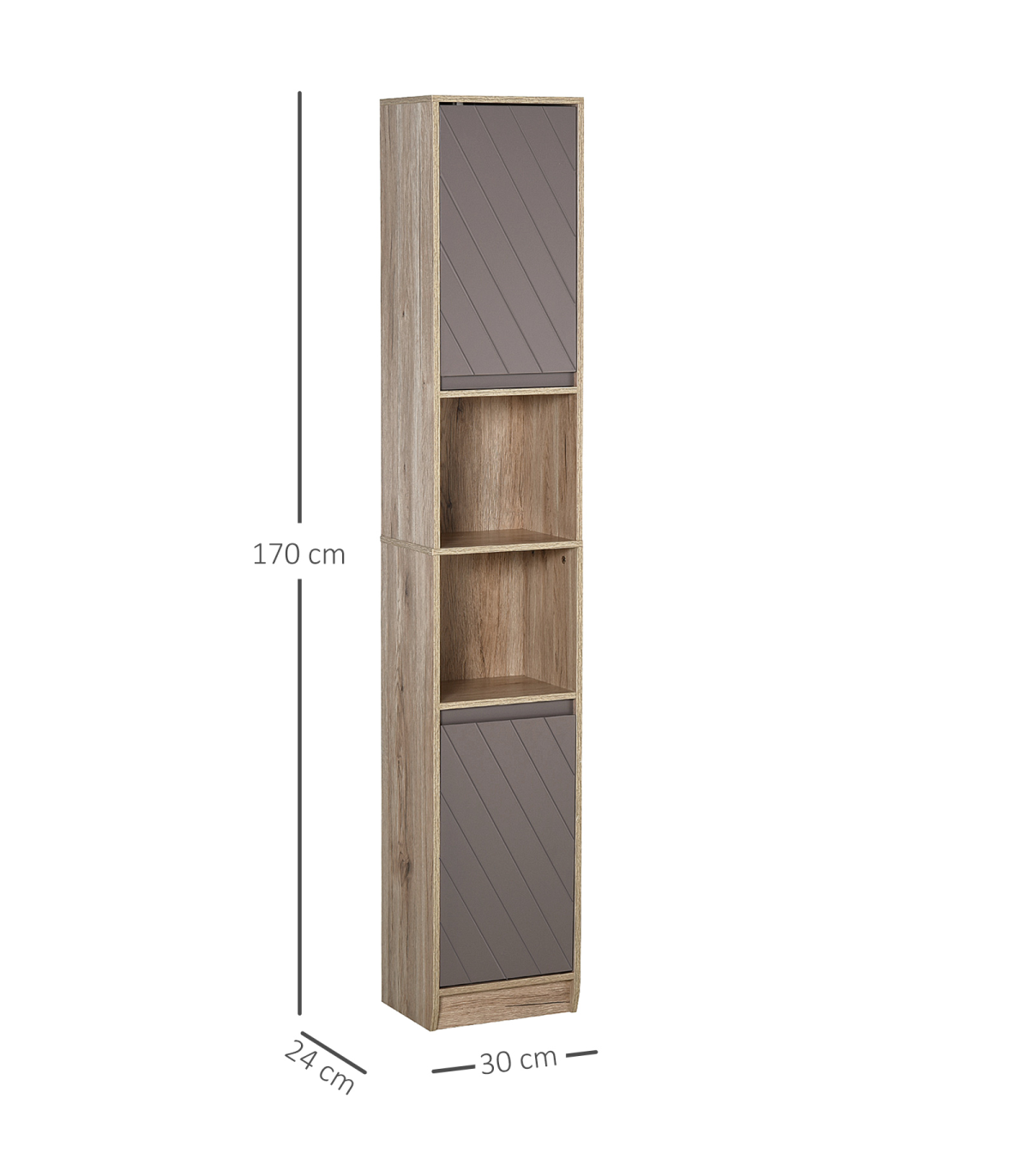 STURDY: Made from an MDF and particle board blend, the frame is solid and durable for reliable everyday use. Top coating for protection against moisture and easy maintenance.SPACIOUS: Features two cabinets with an adjustable shelf in both, as well as a middle open compartment: easy organisation of towels, bedding, toiletries and everything else.SPACE-SAVER: Tall and slimline design is great for bathroom with little space. Elevated base offers protection to the bottom to help reduce damage.ANTI-TIPPING: Attachment straps on back to offer safety around children and pets. DIMENSIONS: 170H x 30W x 24Dcm.MAXIMUM LOAD 50KG. ASSEMBLY REQUIRED.