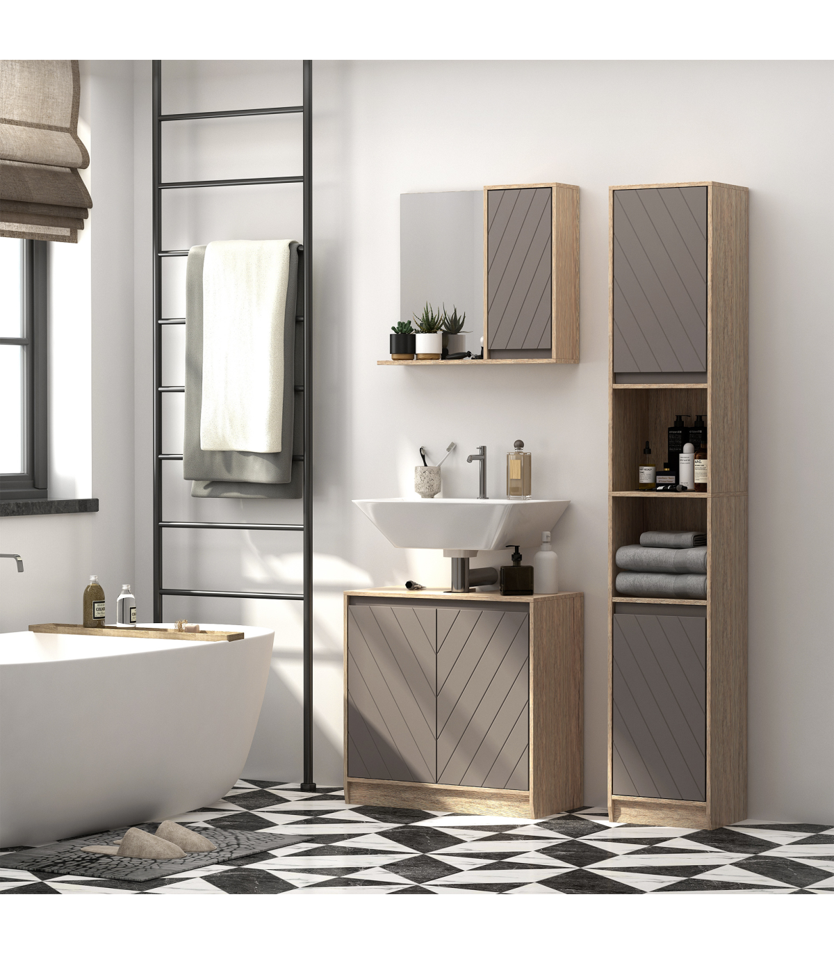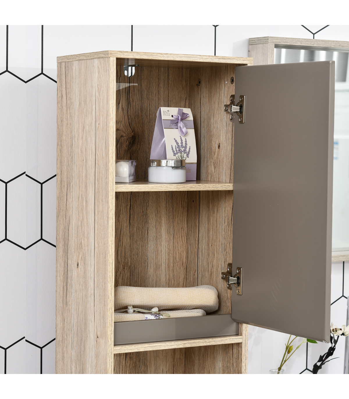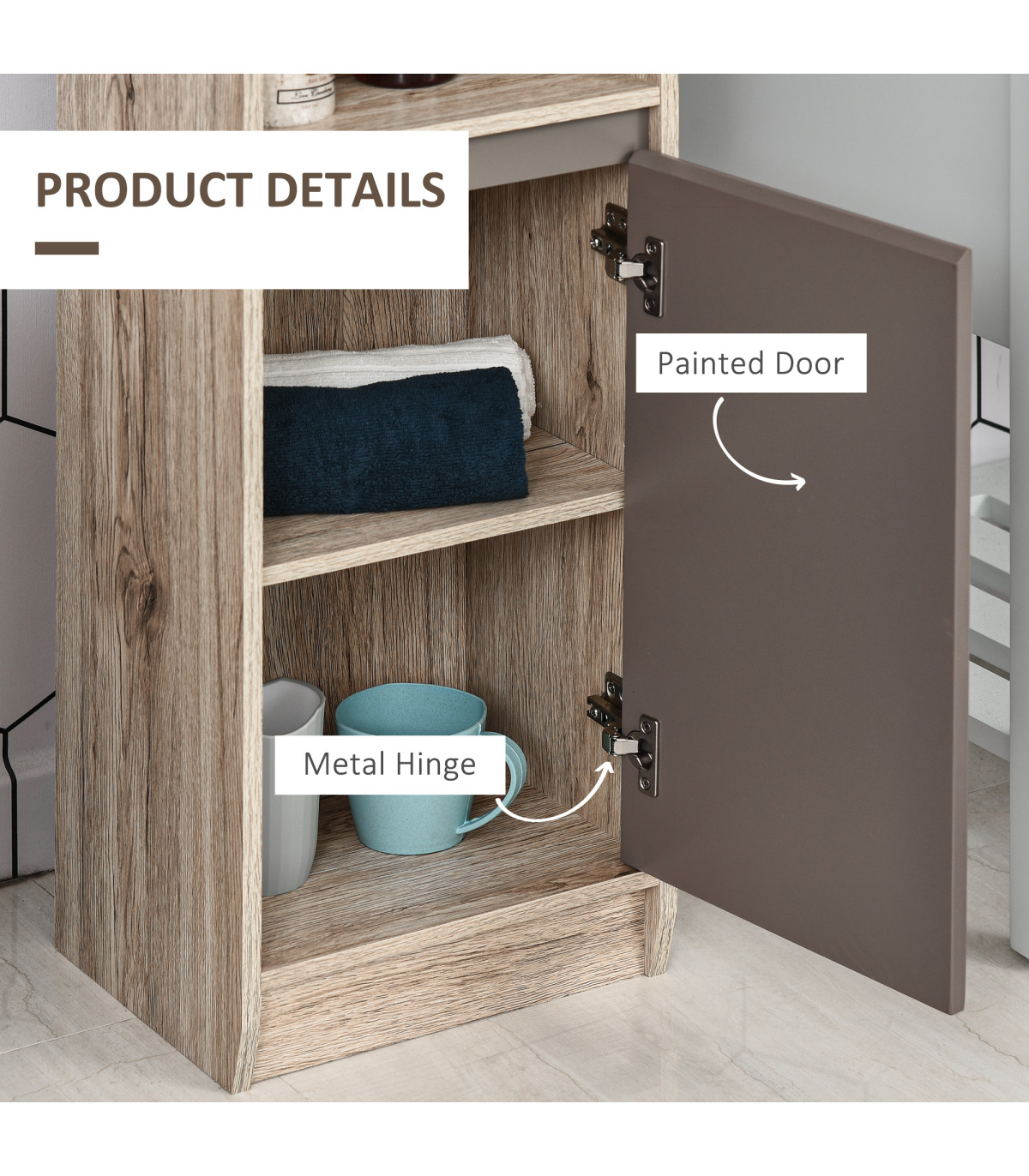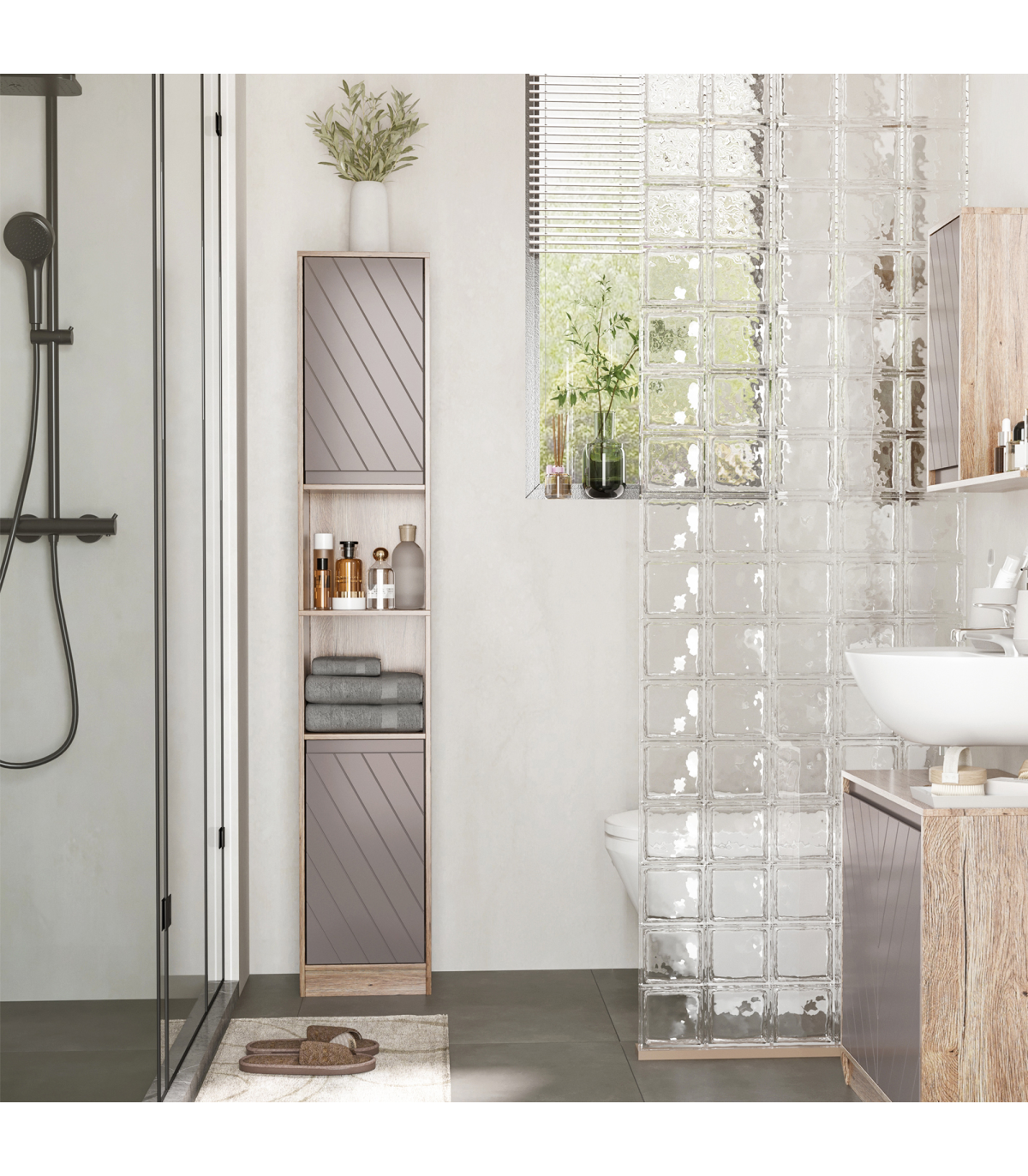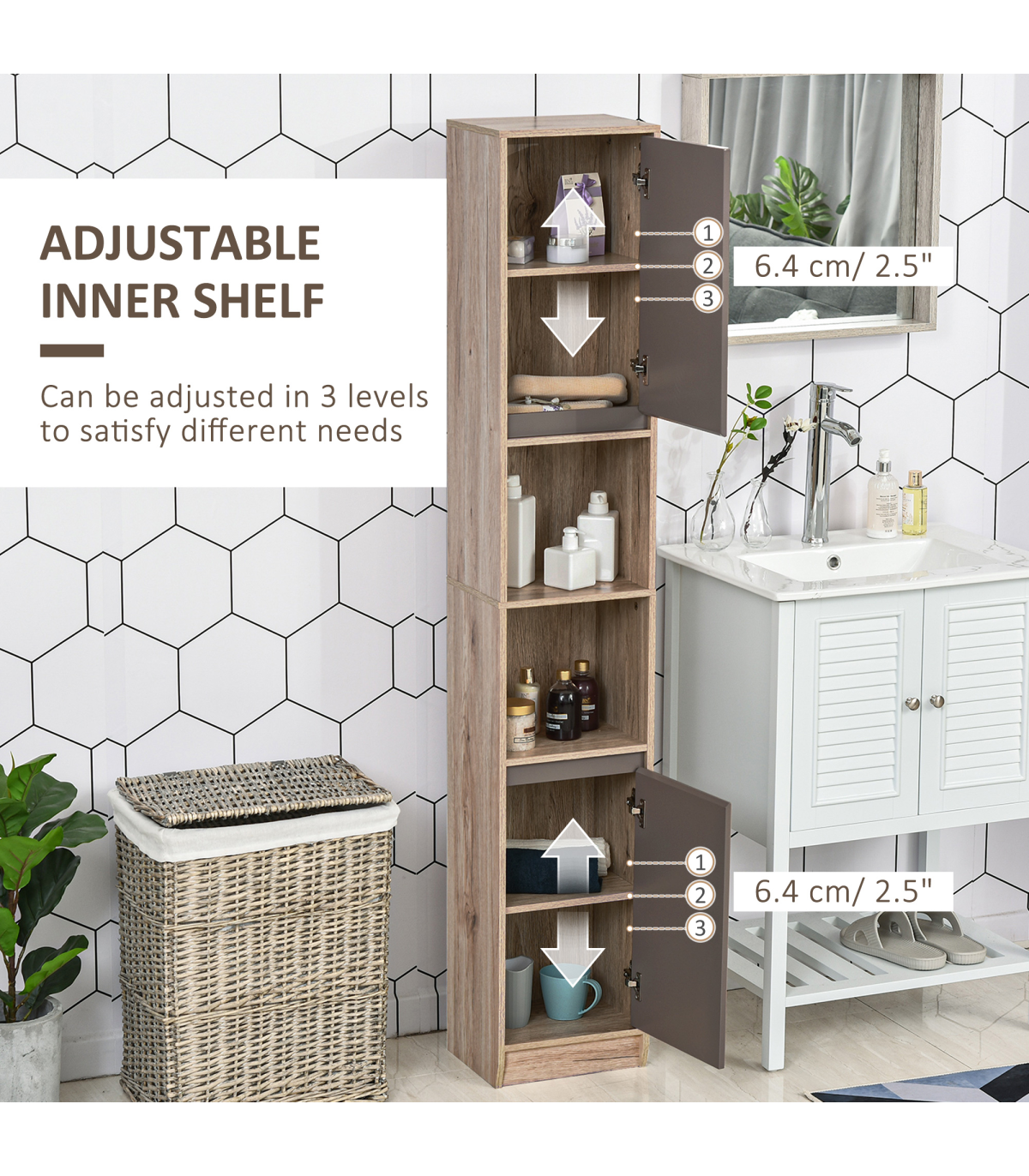STURDY: Made from an MDF and particle board blend, the frame is solid and durable for reliable everyday use. Top coating for protection against moisture and easy maintenance.SPACIOUS: Features two cabinets with an adjustable shelf in both, as well as a middle open compartment: easy organisation of towels, bedding, toiletries and everything else.SPACE-SAVER: Tall and slimline design is great for bathroom with little space. Elevated base offers protection to the bottom to help reduce damage.ANTI-TIPPING: Attachment straps on back to offer safety around children and pets. DIMENSIONS: 170H x 30W x 24Dcm.MAXIMUM LOAD 50KG. ASSEMBLY REQUIRED.