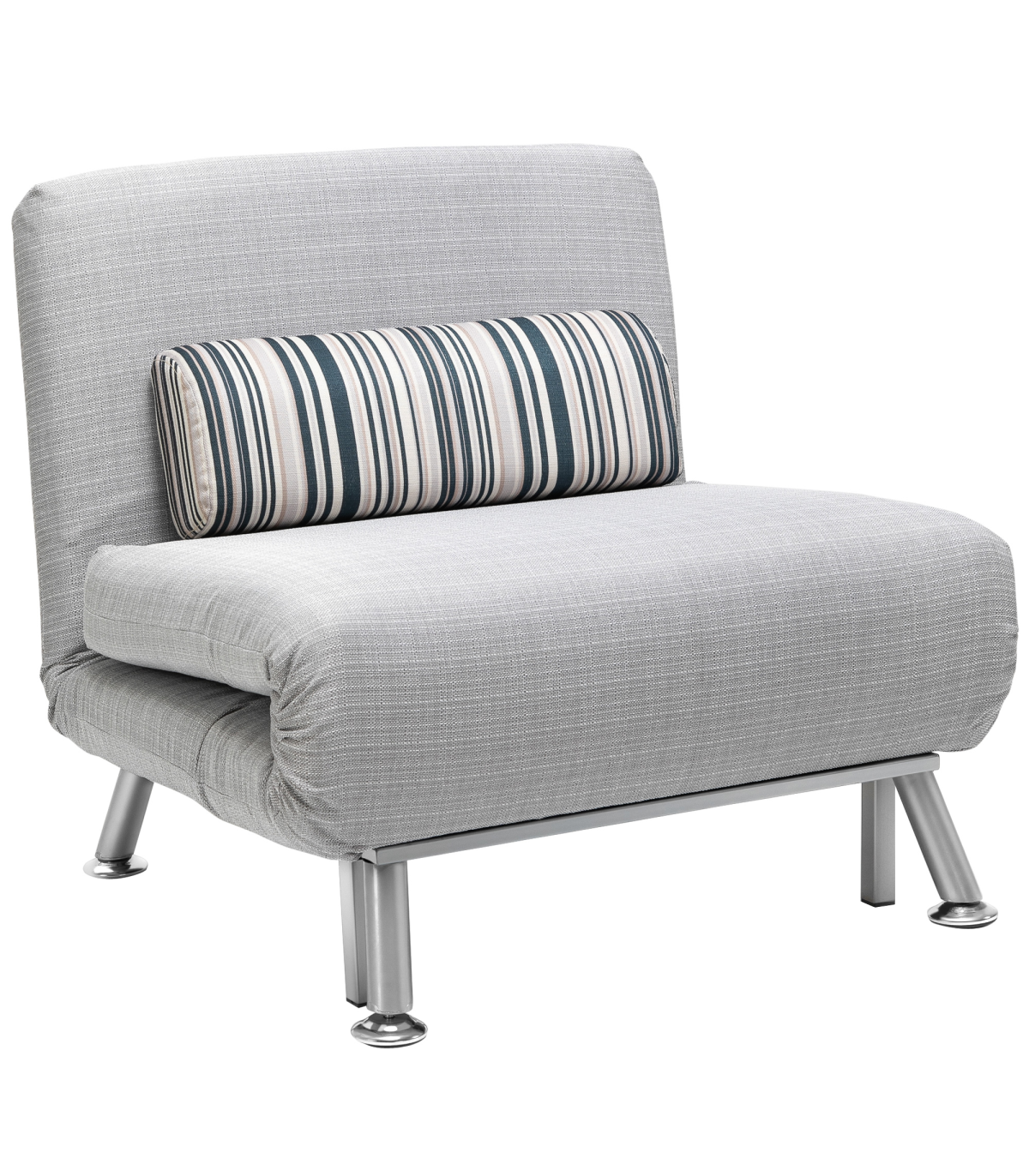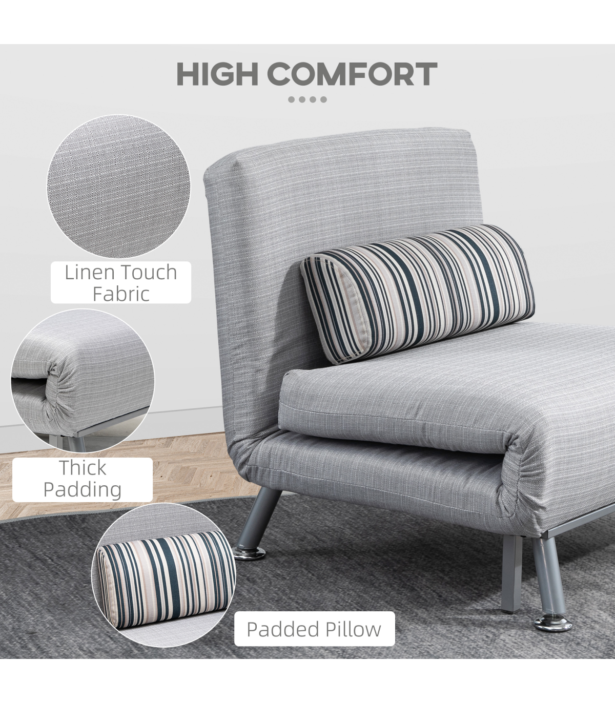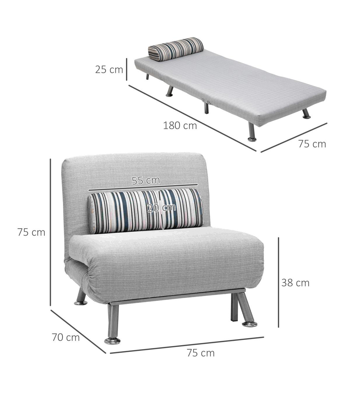 Convertible design, five-position back: Swiftly switches from an armless chair to single bed, making it easily to set up. Set the back to a position you want. Ideal for homes short on space.Comfortable: Thick foam for you to sink in comfortably and ensure you'll get a get good night's sleep with a removable pillow too. The back of the single sofa bed chair can be adjusted to five different levels, allowing you to be in control of your comfort.Steel frame: Small sofa bed has a strong core, keeping you supported and steady when resting and sleeping.Linen-look upholstery: Breathable and beautiful, smooth on the skin so it doesn't rub against your skin.Dimensions: Seat: 75H x 75W x 70Dcm. Bed: 25H x 180L x 75Wcm. Weight Capacity: 150kg. Assembly required.