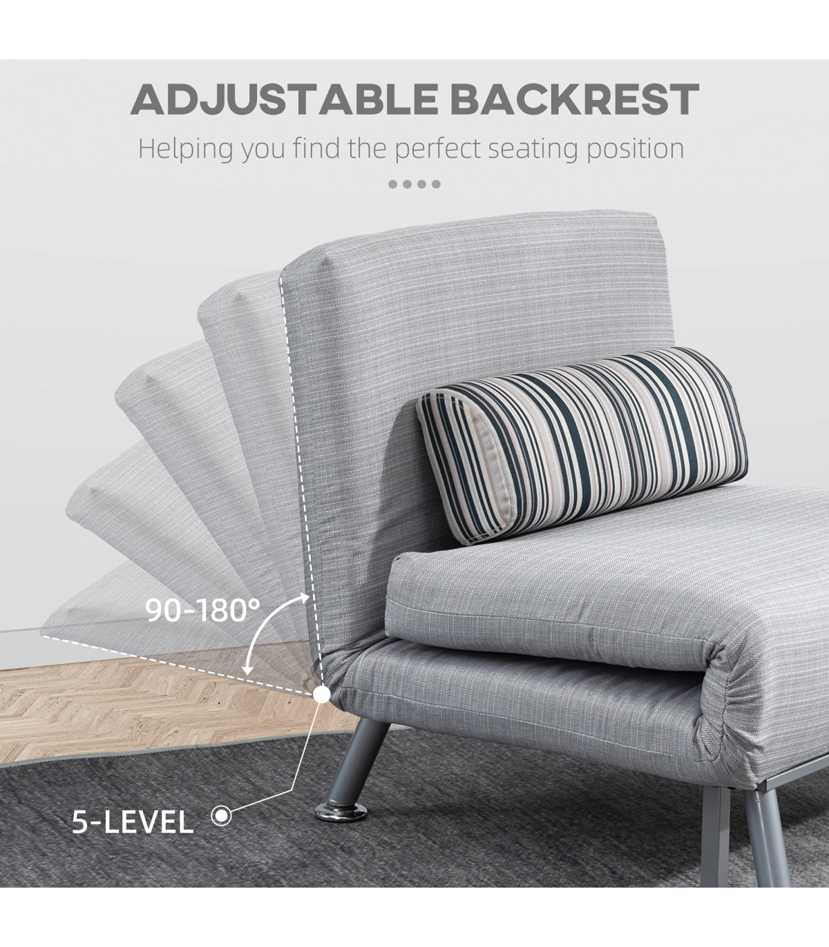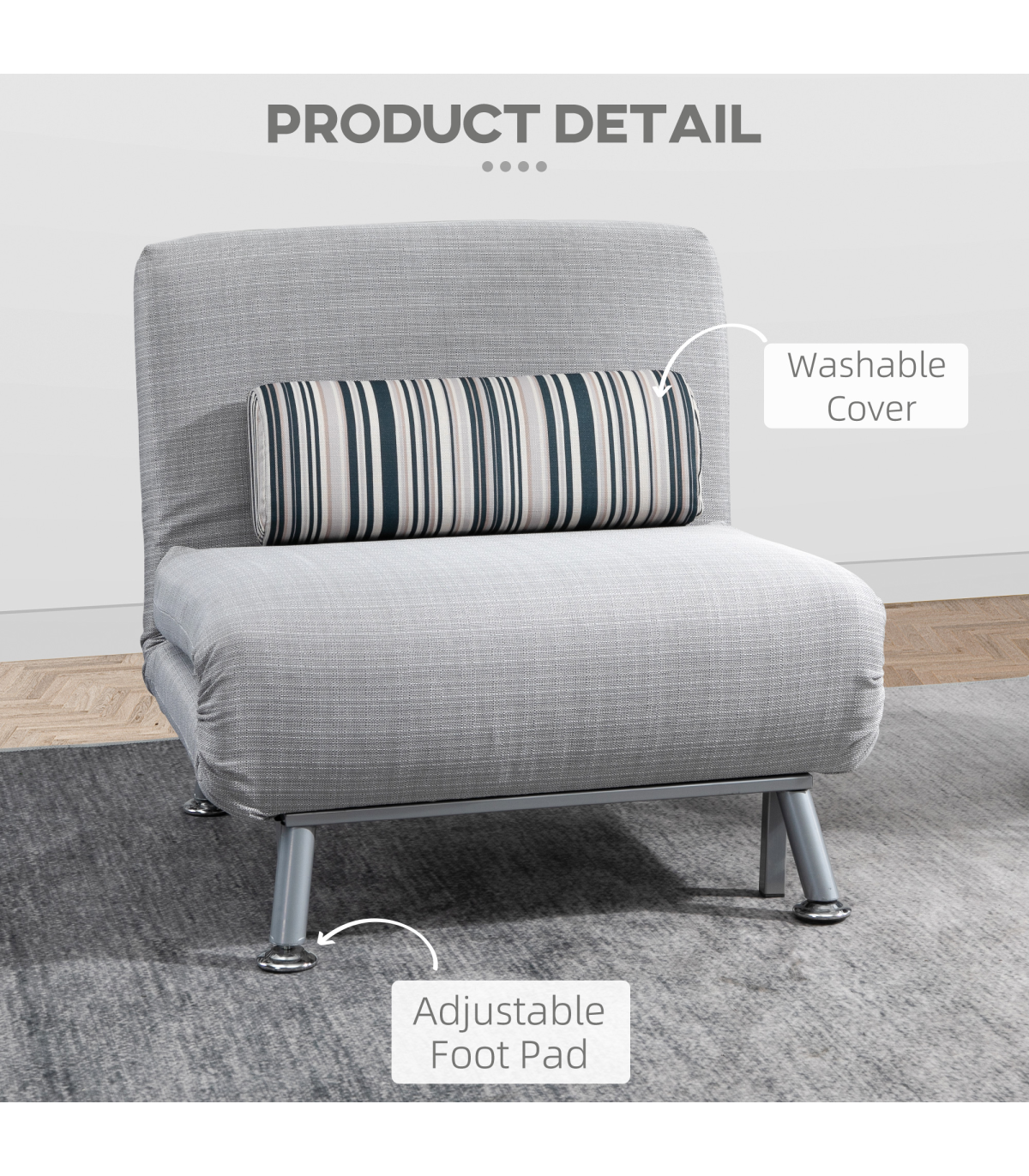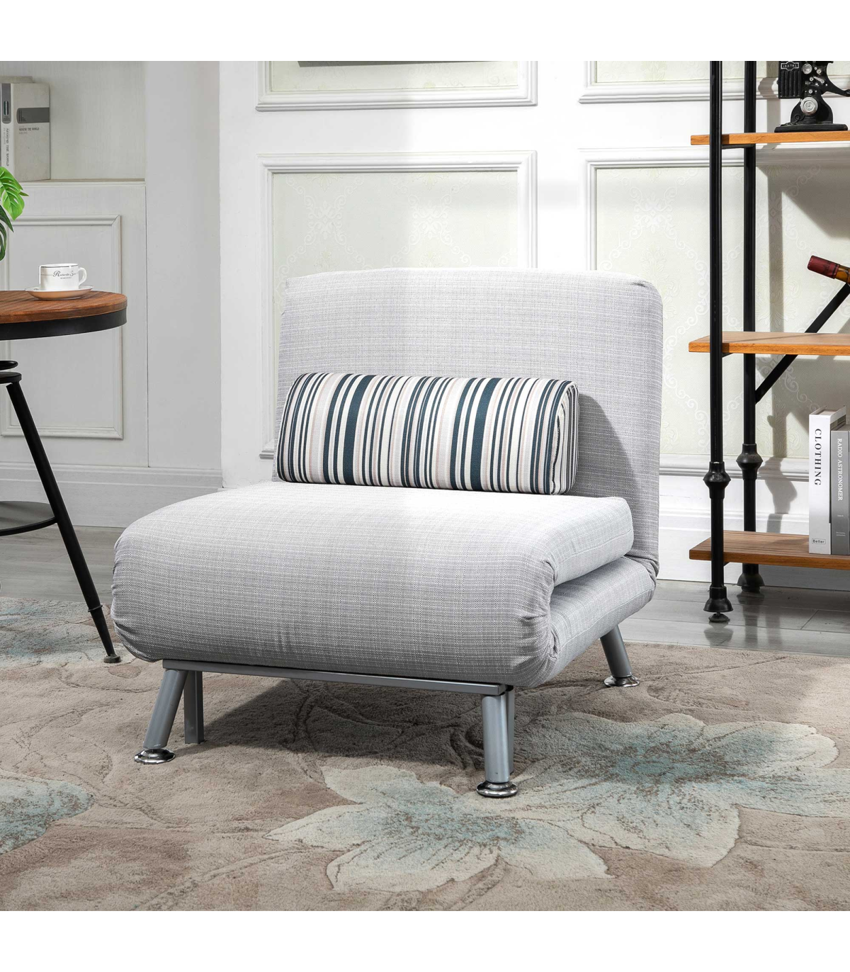 Convertible design, five-position back: Swiftly switches from an armless chair to single bed, making it easily to set up. Set the back to a position you want. Ideal for homes short on space.Comfortable: Thick foam for you to sink in comfortably and ensure you'll get a get good night's sleep with a removable pillow too. The back of the single sofa bed chair can be adjusted to five different levels, allowing you to be in control of your comfort.Steel frame: Small sofa bed has a strong core, keeping you supported and steady when resting and sleeping.Linen-look upholstery: Breathable and beautiful, smooth on the skin so it doesn't rub against your skin.Dimensions: Seat: 75H x 75W x 70Dcm. Bed: 25H x 180L x 75Wcm. Weight Capacity: 150kg. Assembly required.