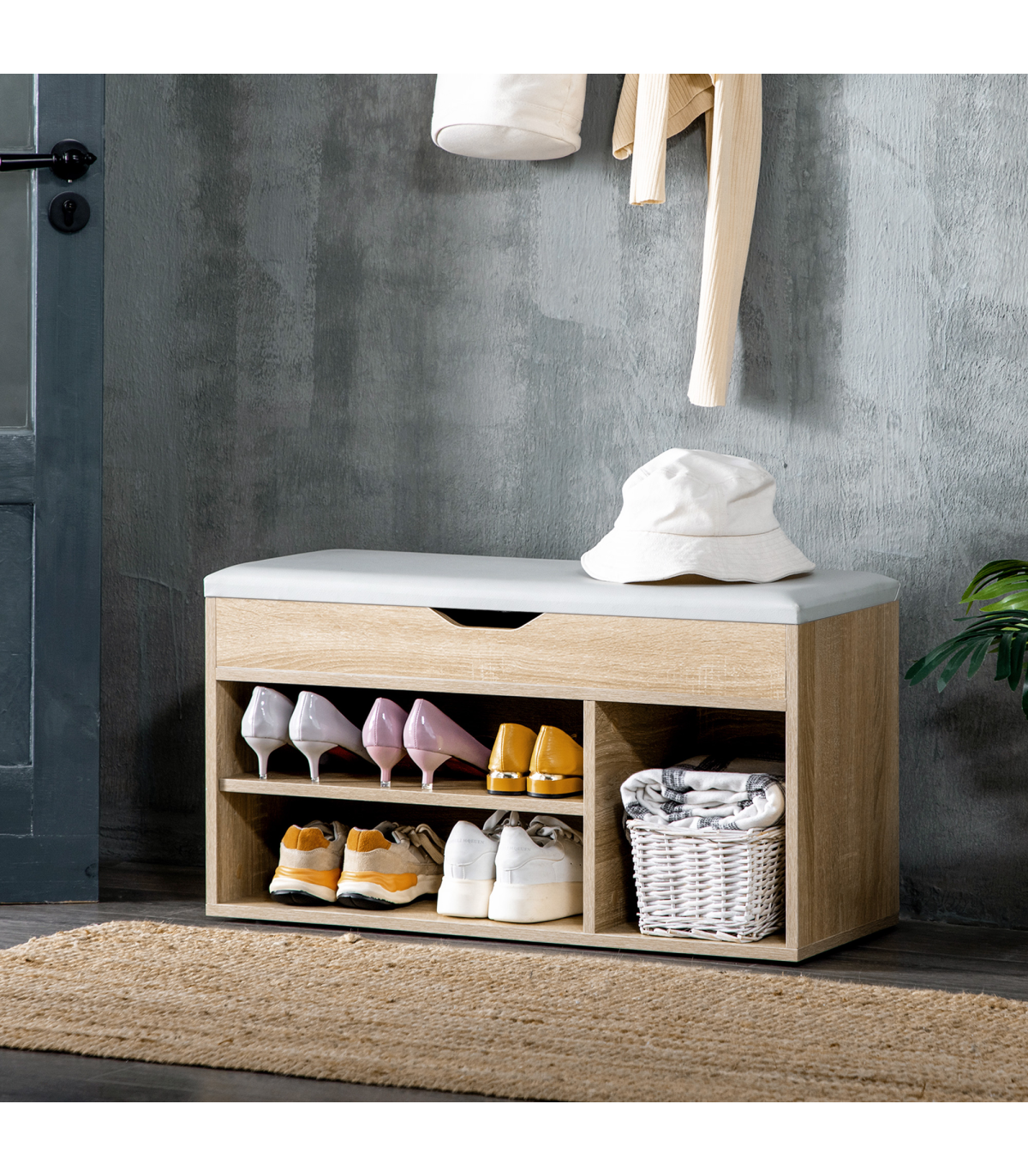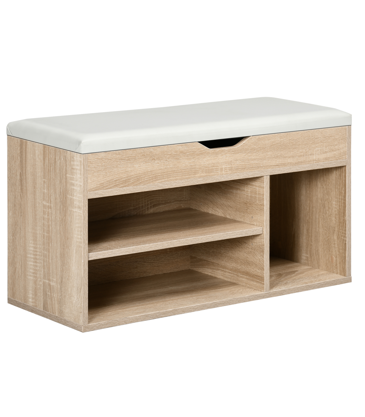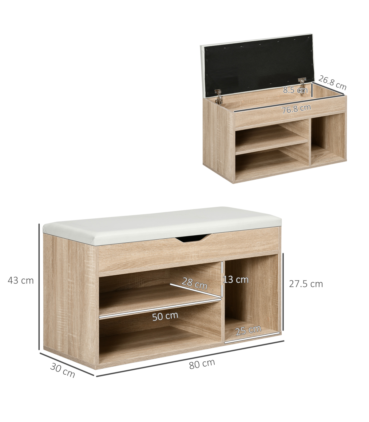 Open storage: Keeps shoes within easy reach, features three compartments for organisation. Small concealed top area, with a cut-out handle for safe opening and closing. Left hand shelf can be moved up/down.MDF frame: Durable and reliable structure for everyday use. Finished in an oak wood effect for beauty. Bottom plastic feet protect floor. Side handles for easy movement.Padded top: Filled with foam, it ensures you'll be sitting comfortably - perfect for when putting shoes on.Dimensions: 43H x 80W x 30Dcm. Right compartment: 27.5H x 25W x 28.5Dcm. Left compartment: 13H x 50W x 28Dcm.Maximum weight 120kg, assembly required