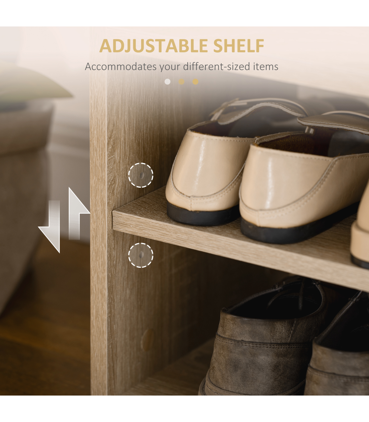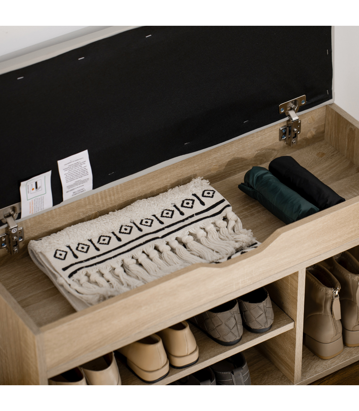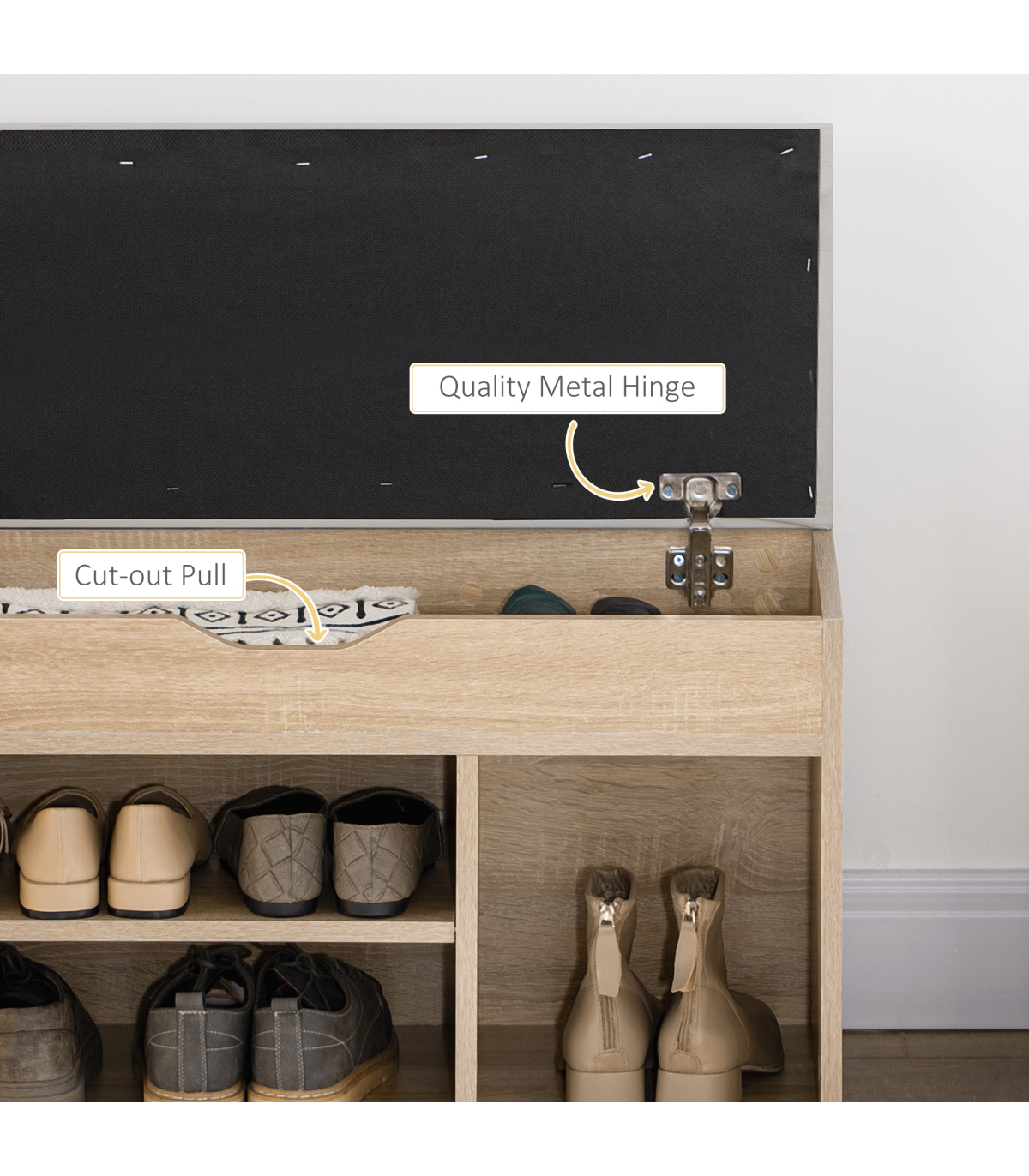 Open storage: Keeps shoes within easy reach, features three compartments for organisation. Small concealed top area, with a cut-out handle for safe opening and closing. Left hand shelf can be moved up/down.MDF frame: Durable and reliable structure for everyday use. Finished in an oak wood effect for beauty. Bottom plastic feet protect floor. Side handles for easy movement.Padded top: Filled with foam, it ensures you'll be sitting comfortably - perfect for when putting shoes on.Dimensions: 43H x 80W x 30Dcm. Right compartment: 27.5H x 25W x 28.5Dcm. Left compartment: 13H x 50W x 28Dcm.Maximum weight 120kg, assembly required