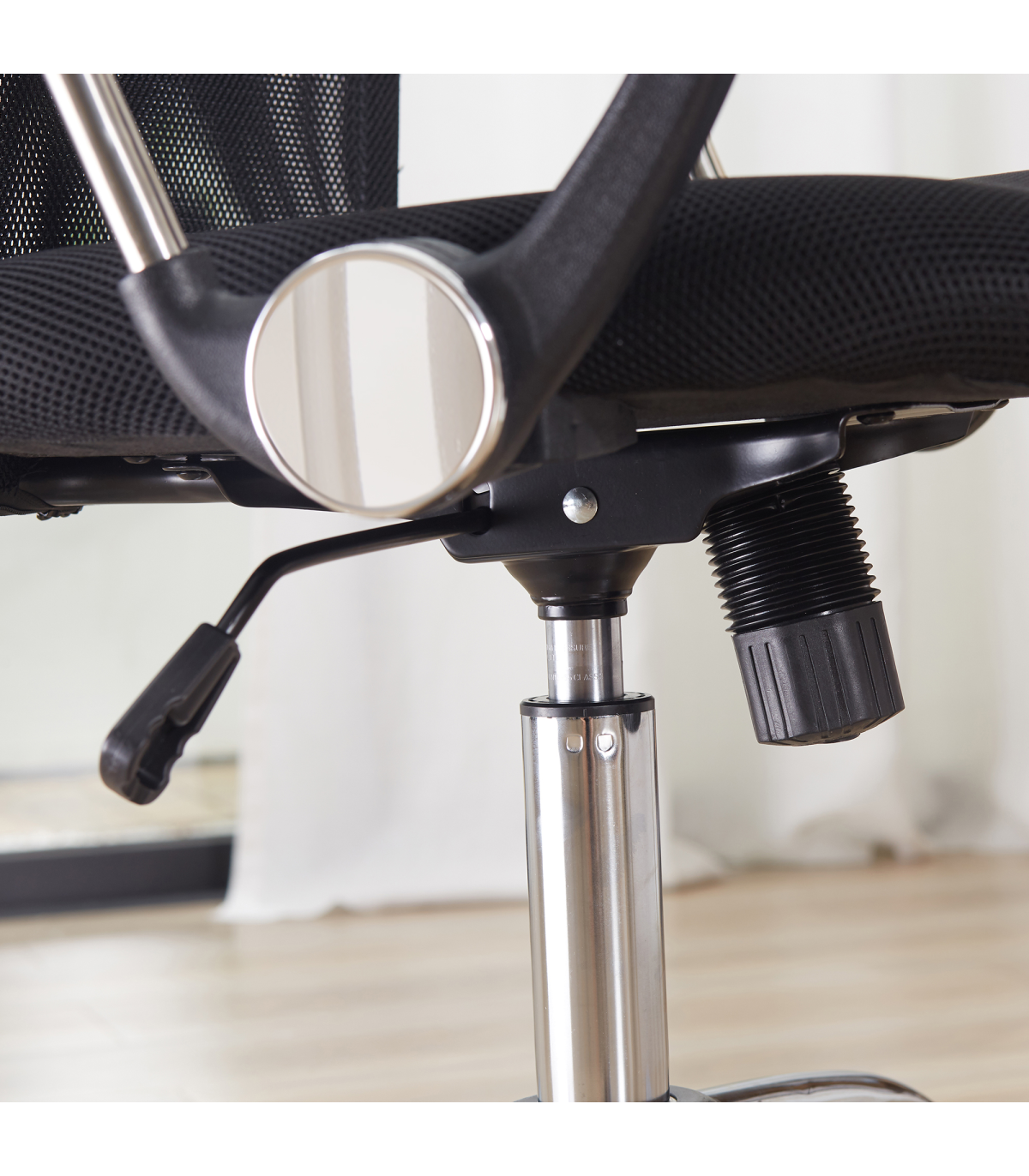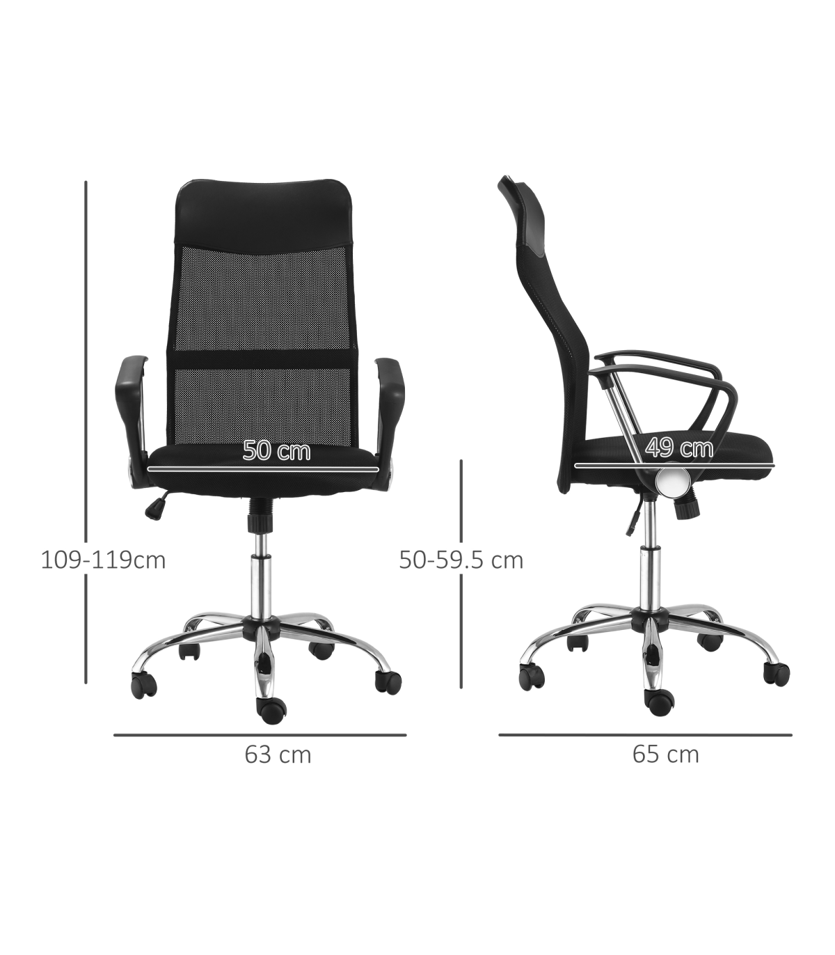 Comfortable office chair: Thick sponge padding seat, high back and armrests, swivel seat and adjustable height - this computer chair keeps you comfortable and supported.50-59.5cm height: A desk chair which is easily adjustable - set it to a level best for you. Match it to your desk to prevent straining your body.Stylish: A mesh office chair, with a faux leather top panel - a modern update. It's cool and will look good wherever you choose to have it.Five wheels: Move this swivel chair wherever you want - whether seated or empty.Dimensions: 109-119H x 63W x 65Dcm. Seat: 50-59.5H x 50W x 49Dcm. Maximum load 120kg. Assembly required.