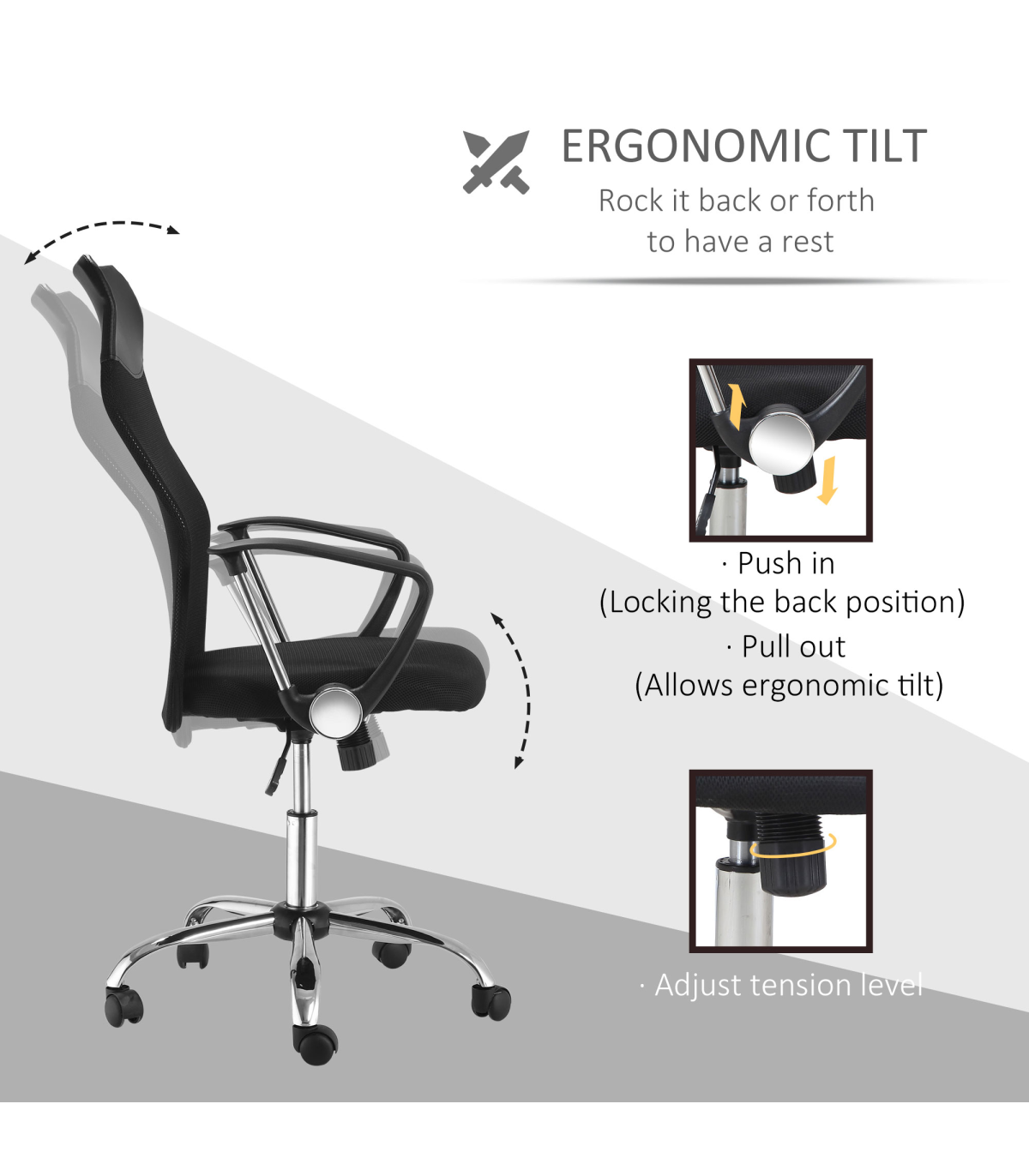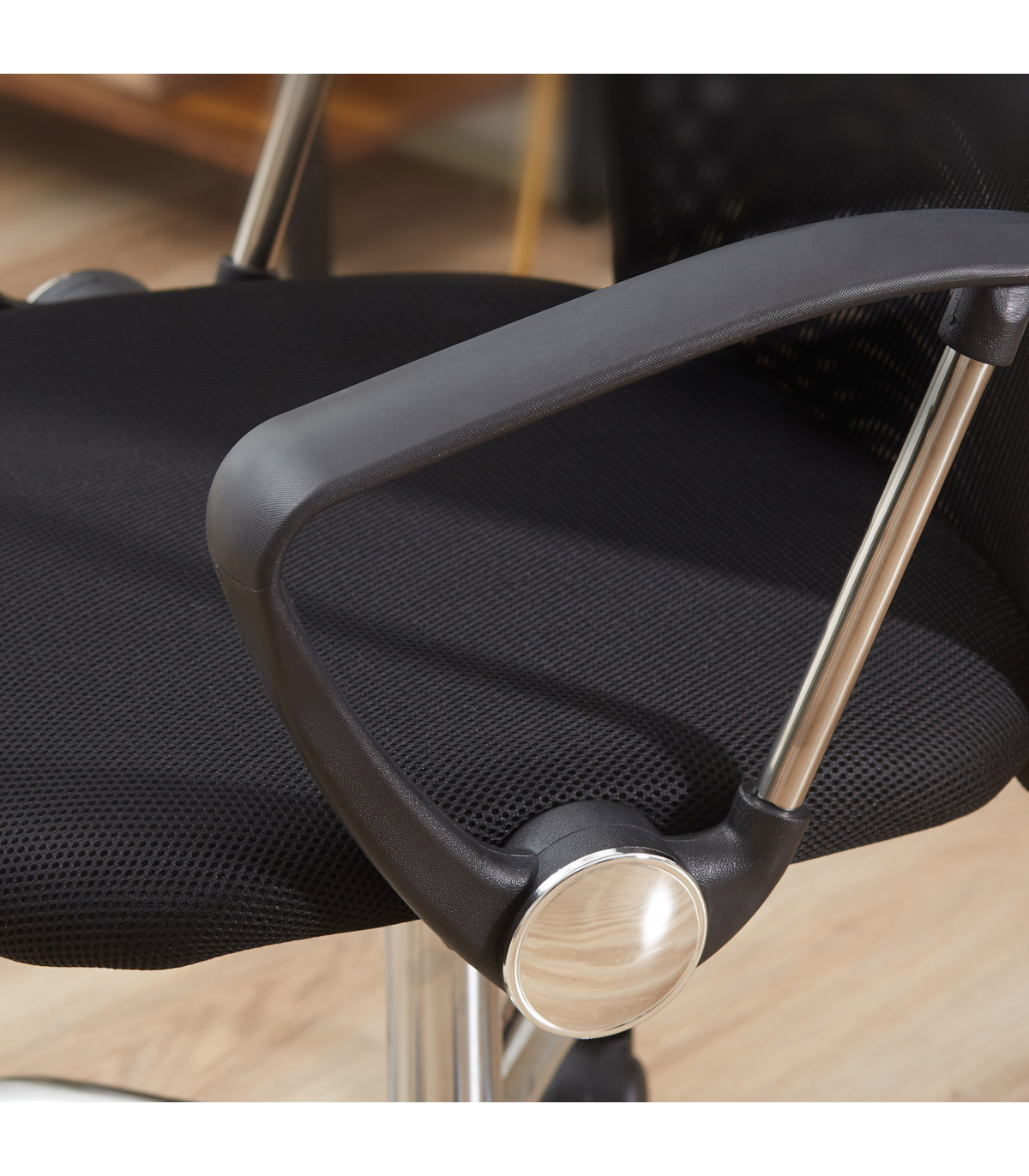 A mesh chair, with a stylish extra touch - this HOMCOM piece. Comfortable features are adjustable height, swivelling chair, padded seat, high back, and armrests - keeping you supported and comfortable at the same time. The main mesh is complemented with a top faux leather panel for a sleek update. Adjust the seat height to sit level at your desk. Completed with five wheels.