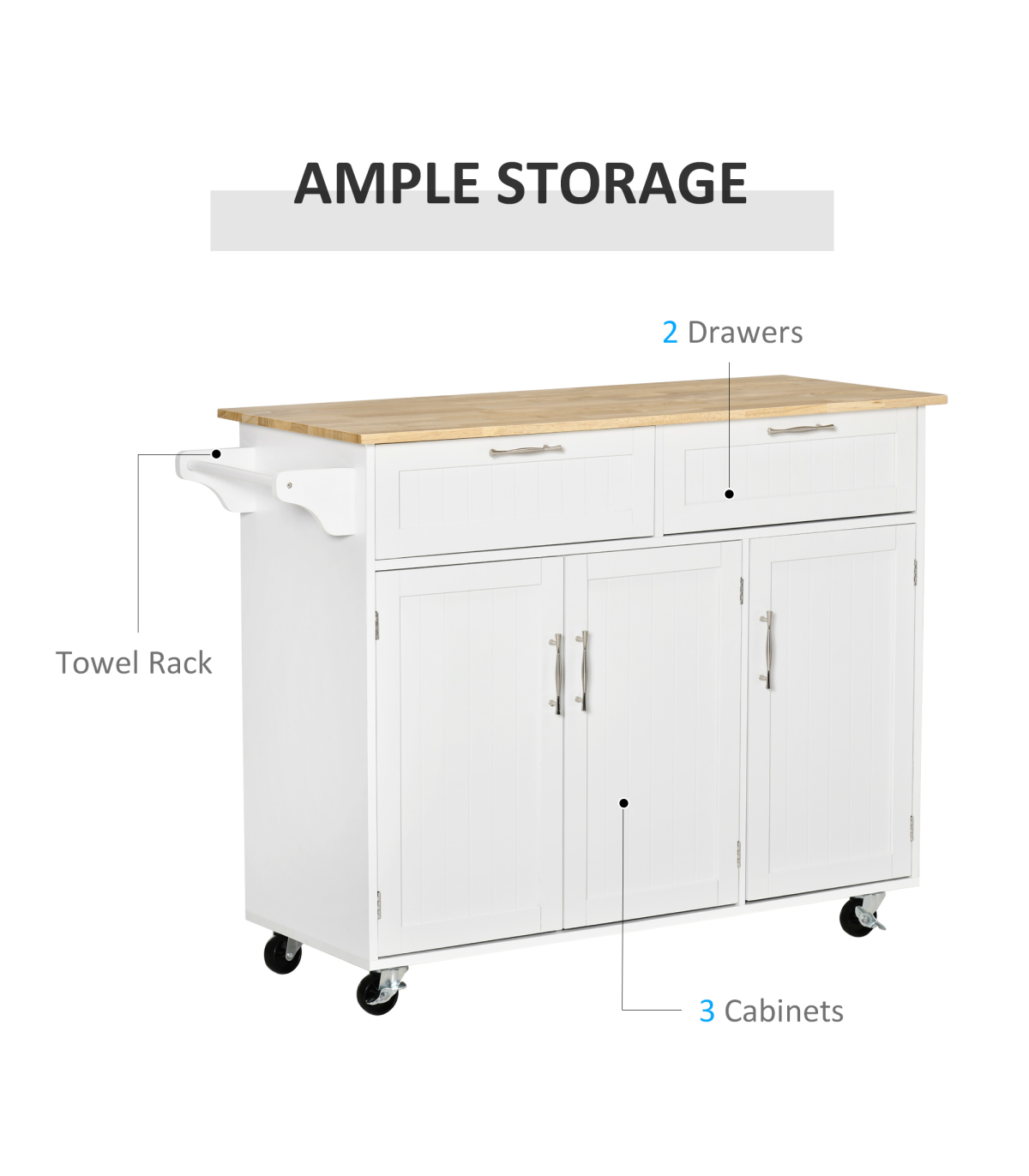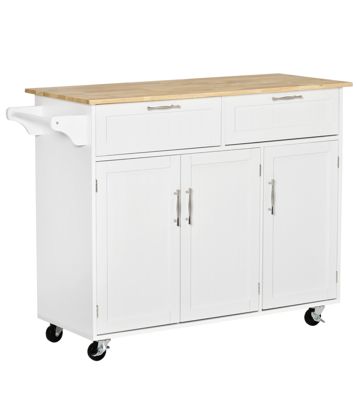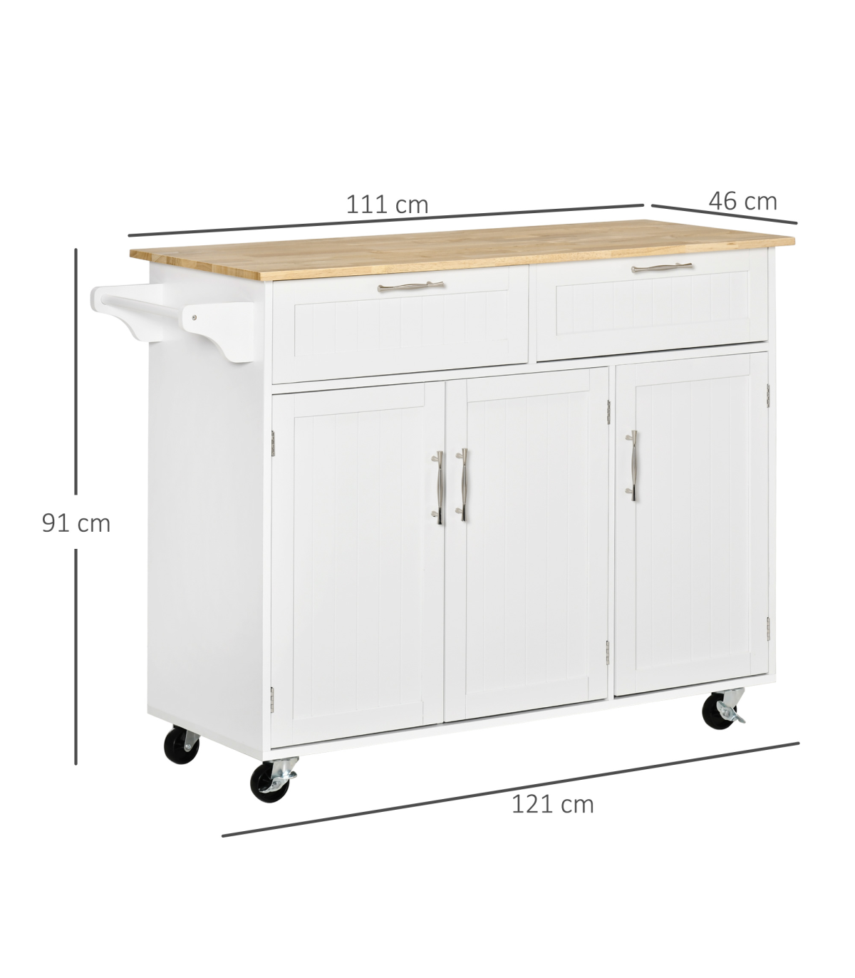 MULTI-STORAGE: Two drawers, three cabinets and a kitchen towel rail, lots of storage for utensils, crockery, glassware, food and beyond. Three-level adjustable shelf in each cupboard.WOODEN COUNTERTOP: A solid and reliable place for you to work - cutting and preparing food, or as extra holding space. Varnished surface for extra protection.MODERN: Clean white colour, paired with the wooden top is subtle and fresh. Polished metal handles for a sleek touch.FOUR WHEELS: Easy to move, two with locks. DIMENSIONS: 91H x 121W x 46Dcm. Drawer inner: 11.5H x 46W x 29Dcm. Cupboard inner: 60H x 33W x 36.5Dcm.MAXIMUM LOAD 50KG. ASSEMBLY REQUIRED.