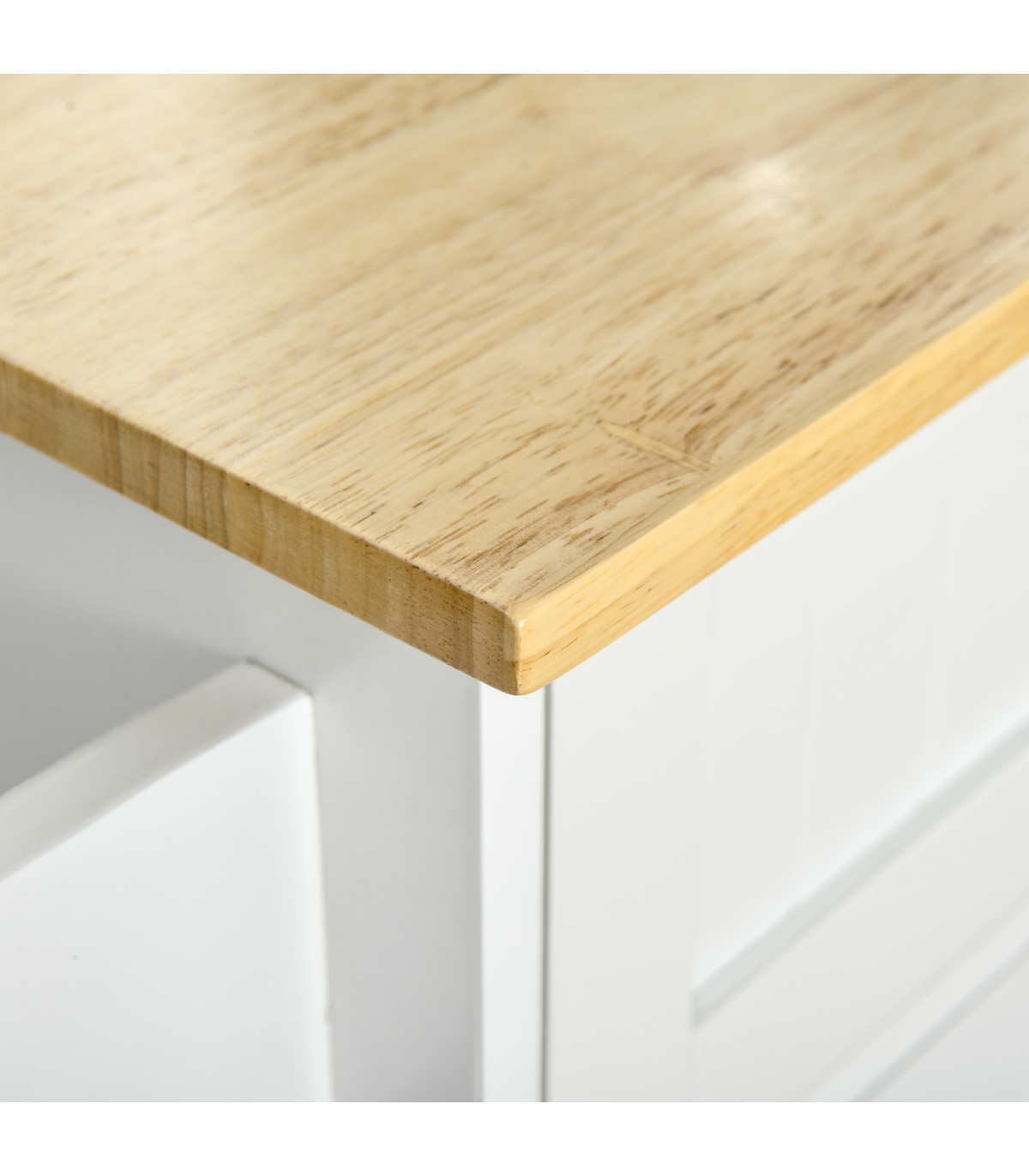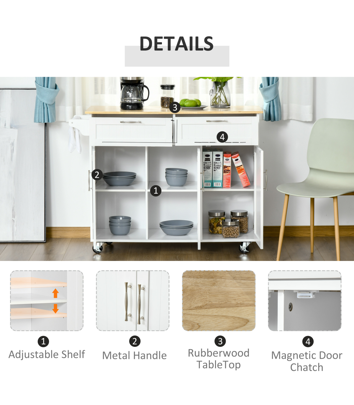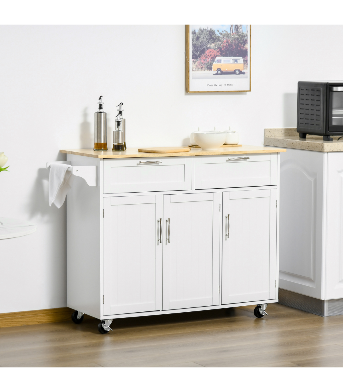 MULTI-STORAGE: Two drawers, three cabinets and a kitchen towel rail, lots of storage for utensils, crockery, glassware, food and beyond. Three-level adjustable shelf in each cupboard.WOODEN COUNTERTOP: A solid and reliable place for you to work - cutting and preparing food, or as extra holding space. Varnished surface for extra protection.MODERN: Clean white colour, paired with the wooden top is subtle and fresh. Polished metal handles for a sleek touch.FOUR WHEELS: Easy to move, two with locks. DIMENSIONS: 91H x 121W x 46Dcm. Drawer inner: 11.5H x 46W x 29Dcm. Cupboard inner: 60H x 33W x 36.5Dcm.MAXIMUM LOAD 50KG. ASSEMBLY REQUIRED.