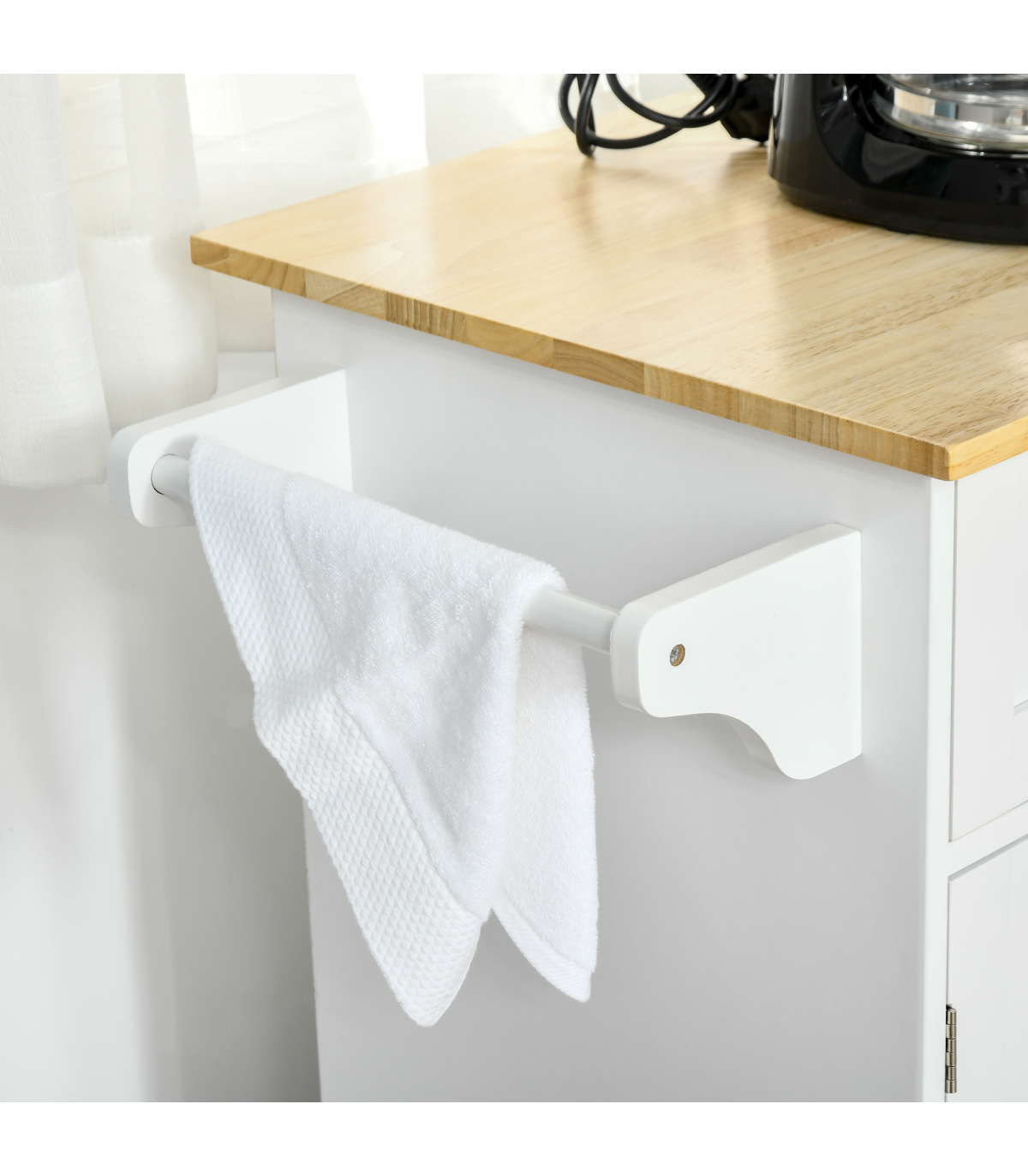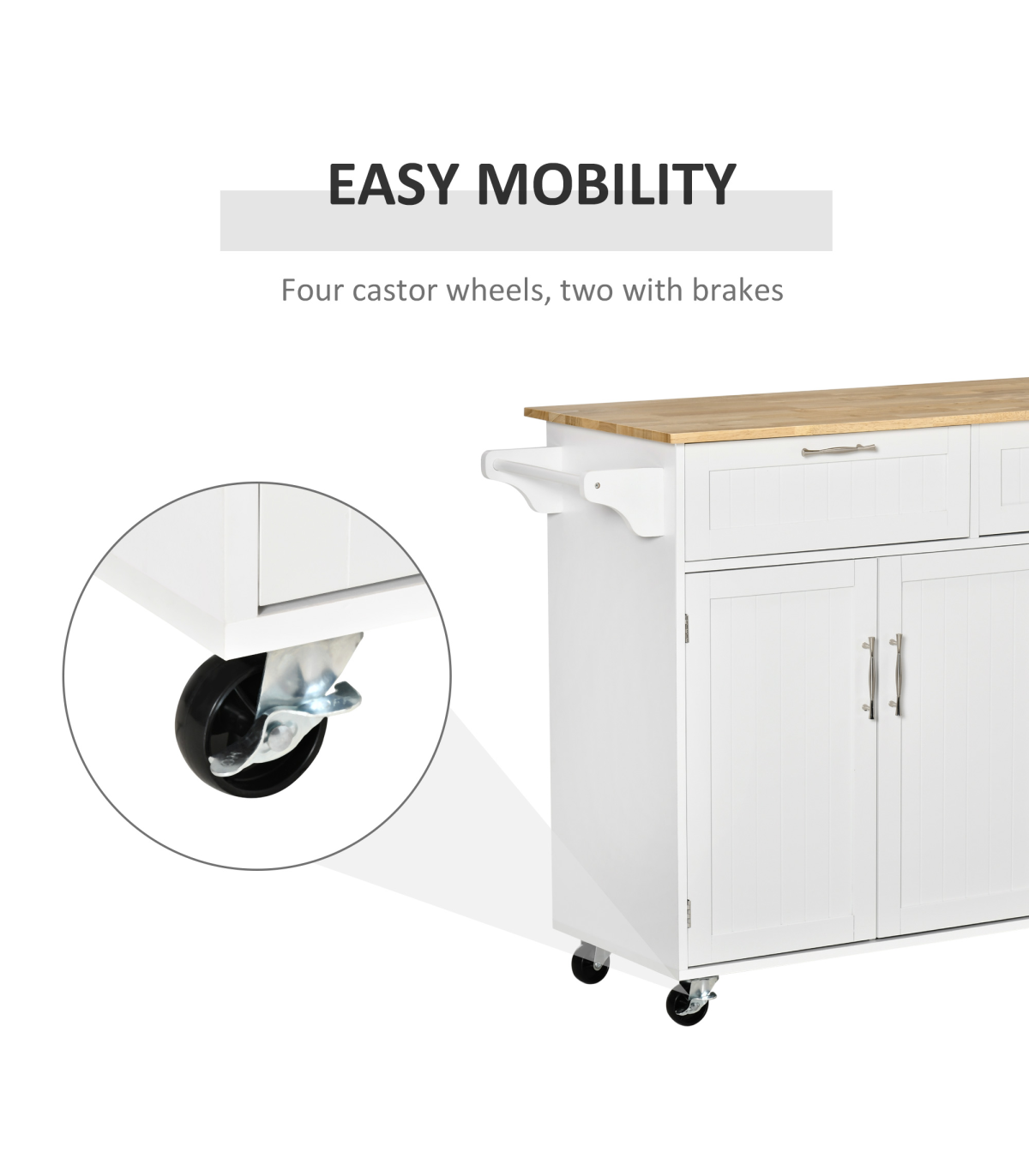 Looking to maximise your kitchen space? Do it with this kitchen island from HOMCOM. A simple, modern design in clean white is great for matching with plenty of different home interiors. Comes with two easy-glide drawers, three cabinets and a towel hanging rail - plenty of room for all your tableware, glassware, pots, pans cutlery and food. Four wheels make it mobile, you can take this anywhere you want. It's finished with a wood countertop - a solid place to prepare food.