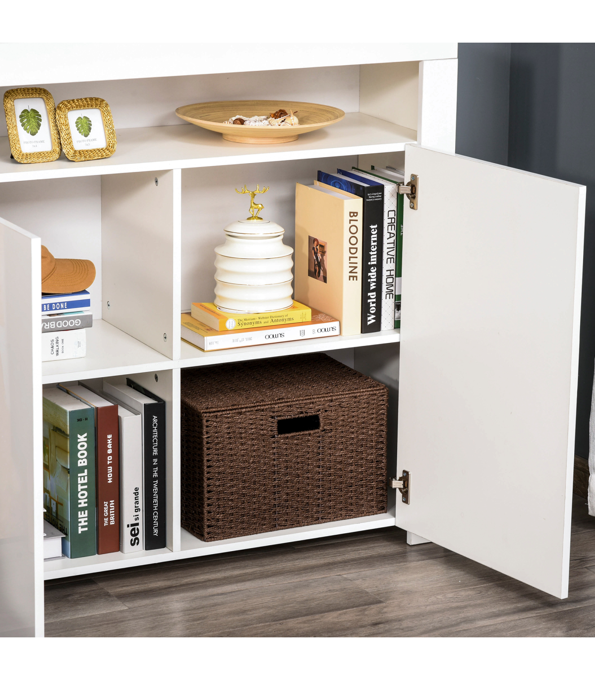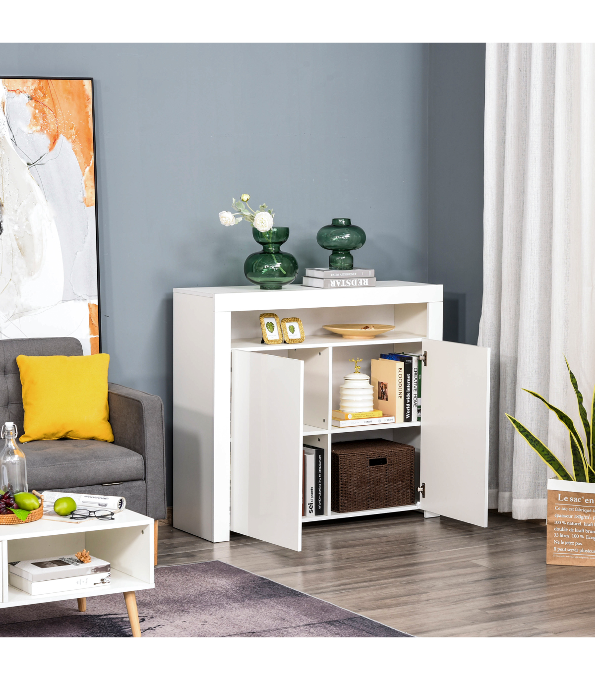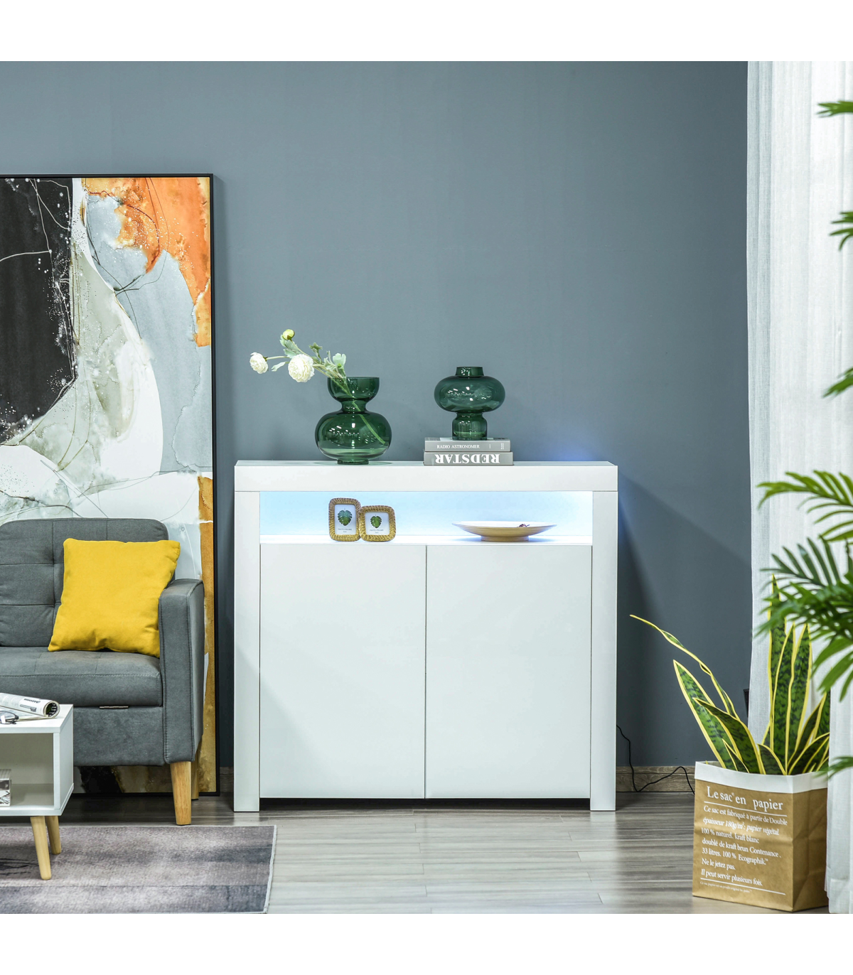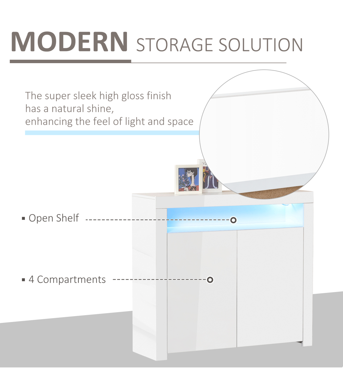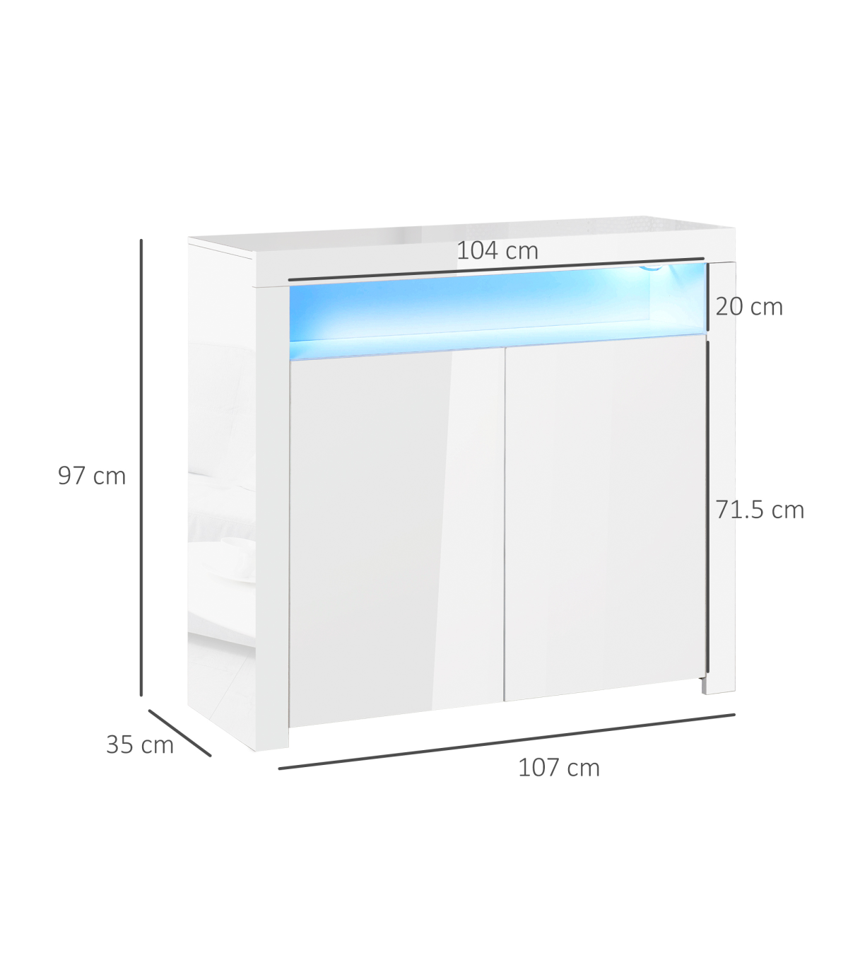 LED LIGHT TRIM: Built-in on the shelf, it can switch between 16 different modes - easy to change your mood and the ambience. Remote included for use at a distance.DUO STORAGE: Features top shelf and bottom cabinet with four compartments - giving you a mix of open and discreet storage.PARTICLE BOARD STRUCTURE: Durable composition for everyday use, finished with a modern and smooth high glass finish. Anti-tipping straps on back for safety.DIMENSIONS: 97H x 107W x 35Dcm. Inner storage: 33.5H x 51.2W x 32Dcm.MAXIMUM LOAD: Whole: 50kg. Shelf: 5kg. ASSEMBLY REQUIRED.
