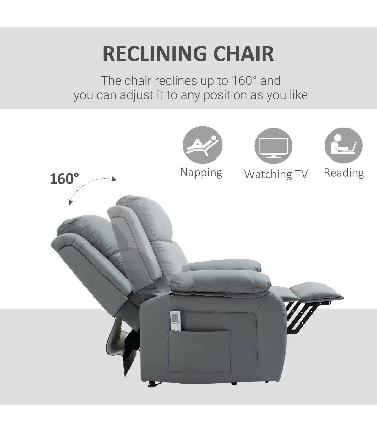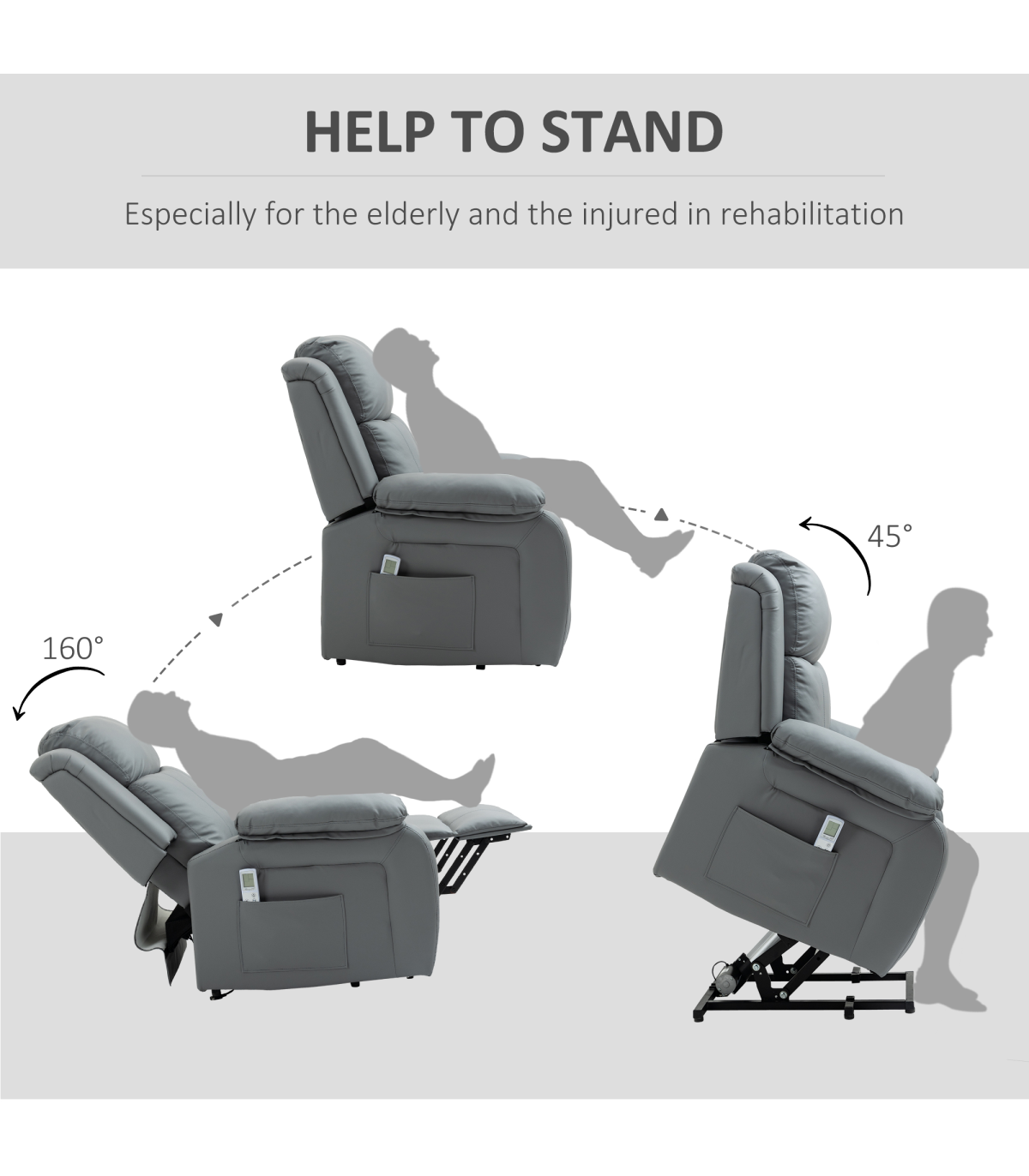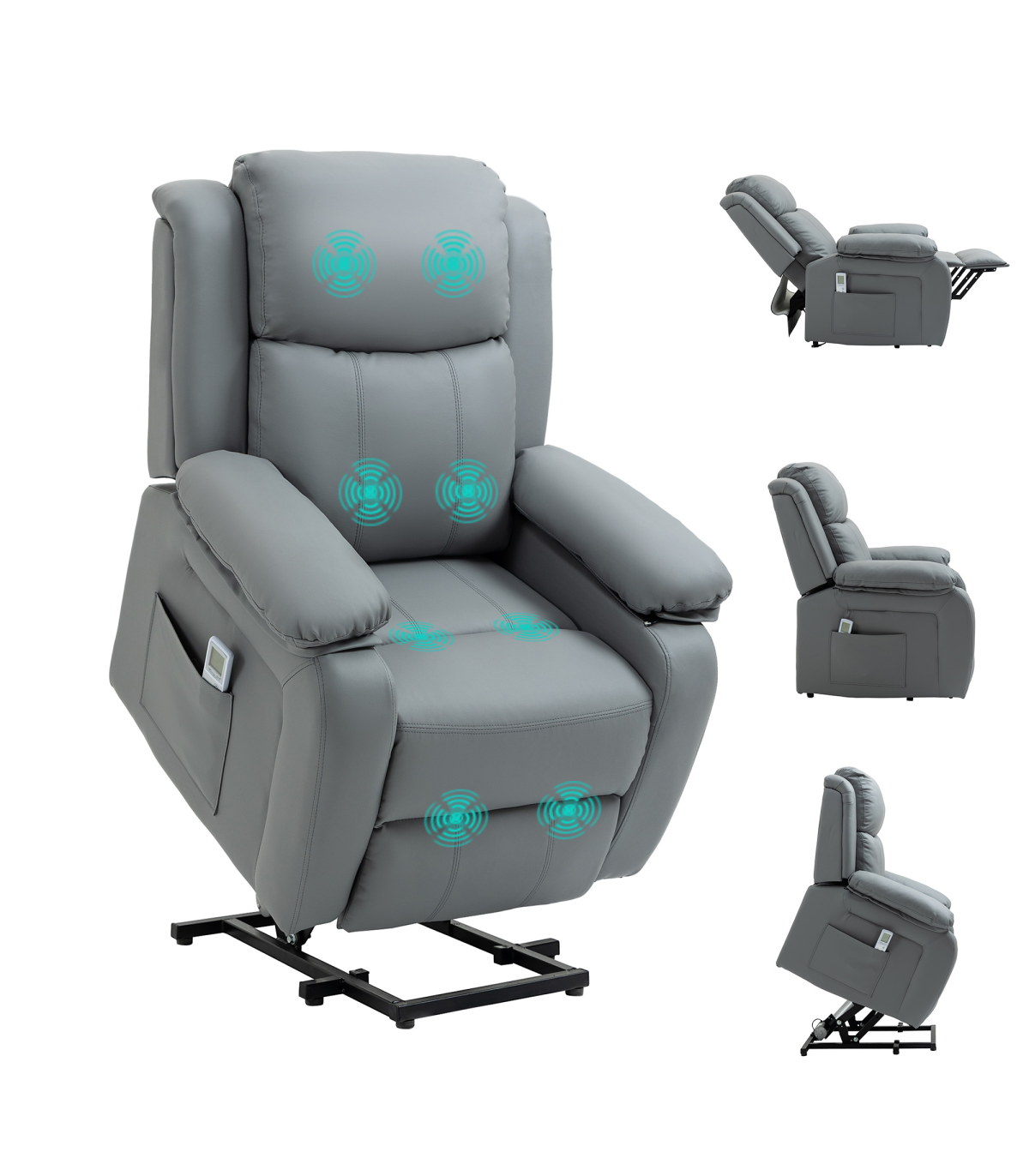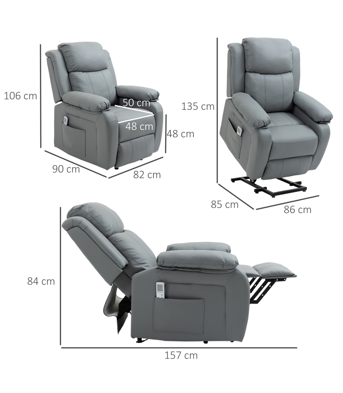 - "Electric Power Lift Recliner Chair with Massage Vibration Side Pocket, Grey" - Description: - Eight massage points and six vibrating massage modes - Soothes muscle pain and tension - Improves blood circulation in the back, lumbar, thighs and legs - Modes: automatic, gentle, wave, extrusion, knocking, percussion - Three intensity levels - Remote included - 160° reclining back - Suitable for reading, watching TV, resting - Footrest for leg lifting and stretching - Power lift chair - Lifts you out of the chair - Up to a maximum 45° angle - Easy movement down - Perfect riser recliner chair for the elderly and people with physical limitations - Comfortable with thick padding - Smooth faux leather upholstery - Dimensions: - Upright: 106H x 82W x 90D cm - Reclined: 84H x 86W x 157D cm - Maximum load: 130 kg - Assembly required
