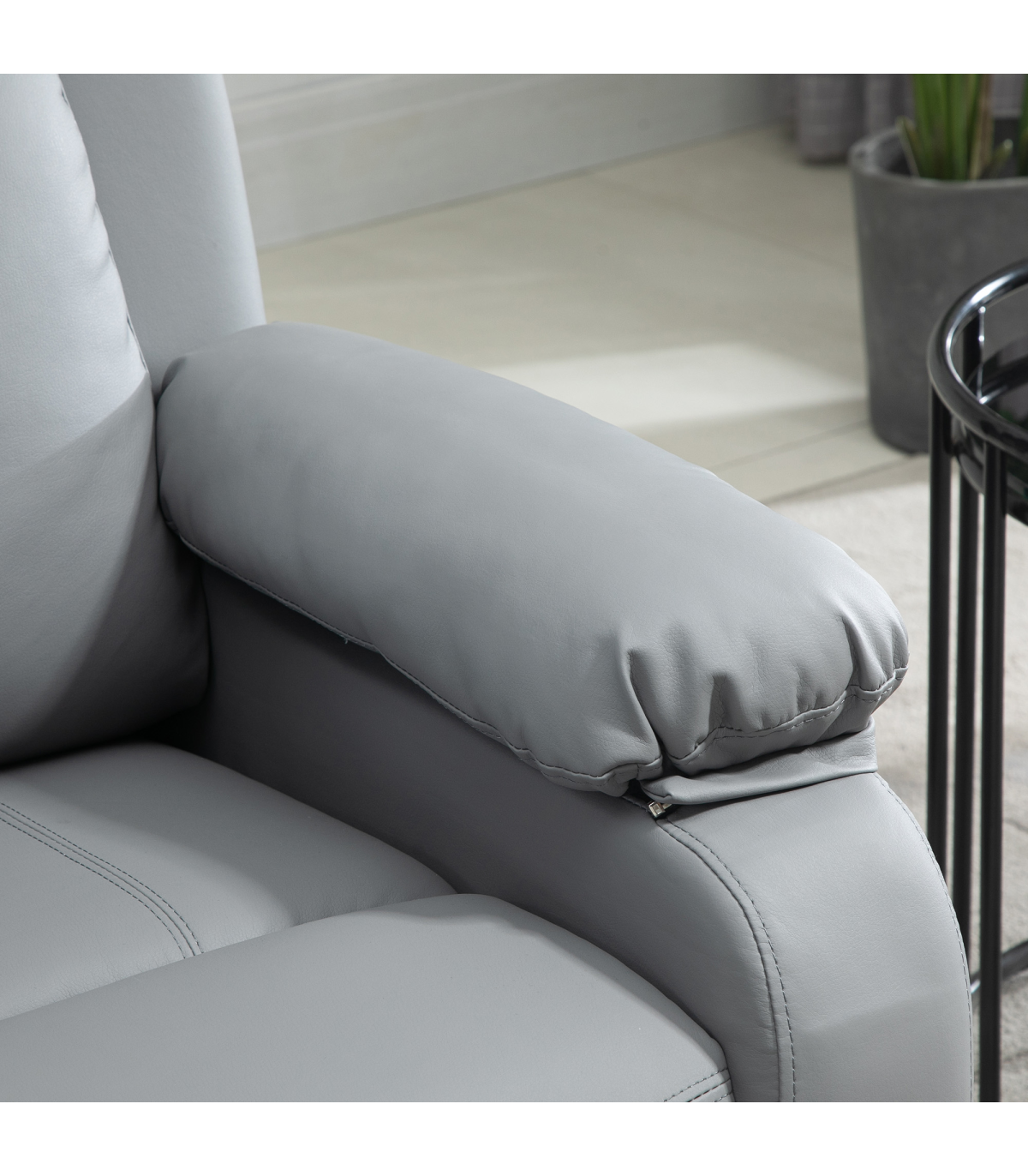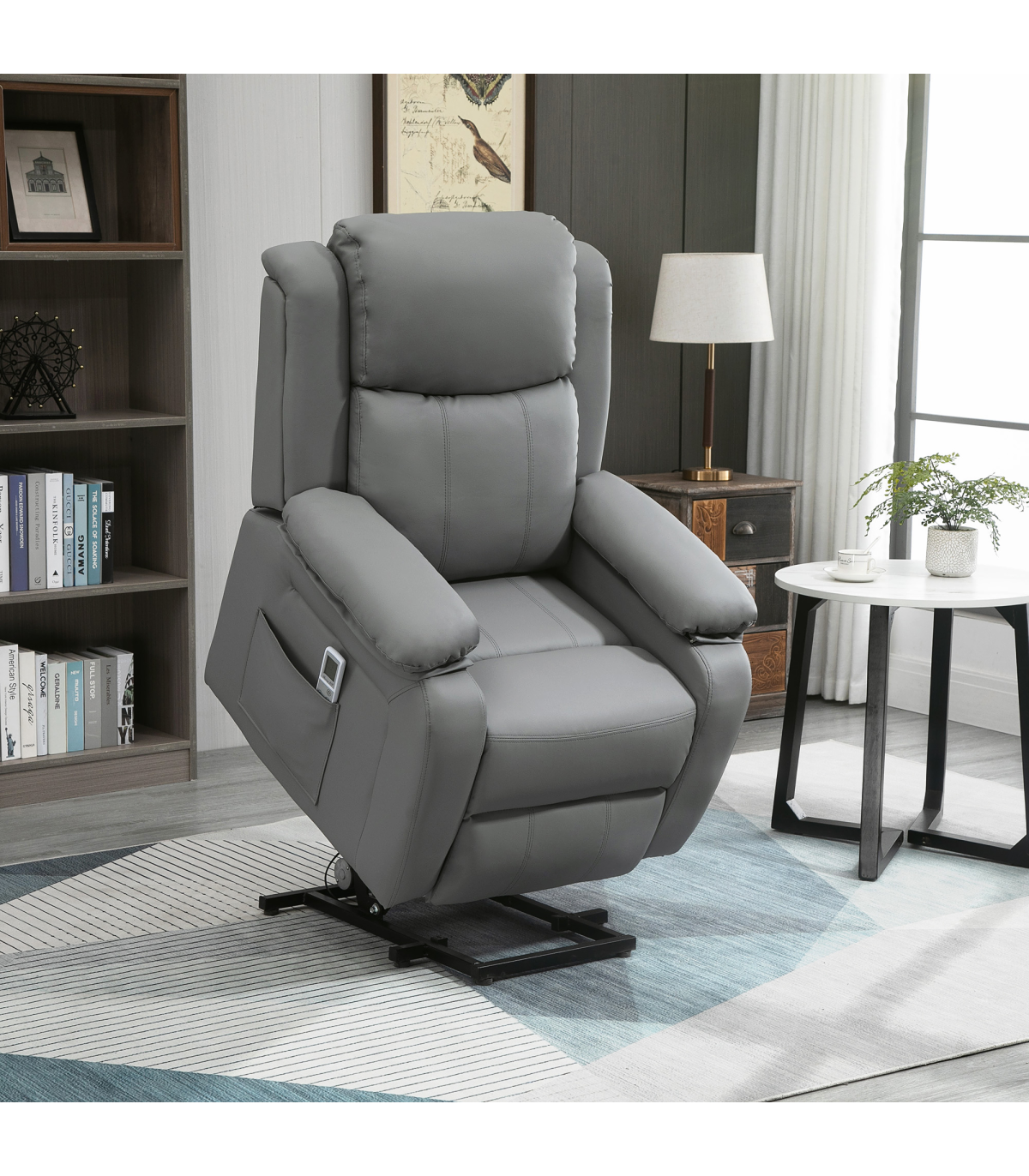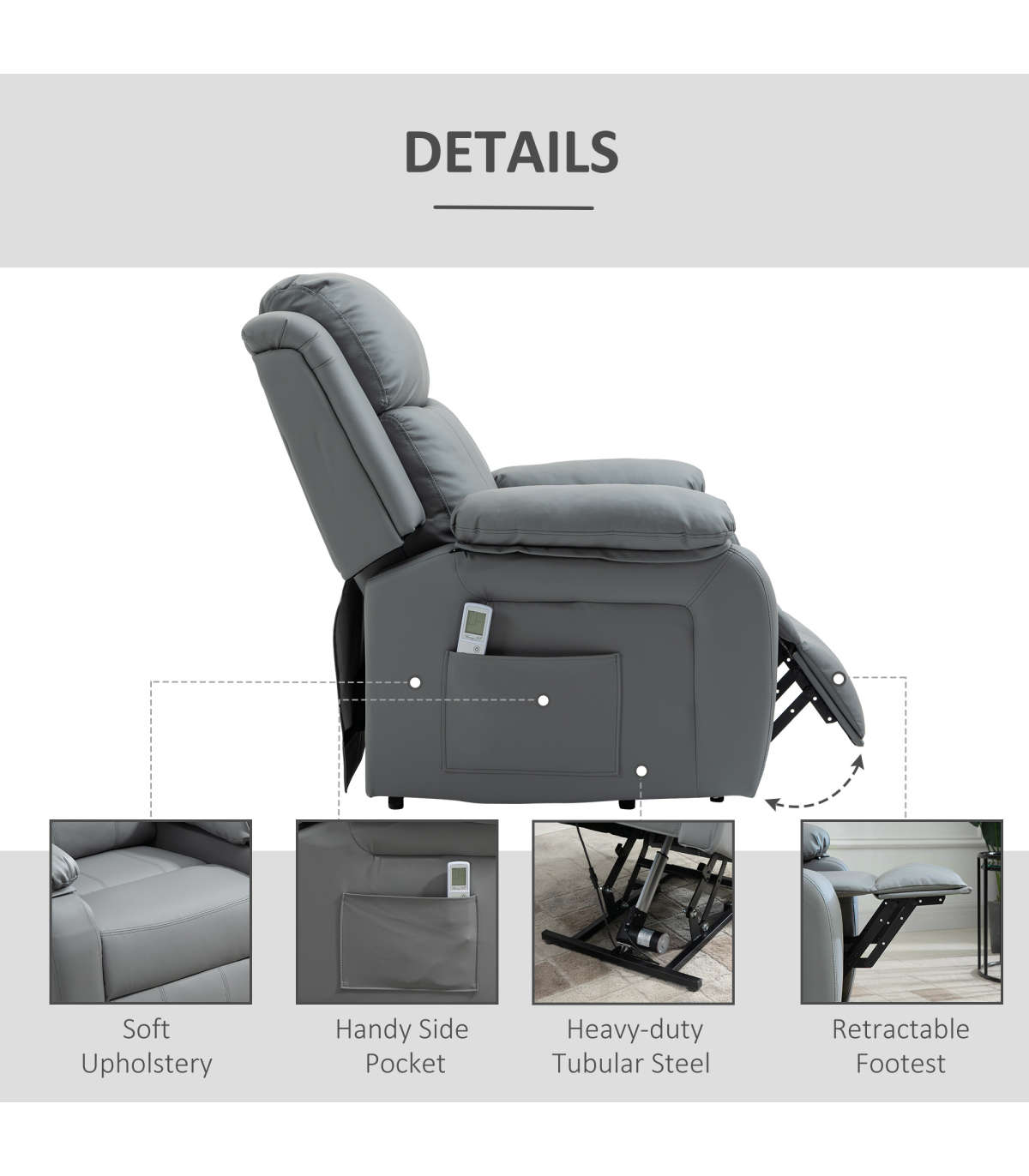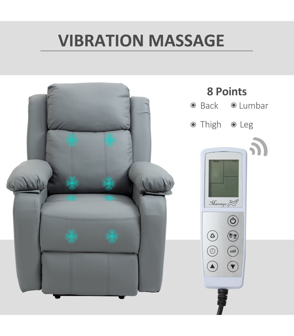 - "Electric Power Lift Recliner Chair with Massage Vibration Side Pocket, Grey" - Description: - Eight massage points and six vibrating massage modes - Soothes muscle pain and tension - Improves blood circulation in the back, lumbar, thighs and legs - Modes: automatic, gentle, wave, extrusion, knocking, percussion - Three intensity levels - Remote included - 160° reclining back - Suitable for reading, watching TV, resting - Footrest for leg lifting and stretching - Power lift chair - Lifts you out of the chair - Up to a maximum 45° angle - Easy movement down - Perfect riser recliner chair for the elderly and people with physical limitations - Comfortable with thick padding - Smooth faux leather upholstery - Dimensions: - Upright: 106H x 82W x 90D cm - Reclined: 84H x 86W x 157D cm - Maximum load: 130 kg - Assembly required