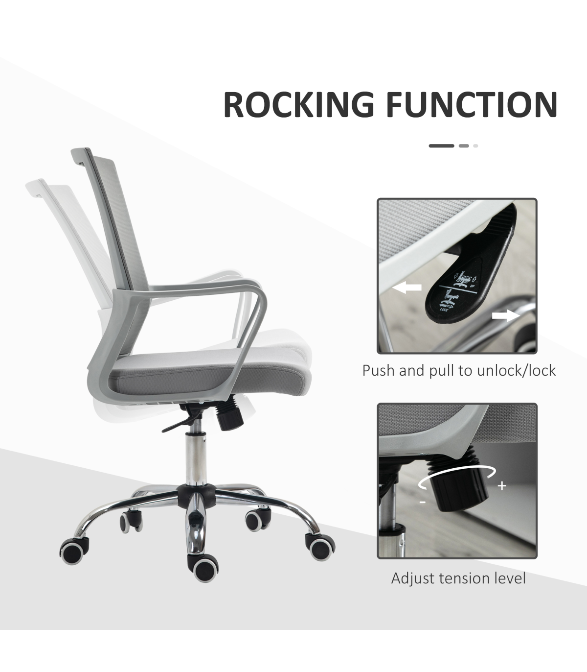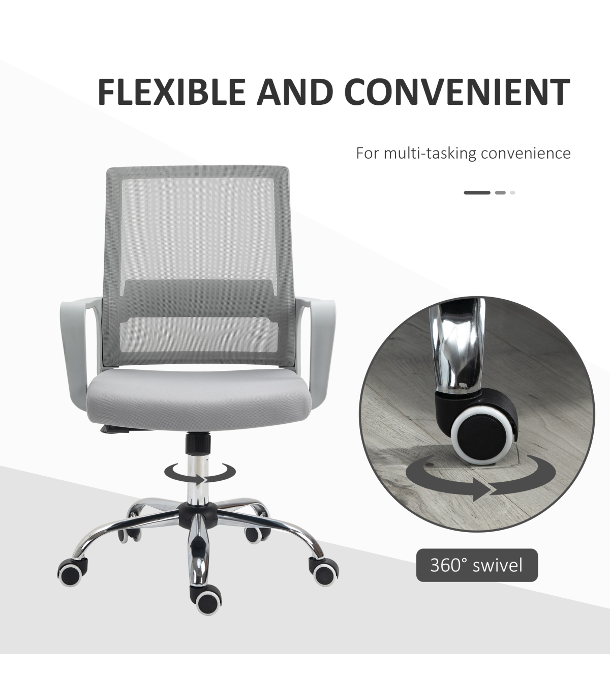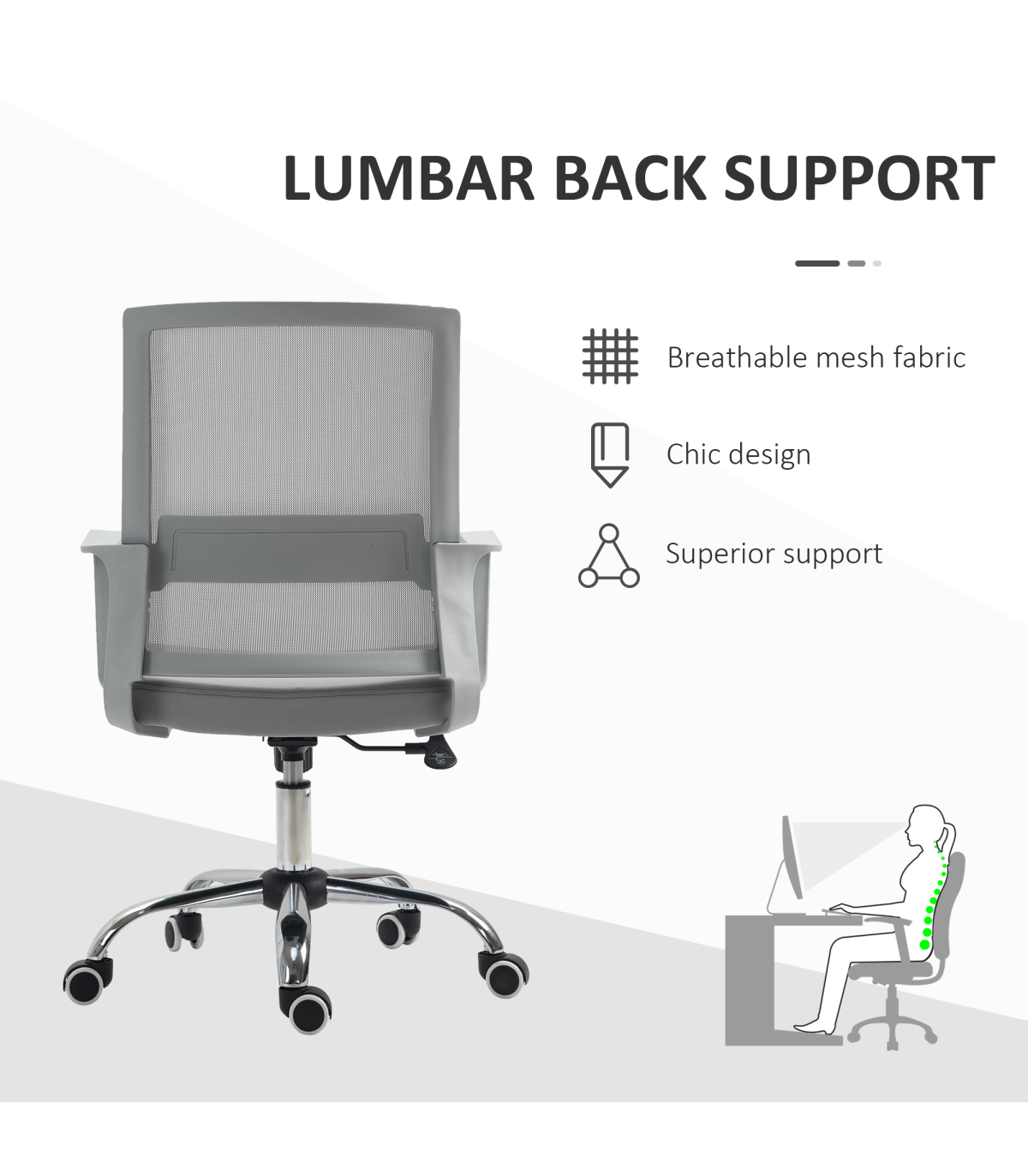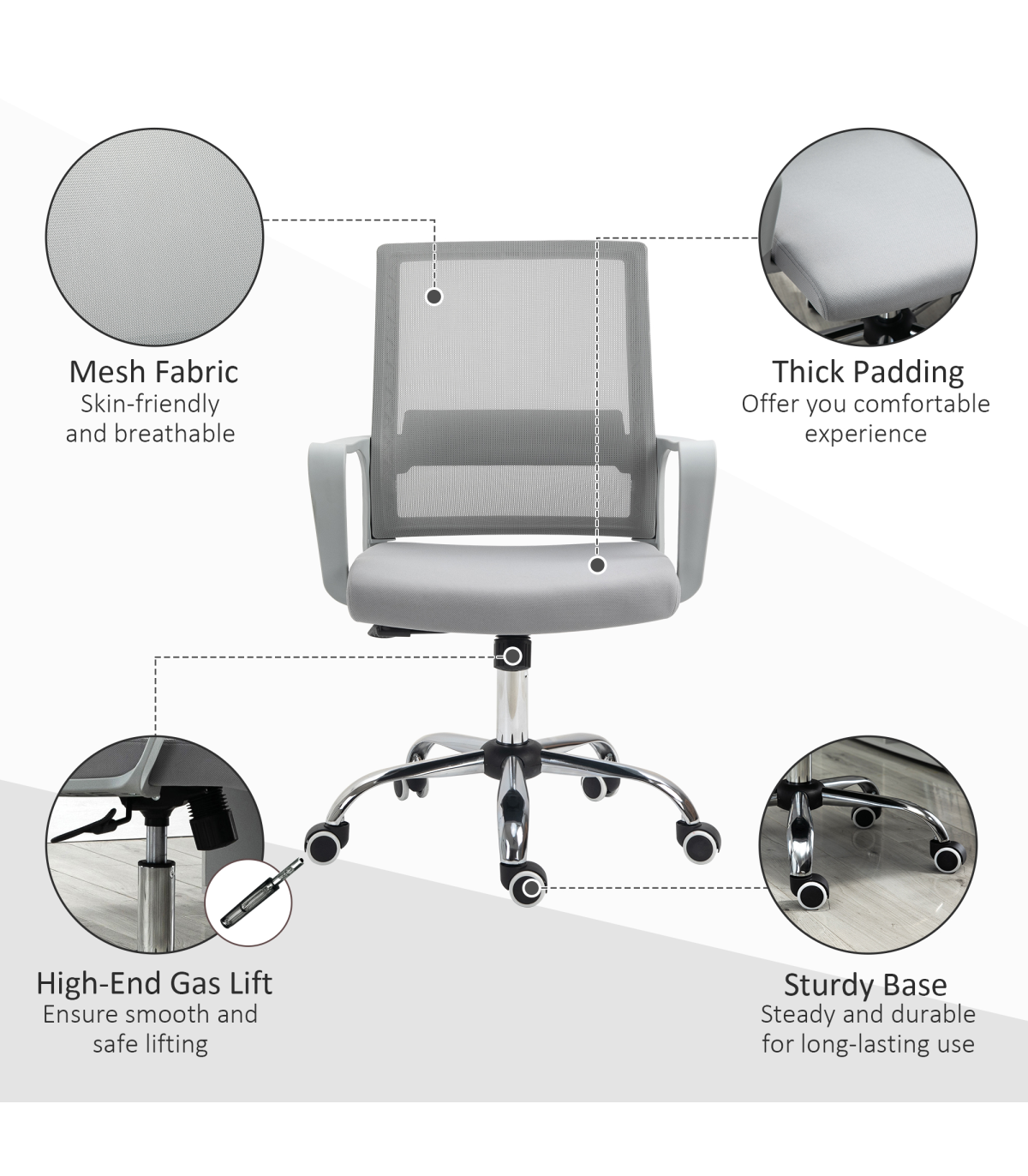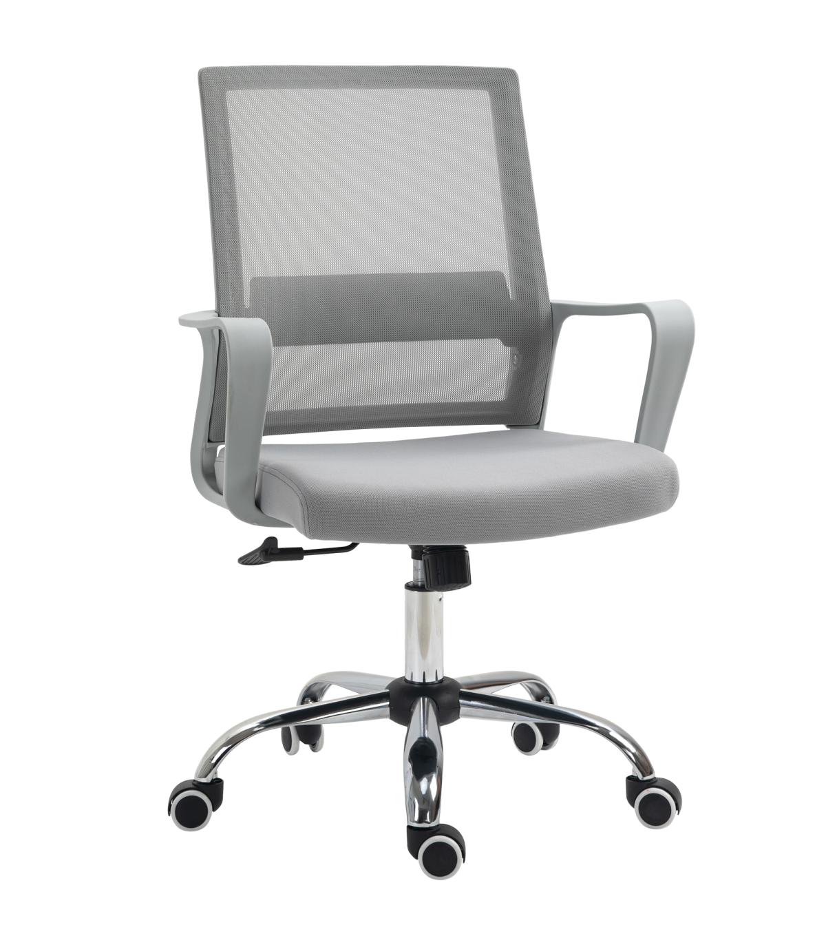 Take on the work day in comfort with this mesh chair from Vinsetto. Simple in design, yet effective in comfort: features a wide seat, swivel seat, a curved back and mid-rise armrests, with the height adjustable between 46cm and 56cm. The padded seat keeps you comfortable whilst seated. Five castor wheels makes this swivel chair easy to move around, whenever. Your home work space is calling for this piece.