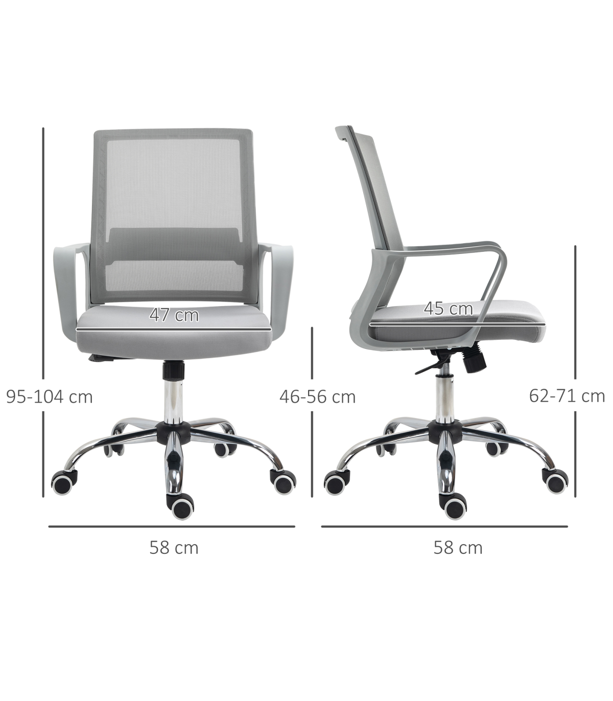 Comfortable: The desk chair features a wide seat - easy to sit for extended periods. Mid-rise armrests and a gently curved back provides support. Also seat rocks for extra relaxation.46-56cm adjustable height: Mesh office chair adjusts easily to set to a height you want - match your desk working level to prevent straining yourself.Cushioned seat, mesh back: Padded seat on this computer chair makes working over prolonged periods super easily. , and you can get on with your work in comfort. Mesh Back: Allows the body to breathe when you lean back.Five wheels: Easy to move this home office chair around, whether seated or empty.Dimensions: 95-104H x 58W x 58Dcm. Seat: 46-56H x 47W x 45Dcm. Maximum Load 120kg. Assembly required.
