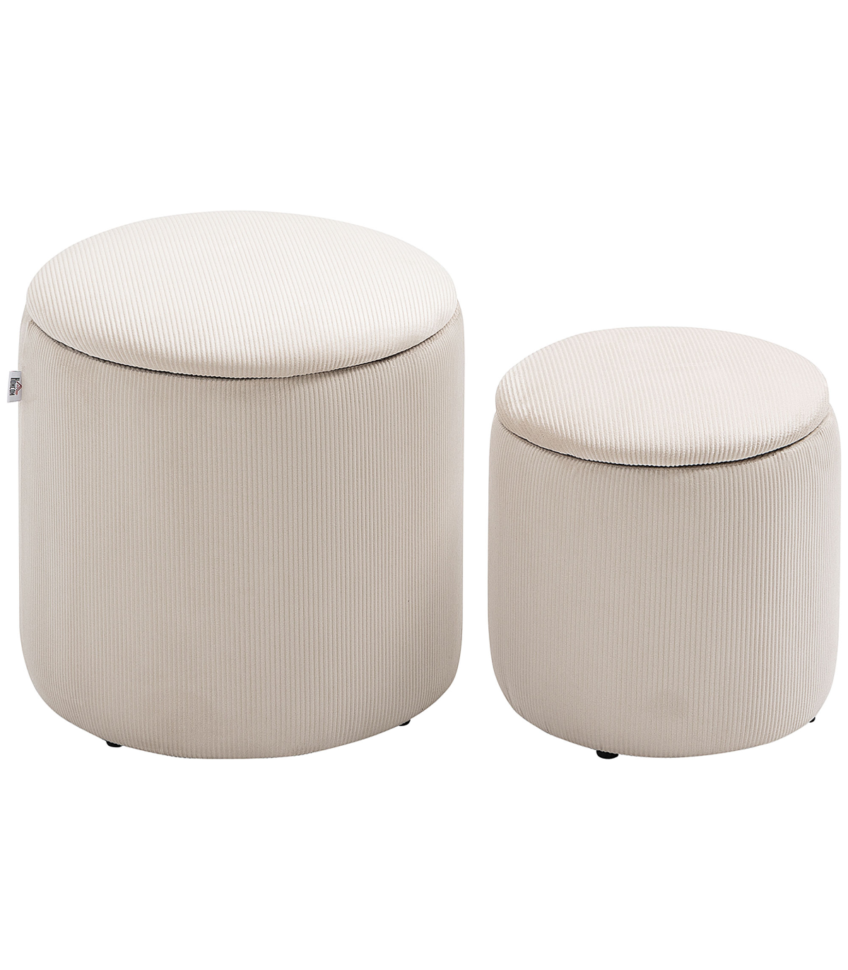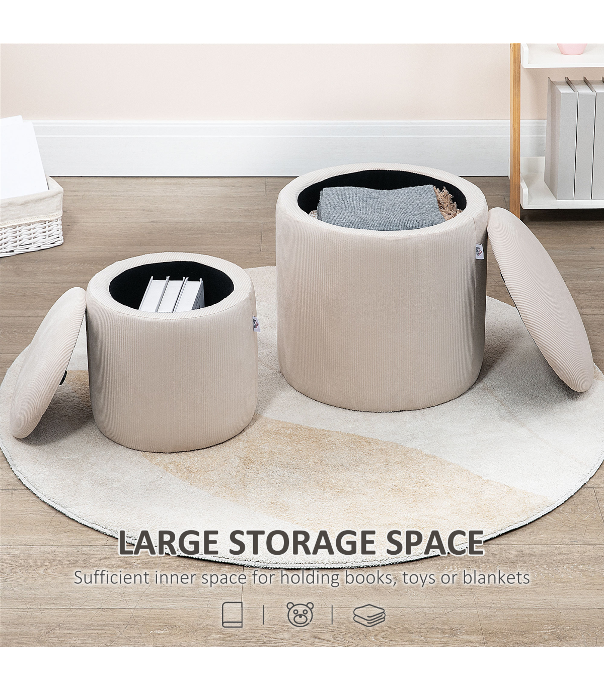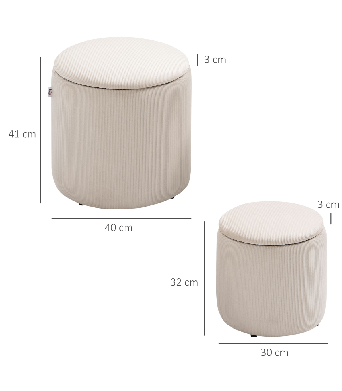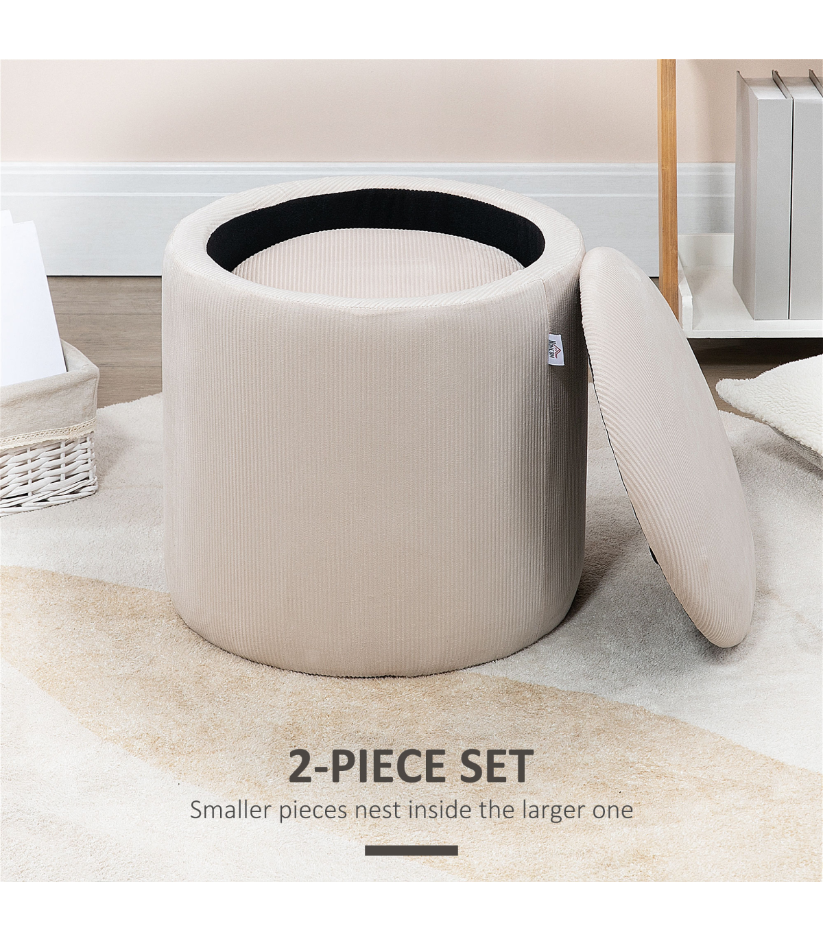 Two-piece storage ottoman set: A large and a small - giving you double the amount of discreet storage room. Smaller stool fits into larger stool when empty.Cushioned tops: Sit comfortably on both these storage stools. Temporarily rest on the removable lids, whenever.Corduroy upholstery: Soft, beautiful and stylish - these two stools bring a chic touch to your home space.Versatile: Use as a footstool in the living room, a dressing table stool in the bedroom - or a general storage seat wherever you want.Dimensions: Small stool inner: 28H x ?23cm. Large stool inner: 37H x ?33cm. Maximum load 100kg. No assembly required.