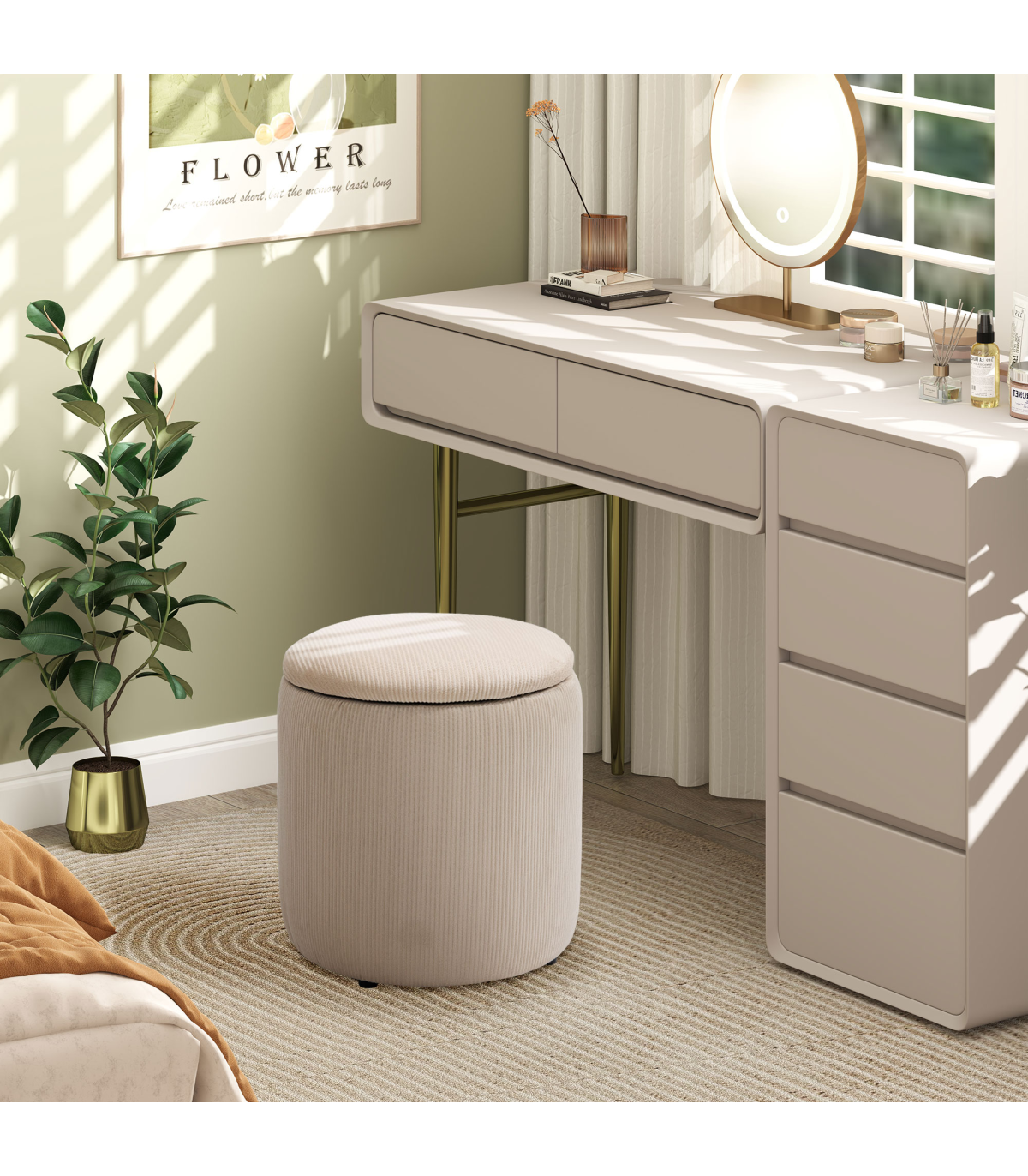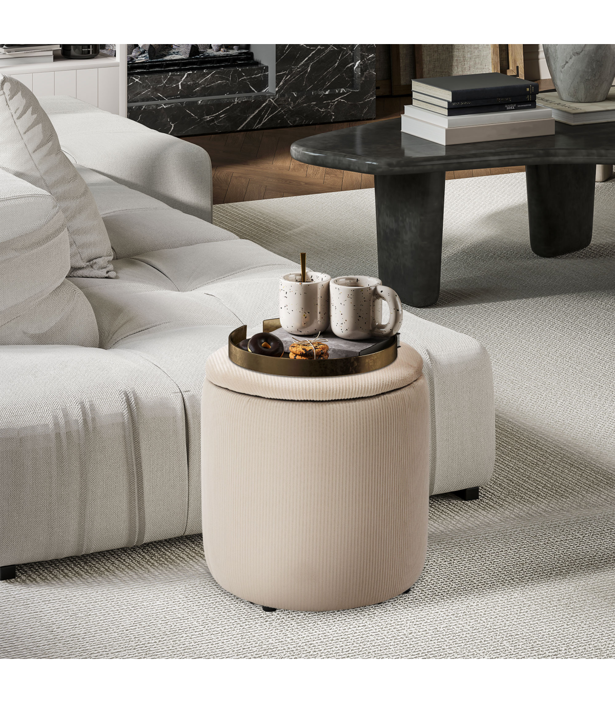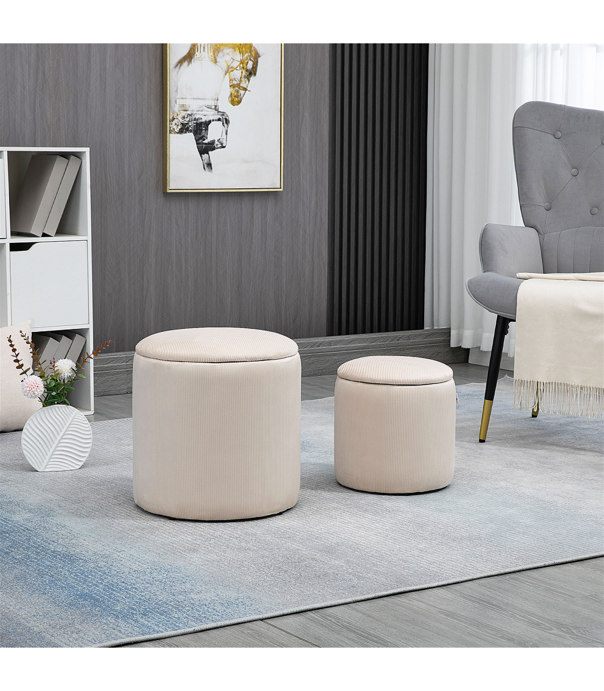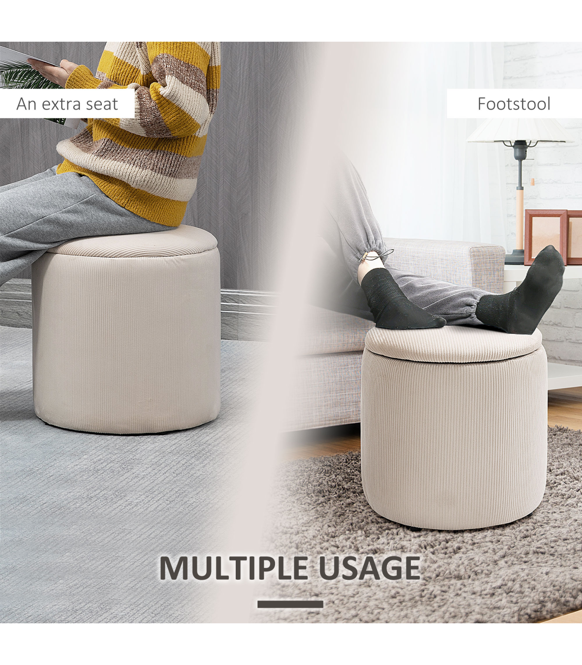 Two-piece storage ottoman set: A large and a small - giving you double the amount of discreet storage room. Smaller stool fits into larger stool when empty.Cushioned tops: Sit comfortably on both these storage stools. Temporarily rest on the removable lids, whenever.Corduroy upholstery: Soft, beautiful and stylish - these two stools bring a chic touch to your home space.Versatile: Use as a footstool in the living room, a dressing table stool in the bedroom - or a general storage seat wherever you want.Dimensions: Small stool inner: 28H x ?23cm. Large stool inner: 37H x ?33cm. Maximum load 100kg. No assembly required.