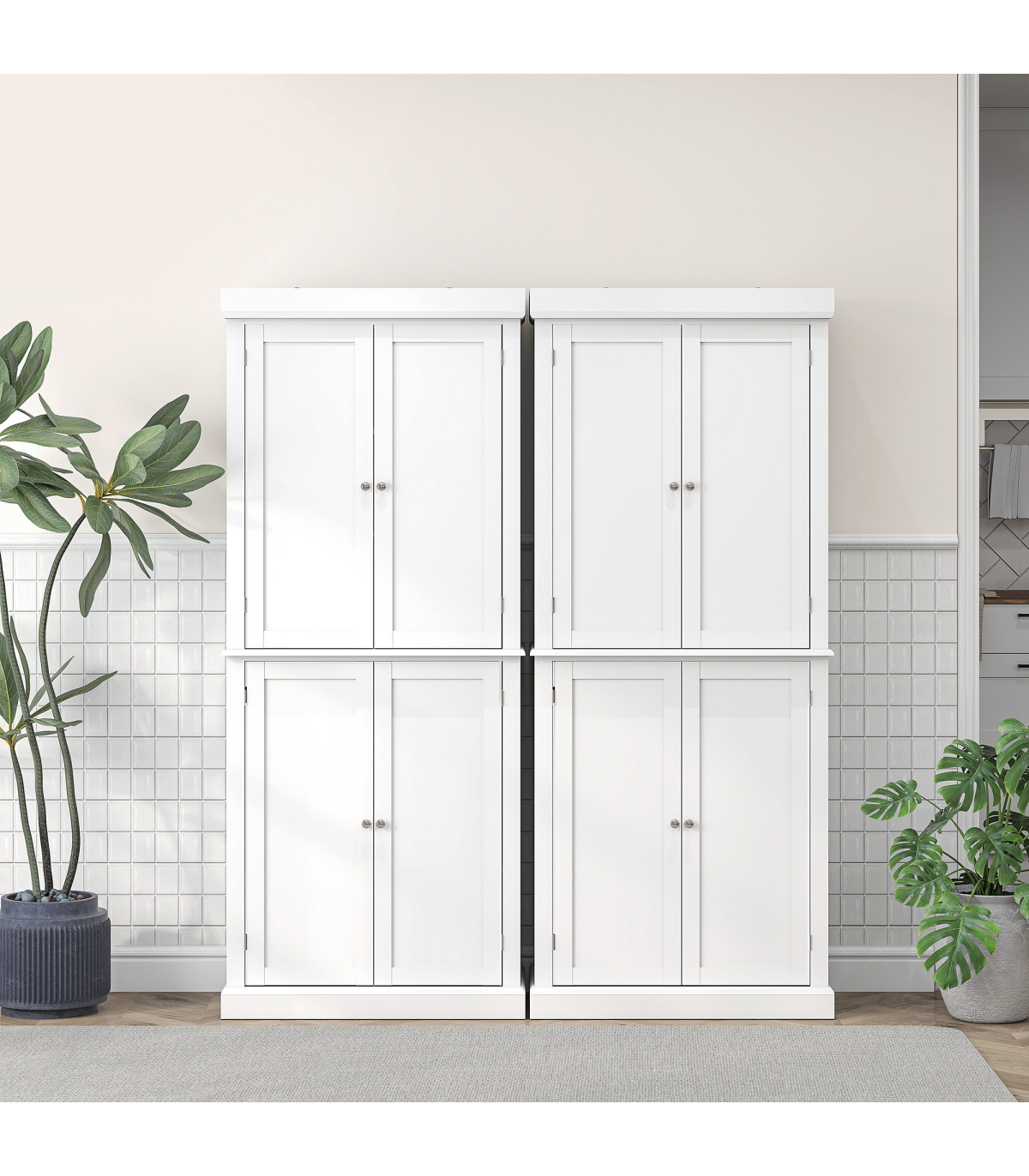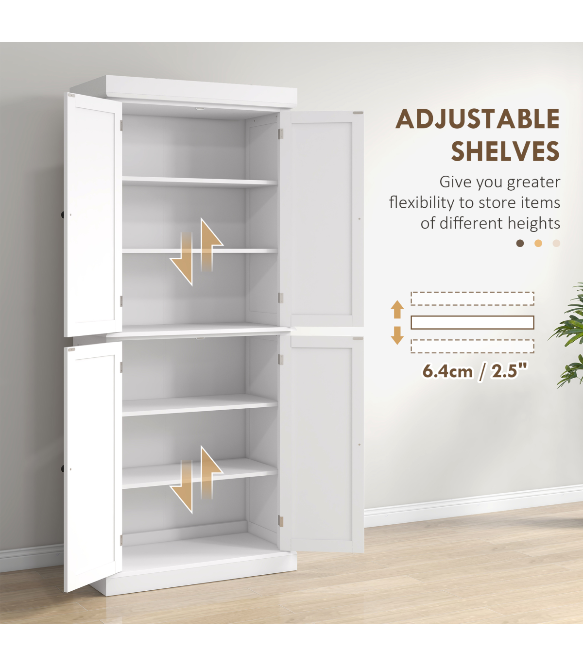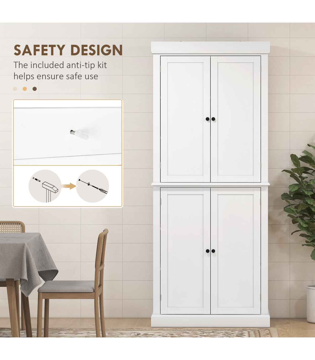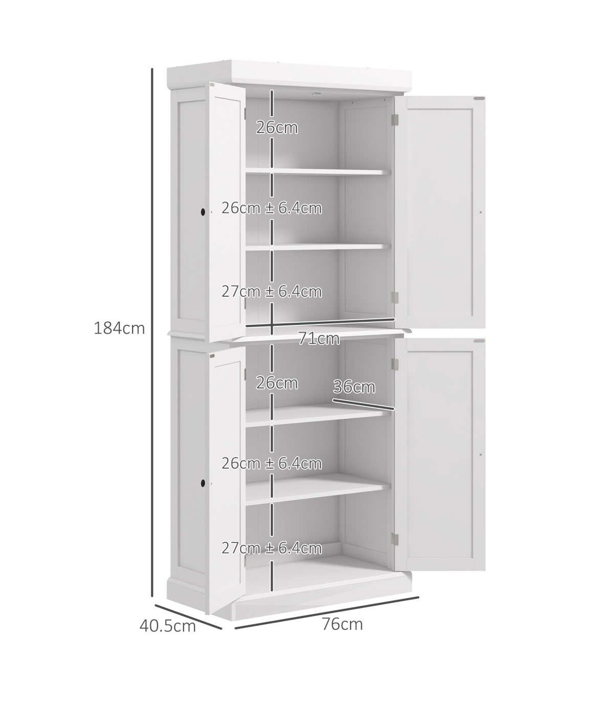 Multiple storage: Kitchen storage cabinet comes with six inner shelves - lots of room for kitchen and dining essentials - food, cookbooks, dry goods, kitchen accessories and more.Four flexible shelves: Move up/down or simply remove them to change up the storage space instantly.Modern design: White kitchen dresser design, with black handles for small contrasting appeal. A great addition for all home spaces.Anti-tipping hardware: Attach this kitchen larder cupboard that you can fix to the wall to ensure it will not fall over.Dimensions: 184H x 76W x 40.5Dcm. Maximum load 100kg. Assembly required.