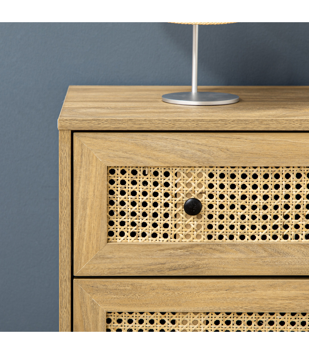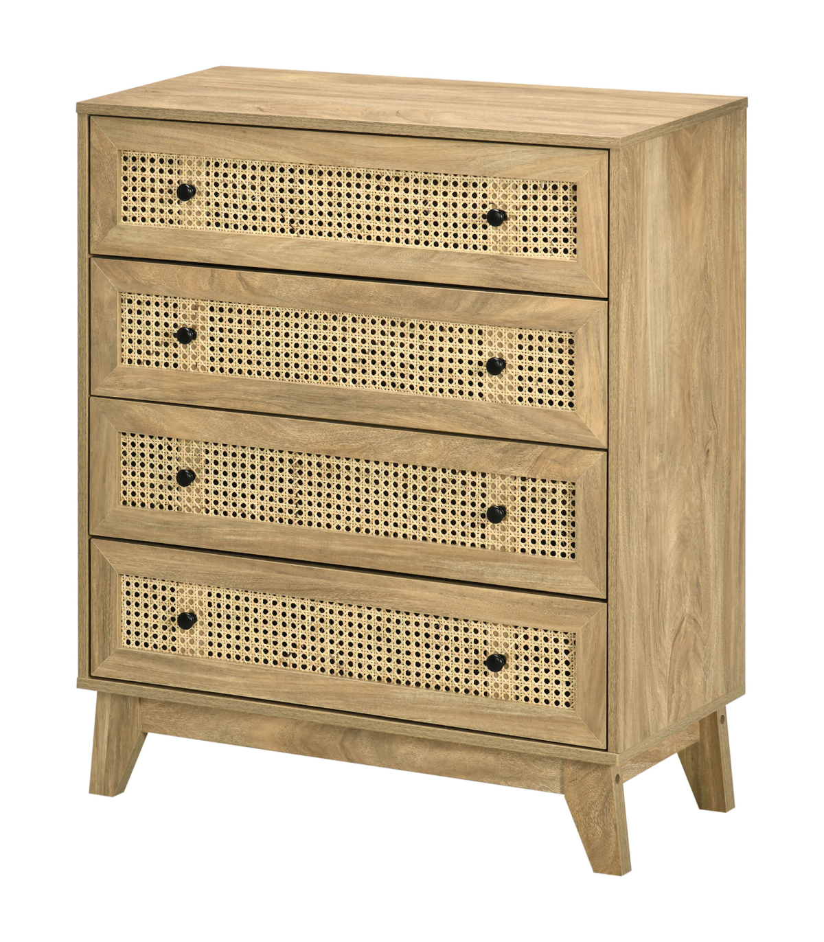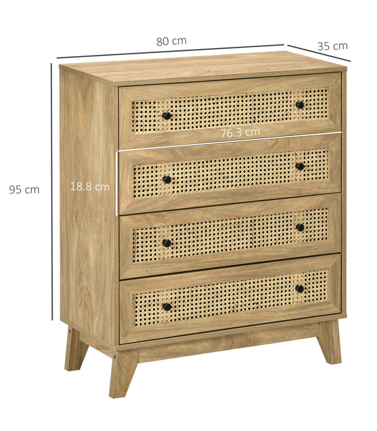 Rattan weave panels: Featured in the middle of each drawer on this chest of drawers - adopts a cool and different look for your inside styling - a touch of the outdoors.Four drawers: A drawer chest which has plenty of room for keeping clothing and more stored. Organise folded tees, trousers, underwear with ease.Particle board structure: Storage drawers are durable - and reliable piece for everyday use. Natural wood-effect finish to mix well with other furniture.Anti-tipping straps: Attach this dresser to a wall, so it stands securely, with low risk of falling forwards.Dimensions: 95H x 80W x 35Dcm. Drawer inner: 9.8H x 71.9W x 28.8Dcm. Maximum load 40kg. Assembly required.