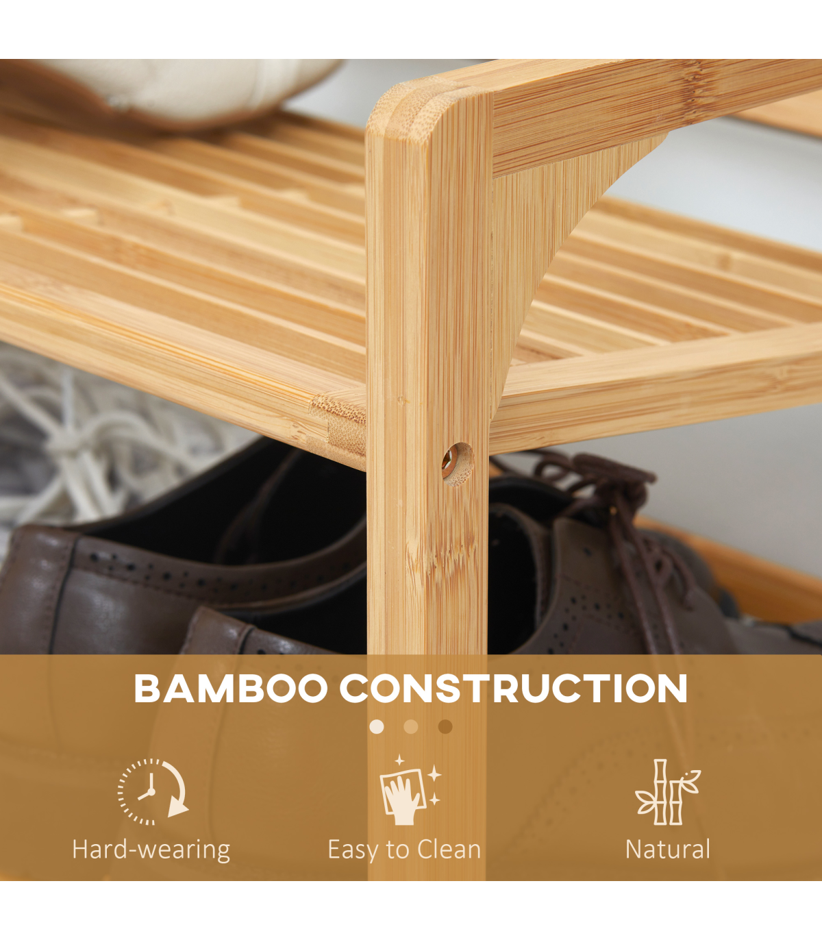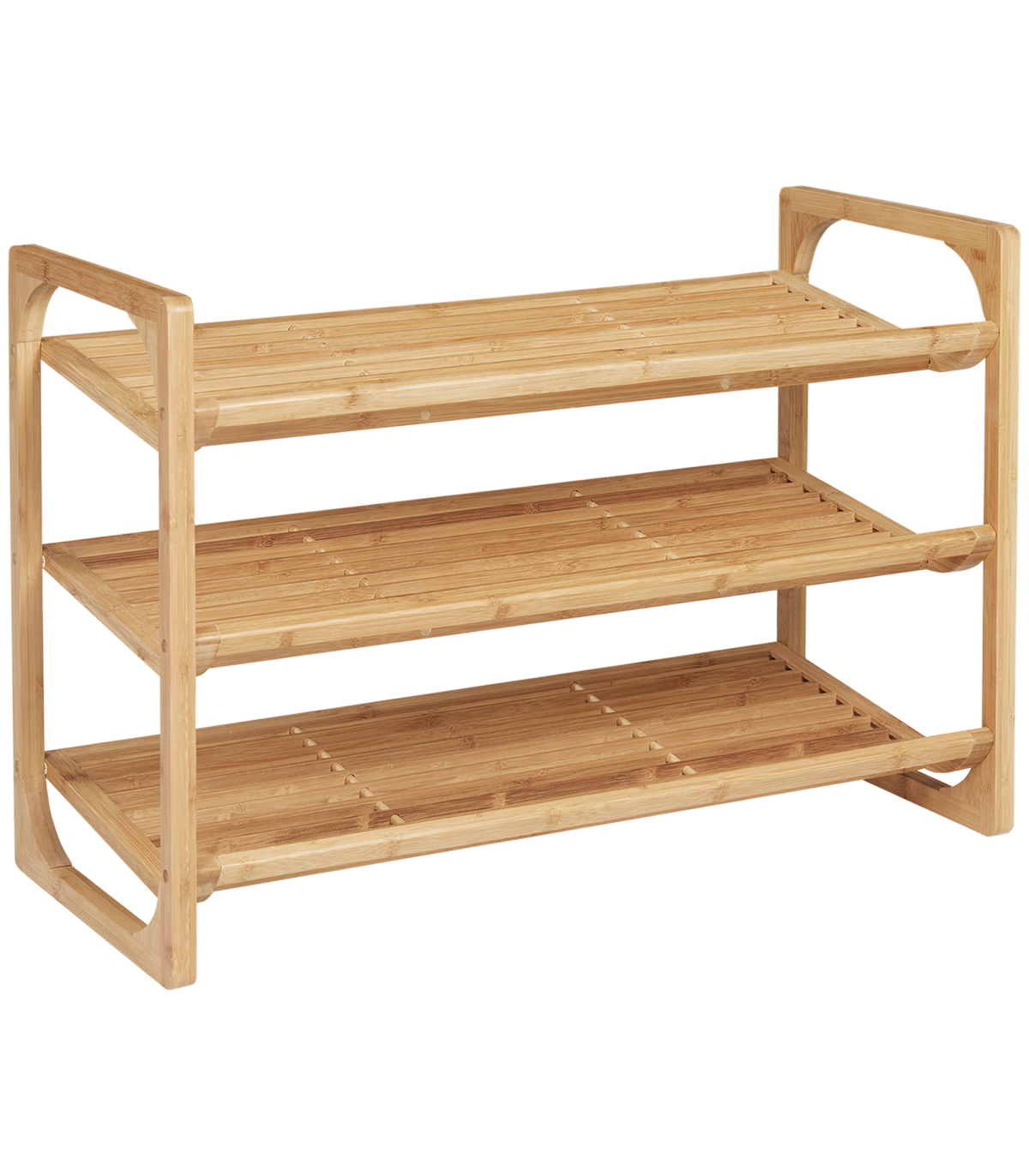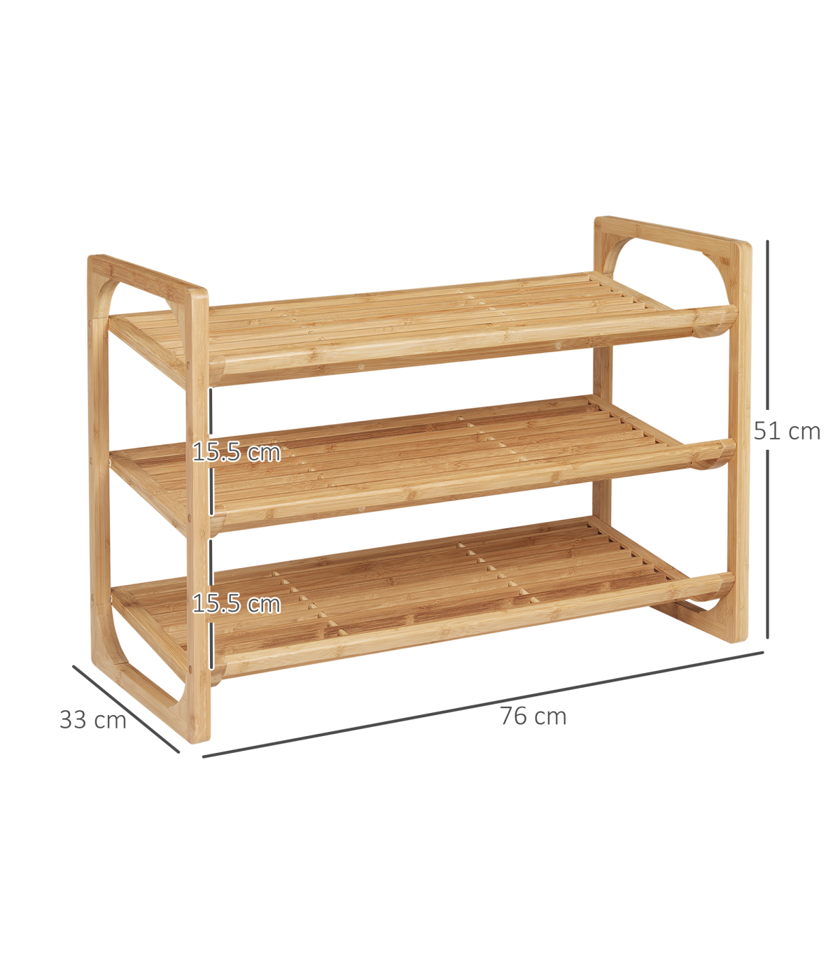 Holds nine shoe pairs: Shoe stand has plenty of room for the whole family. Each shelf holds three shoe pairs.Bamboo construction: A strong and beautiful shoe rack - natural look is suited for practically everywhere.Slatted shelves: Air circulates better around this shoe shelf, keeping items fresh. Slightly curved edge to prevent shoes from falling off.Versatile: Small shoe rack can be used in the hallway, living room, bedroom - or wherever else it is required.Dimensions: 51H x 76W x 33Dcm. Maximum load 5kg per tier. Easy to assemble.