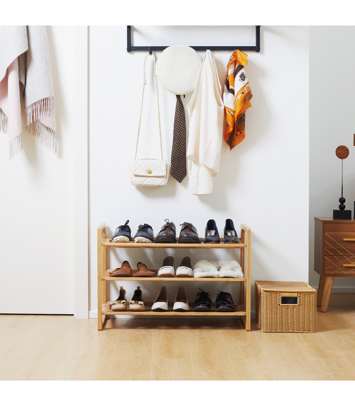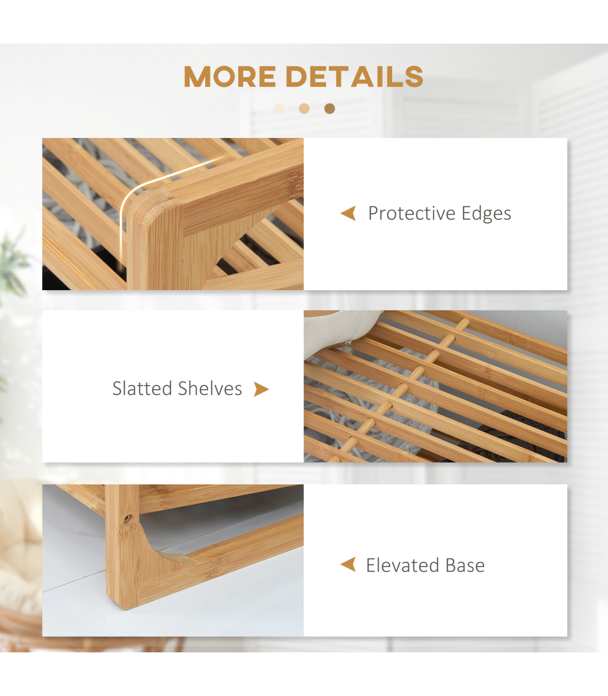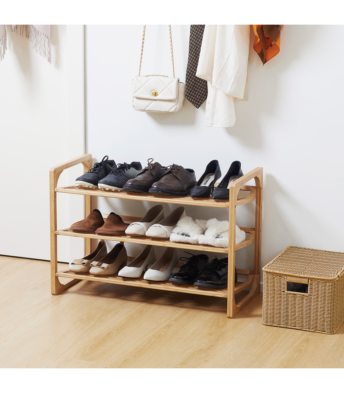 Holds nine shoe pairs: Shoe stand has plenty of room for the whole family. Each shelf holds three shoe pairs.Bamboo construction: A strong and beautiful shoe rack - natural look is suited for practically everywhere.Slatted shelves: Air circulates better around this shoe shelf, keeping items fresh. Slightly curved edge to prevent shoes from falling off.Versatile: Small shoe rack can be used in the hallway, living room, bedroom - or wherever else it is required.Dimensions: 51H x 76W x 33Dcm. Maximum load 5kg per tier. Easy to assemble.