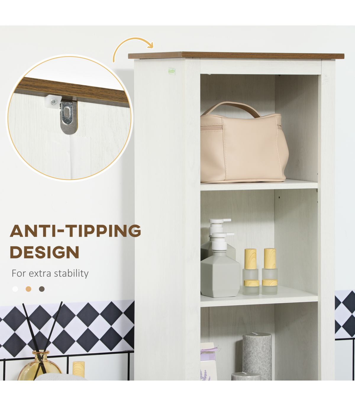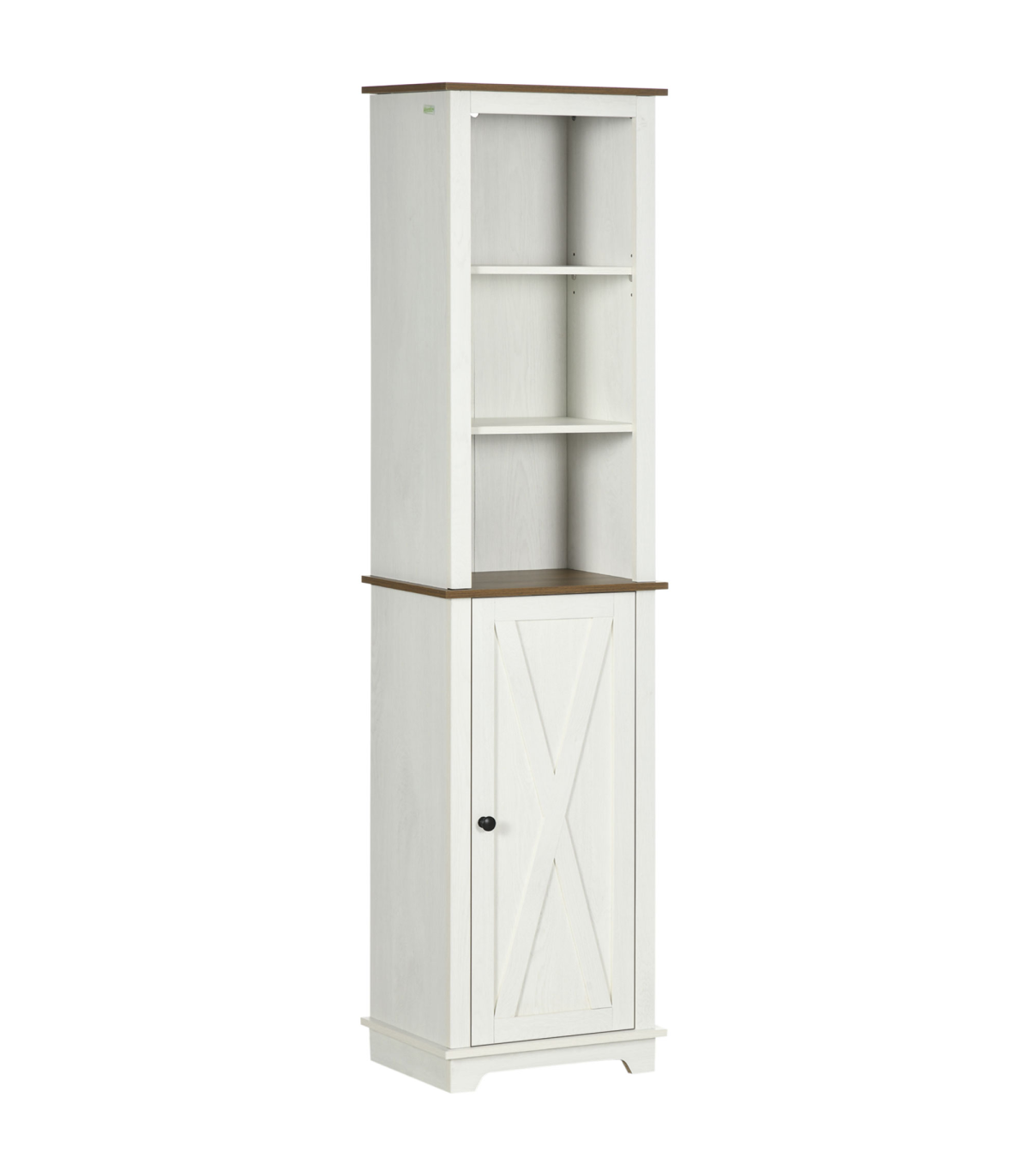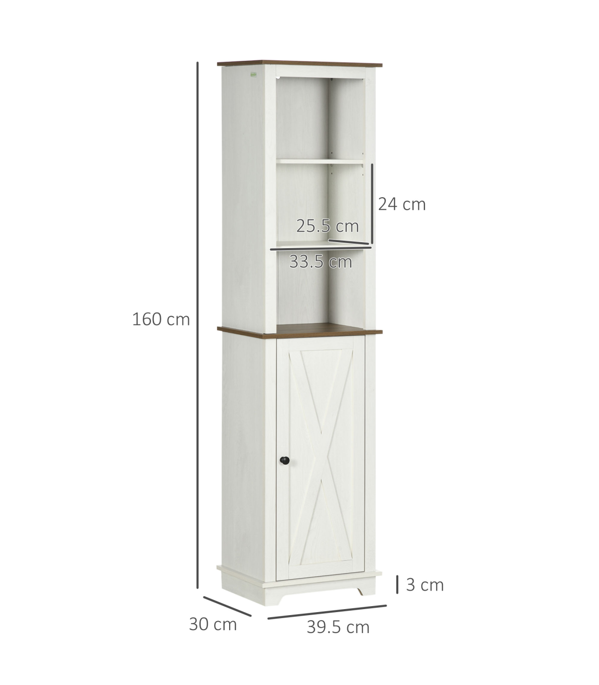 Multi-storage: Slim bathroom cabinet comes with three shelves and a cupboard with door: store towels, products and cleaning supplies.Tall bathroom cabinet design: Slim and narrow, won't take up too much space - great for tighter spots.Adjustable shelves: Set the top shelf and cupboard shelf to a level you want - a more customisable bathroom storage unit.Anti-tipping straps: Attach this bathroom cabinet for safety - suitable for family households.Dimensions: 160H x 39.5W x 30Dcm. Maximum load 50kg. Assembly required.