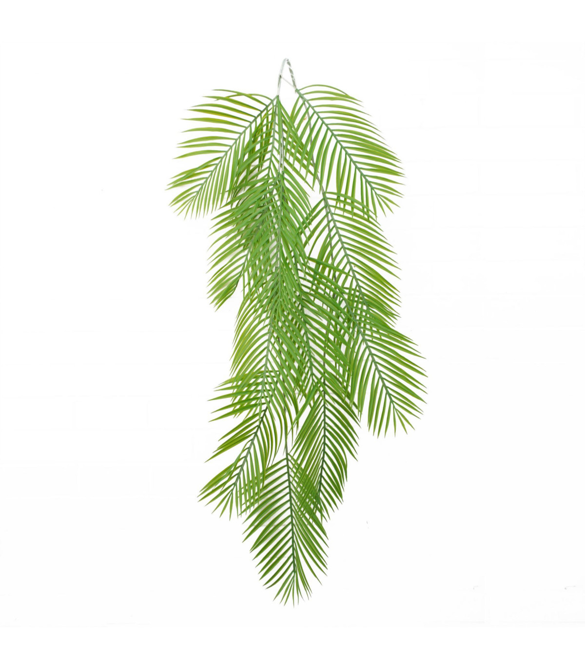 Pack of 12 individual plants - ideal for displays. Tropical hanging palm plant. Measures 120cm from end to end overall. Individual leaves measure 35 x 20cm. Plant has 12 leaves on it which are realistic shaped plastic. All the stems are wired so it is easy to shape this to your space. Lying flat this measures 50cm across. Ideal for tropical displays.