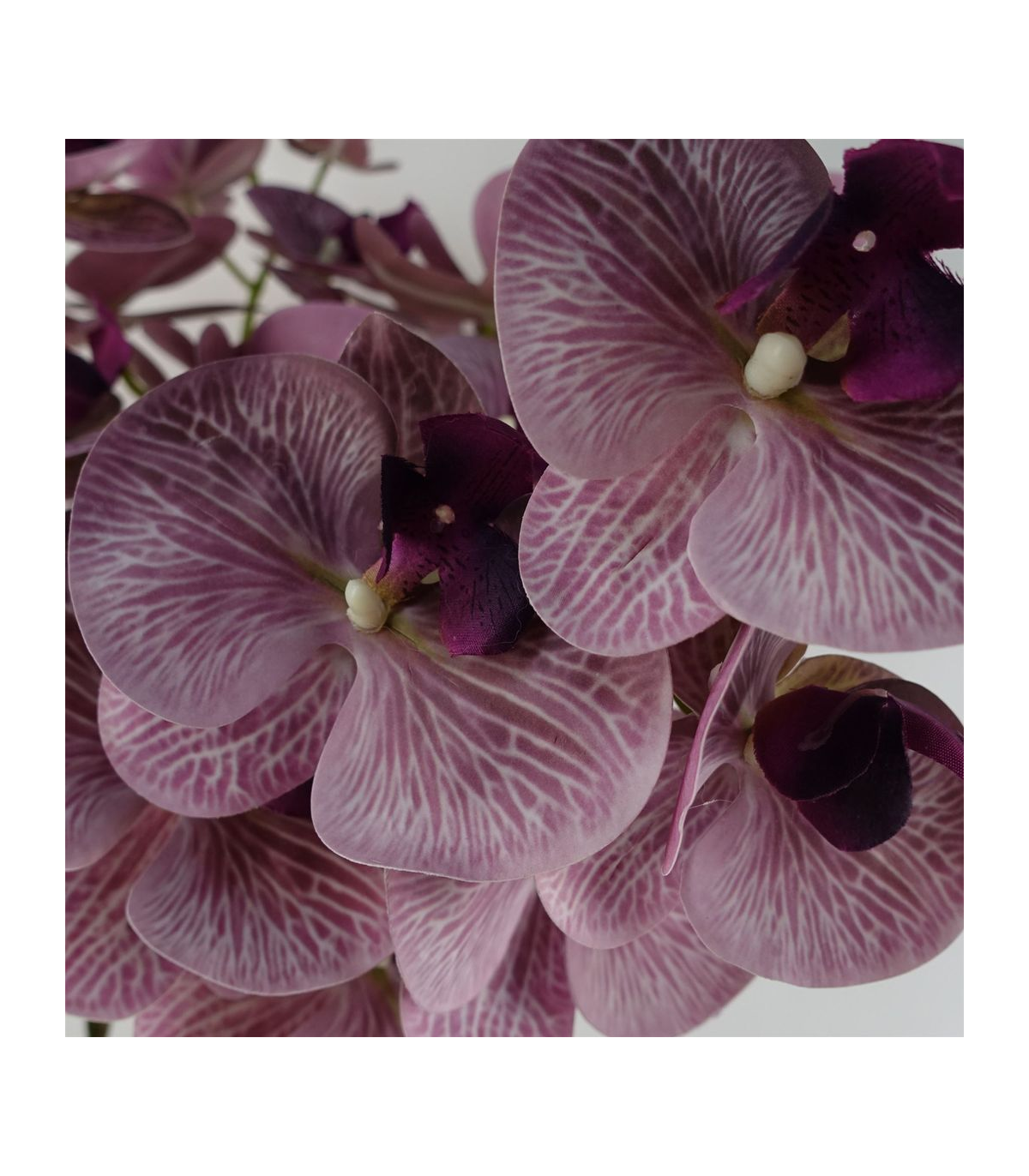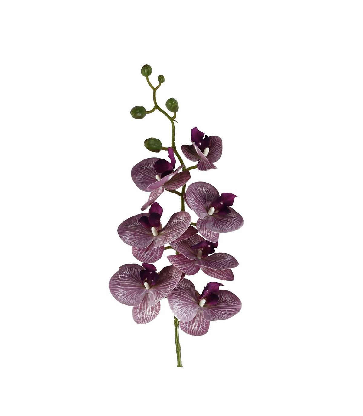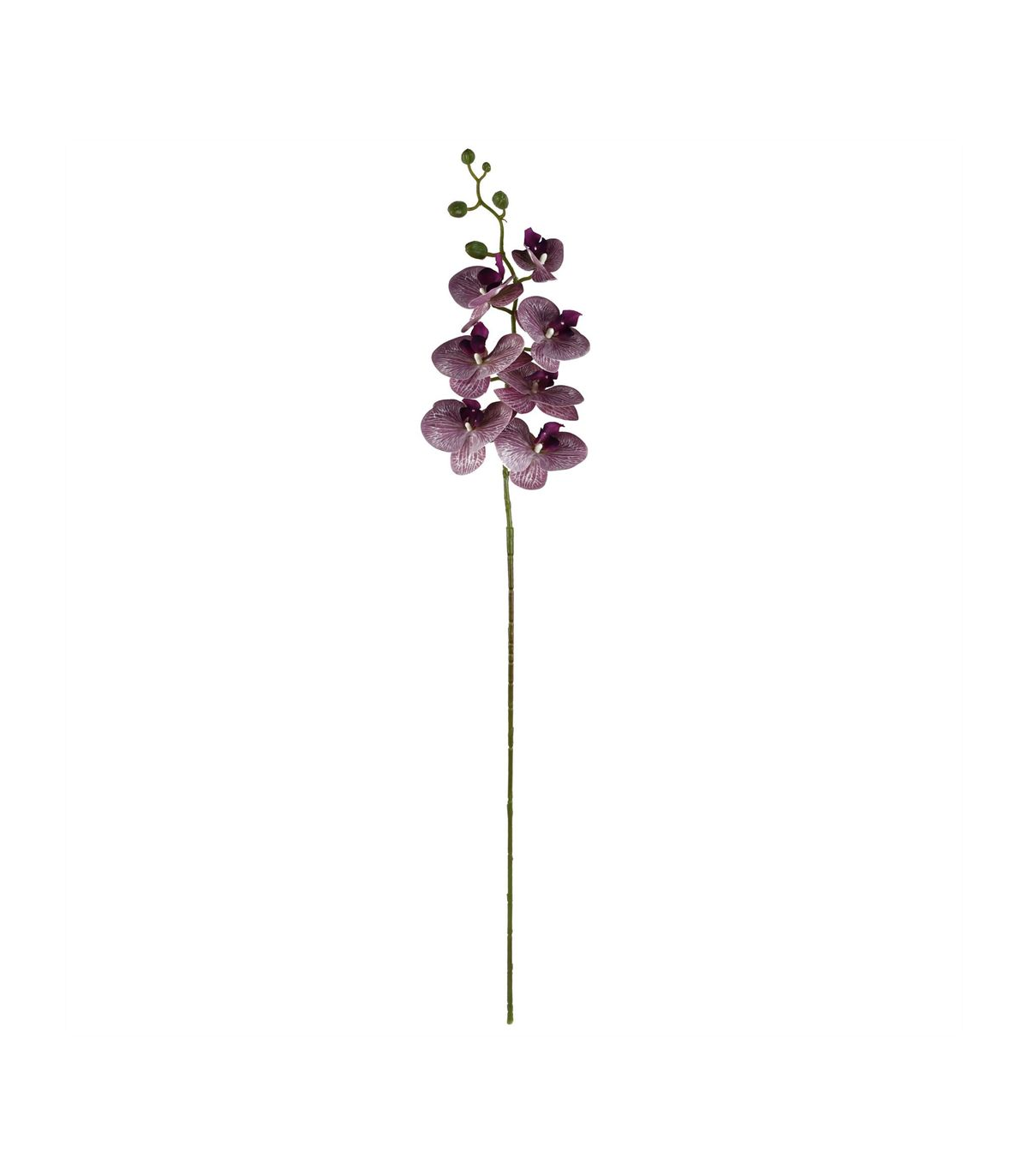 Pack of 6 x Purple phalaenopsis orchid artificial flower stems. Can be used to make arrangements with our other artificial flowers or as decorations on their own. Each stem measures 100cm overall height x 16cm wide x 10 deep and has 7 flowers. The stems are wired so these can be shaped and bent to arrange. These are easy to cut down shorter using a pair of wire cutters if required. Some of our photos show vases to give an idea of size and possibilities for arrangement but no vases or planters are included with these flowers.
